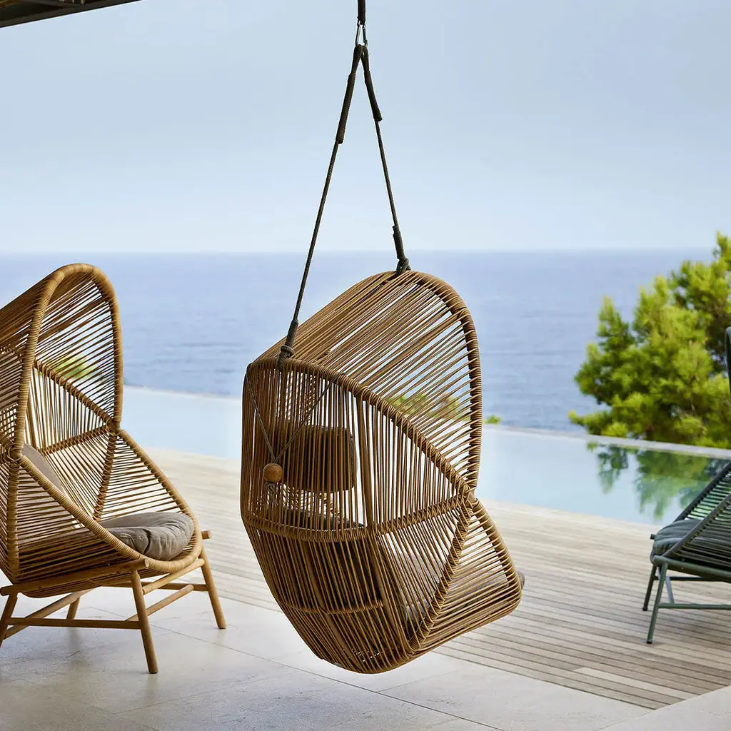 Hive chair is a sculptural silhouette, which can easily be the focal point in any outdoor space, either alone or in a group. It is designed by the Danish duo Foersom + Hiort-Lorenzen MDD. Hive is inspired by the beehive shape offering an embracing structure and design for you to have a haven for focus, reflection and relaxation. Hive is made from the weather-resistant Cane-line Weave ® in an artistic and transparent wicker pattern. You can choose to hang the chair up with a strong rope or place it on a solid base, which comes in teak and aluminium. The Hive chair comes with comfy cushions, and an adjustable neck cushion to provide maximum comfort. The cushions include QuickDry + Airflow system, ensuring you have dry cushions approximately 1 hour after a downpour.