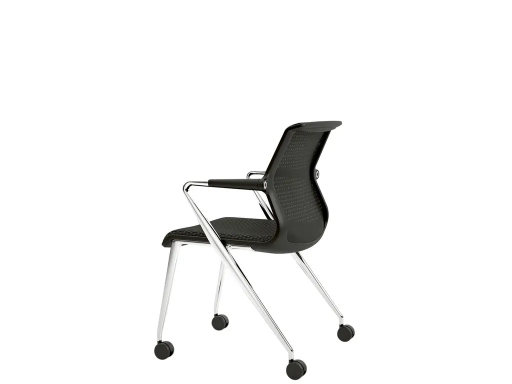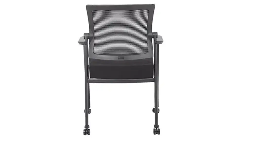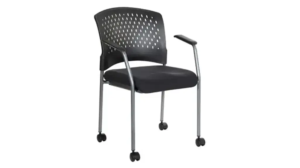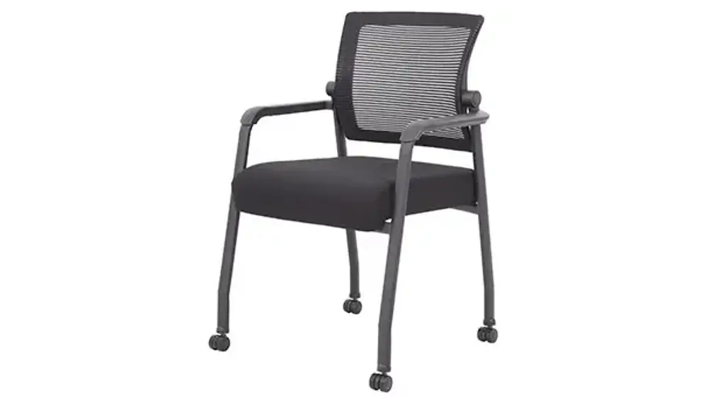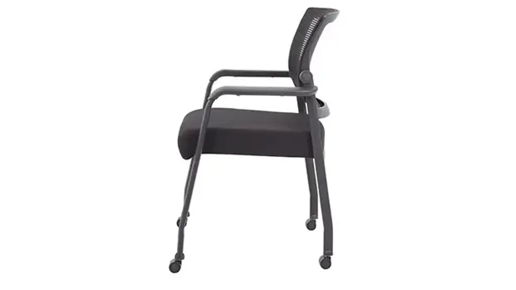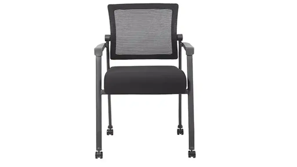 The linear mesh guest chair with casters, in black, is the perfect addition to any training room, conference room or private office environment. The chair is at a fixed height with fixed arms and is designed with an upholstered seat and a breathable, airy mesh back. The unique pivot function of the mesh back provides max comfort and support. It has a steel tubular frame with hooded double wheel casters that allow smooth movement across many flooring surfaces. The black chair adds a modern, professional appearance to any space and has a weight limit of 275 lbs. Ships ready for easy assembly.