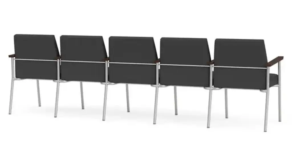 The Mystic 5 seater with center arms with its refined, tapered back and striking geometric arm design will give your space a clean, contemporary look. Features include sturdy steel construction, solid hardwood armrests with durable lacquer finish, and a comfortable Matrex seat support system. Sturdy steel construction with durable powder coat finish in silver or black. Solid hardwood armrests with durable lacquer finish in Natural Maple or Riftwood Walnut. Several Polyurethane upholstery options. 300 lb weight capacity per seat. Overall Dimensions: 111.5" W x 25" D x 35" H. Ships ready for easy assembly.