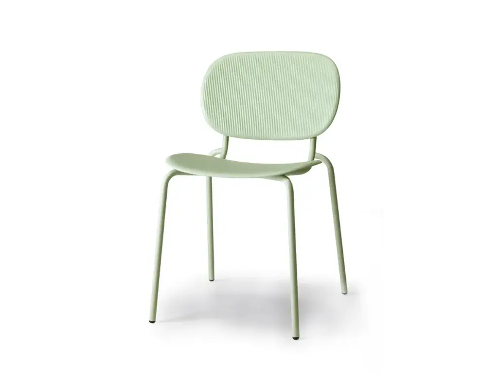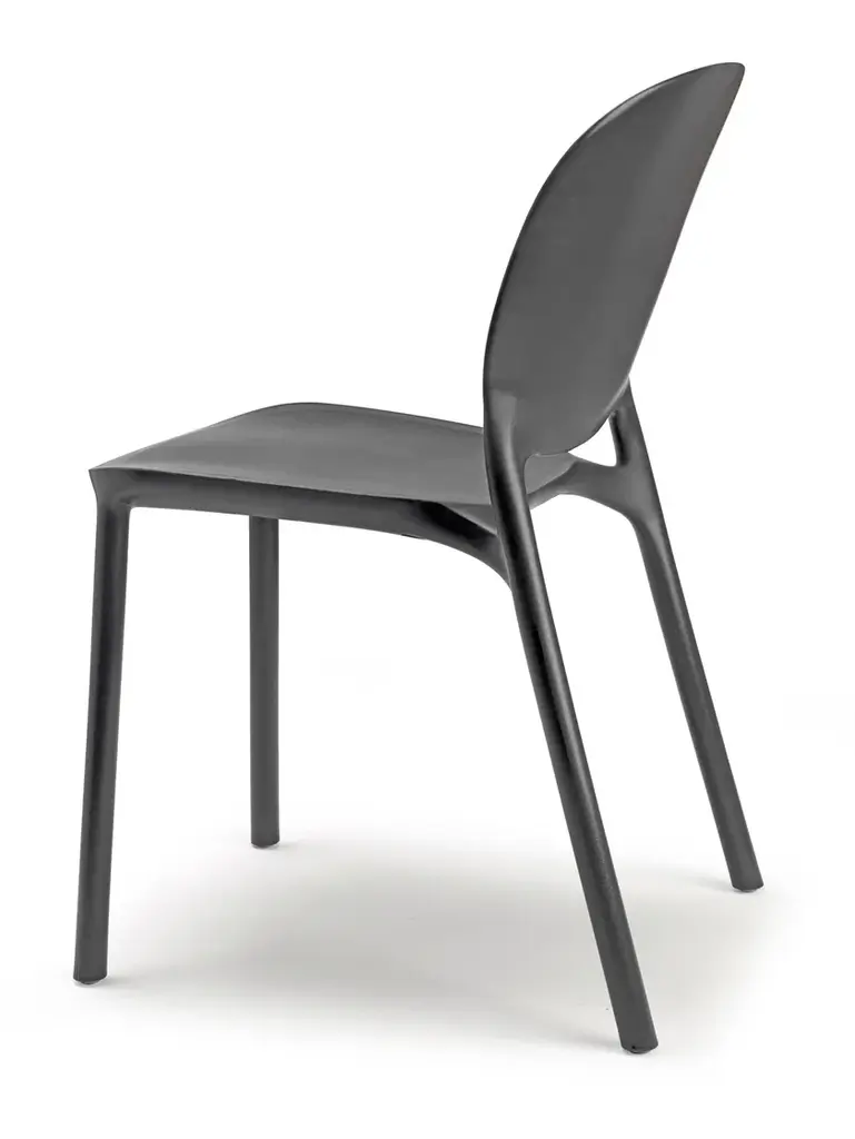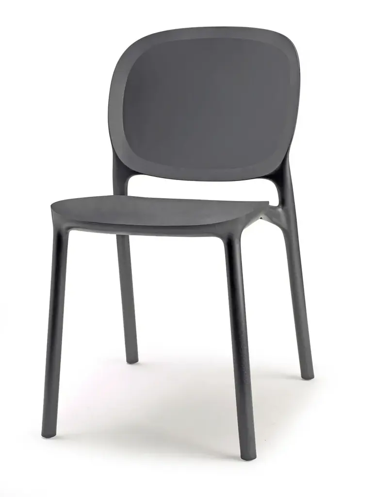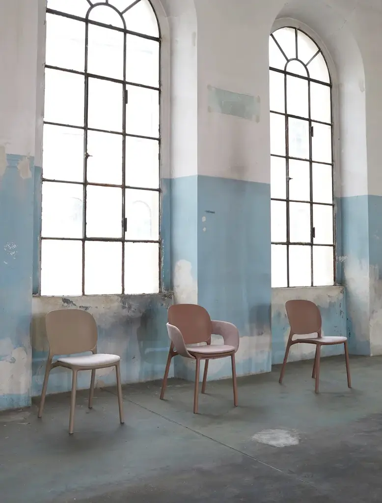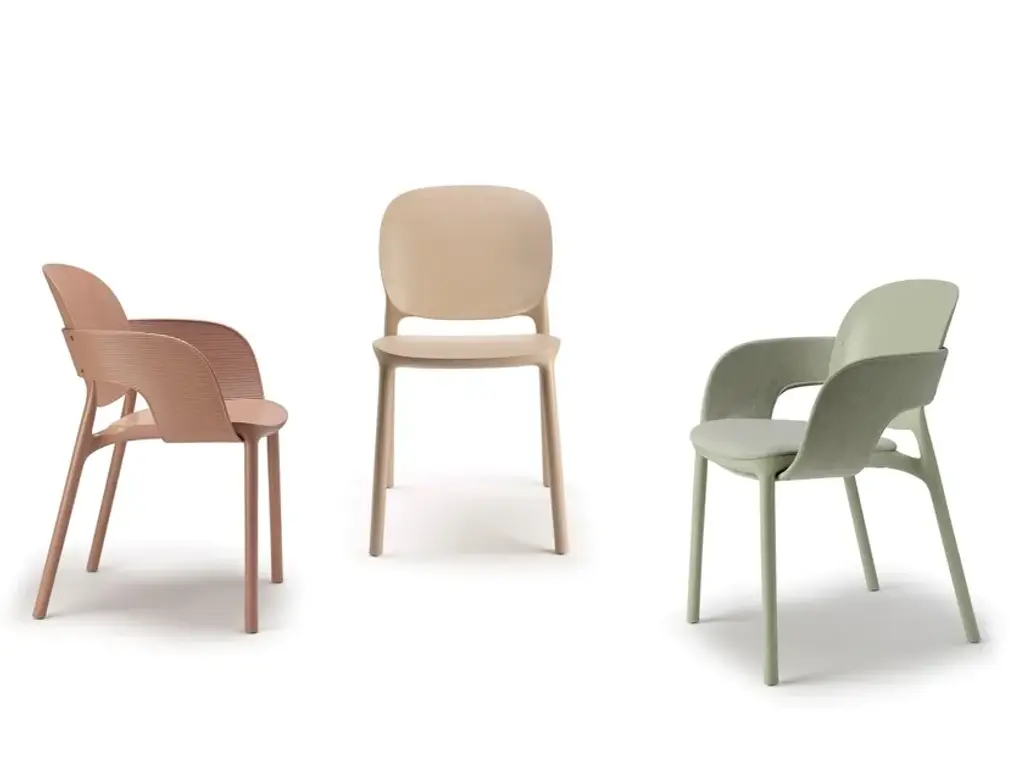 Hug is a stackable polypropylene garden chair.An extremely distinctive element has been designed for HUG chair and armchair: between seat andback, which have rounded and balanced shapes for best usability, the designers have introduced aband element, enveloping like an embrace. A luxury to be enjoyed both outdoors and indoors, following the well-established trend of treating both environments with the same aesthetic codes. Two variants are available: you can opt for a version entirely in techno polymer that is particularly graphic and beautiful to look at from every perspective, defined by an all-over embossed striped motif along the band; or a more graceful one, with the addition of a seat cushion and padded band covered in fabric, to increase the effect of enveloping comfort.The designers declare “The HUG collection represents the consolidation of the collaboration between Meneghello Paolelli and S•CAB. It is a complex and ambitious project, a project that started from theorigins of the company, a monocoque chair, and which comes to deal with real issues of usability and sustainability which represent today's society.”HUG is technically a technopolymer monocoque, but it is actually a flexible system in which the components combine to create different chair and armchair configurations. Designed for theoutdoors, it also fits well in interior spaces, with the possibility of covering some of its parts withfabric. The concept of this chair comes from the balance between the two key elements: seat and back.Two equivalent soft shapes, dimensionally related to each other, in perfect balance. The structureis built around them, an organic continuity uniting these two parts.The introduction of the band creates a bridge between seat and back, a discreet connection thatsubstantially transforms the chair, thus creating a new product. The chair is enveloped in a real andproper hug, which changes its aesthetics and functionality: an original shell defines the armchair.