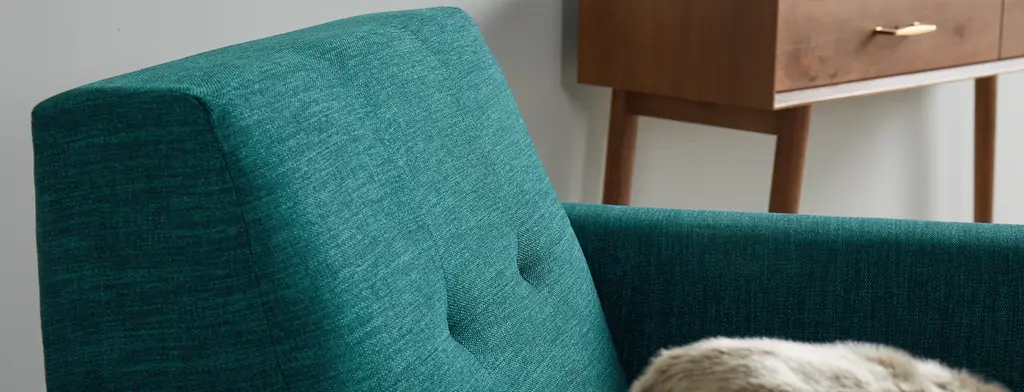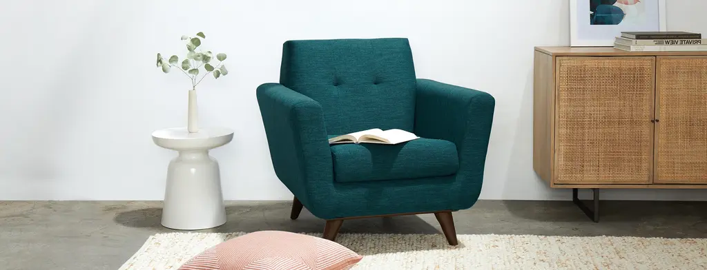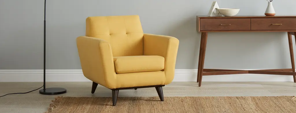 A compact burst of Mid-Century sophistication, the Hughes Apartment Chair brings retro charm to every small space lounge or book nook. Button tufting, supportive cushions, and sleek lines truly set this conversation-starter apart, fitting Mid-Century style and supportive comfort into one petite silhouette.