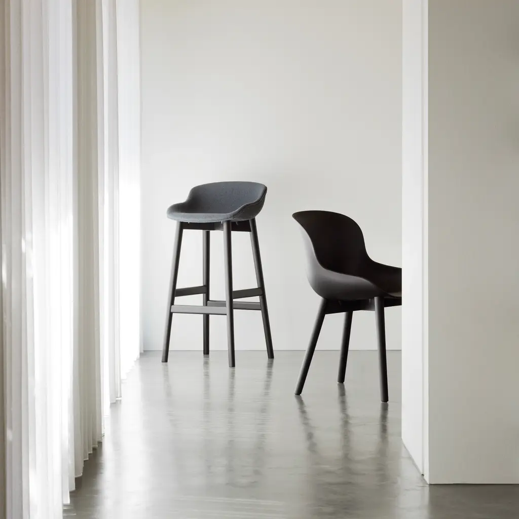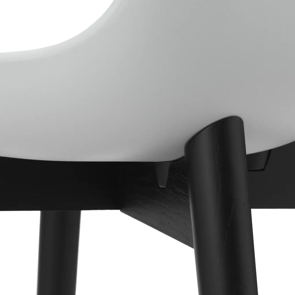 A wooden base brings an organic dimension to Hyg's embracingly sculpted contours with an ample seat and slightly higher curving sides. Designer Simon Legald's shell chair in pressed polypropylene has notably generous proportions that allow for a wide range of relaxed seating postures. Inspired by the Danish ideal of hygge, a feeling of contentment lingers in both the visual experience of the design and overall comfort.