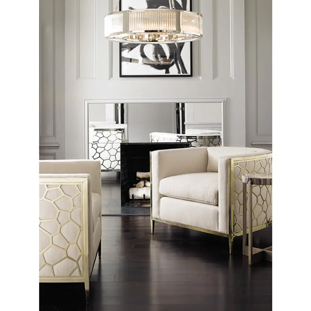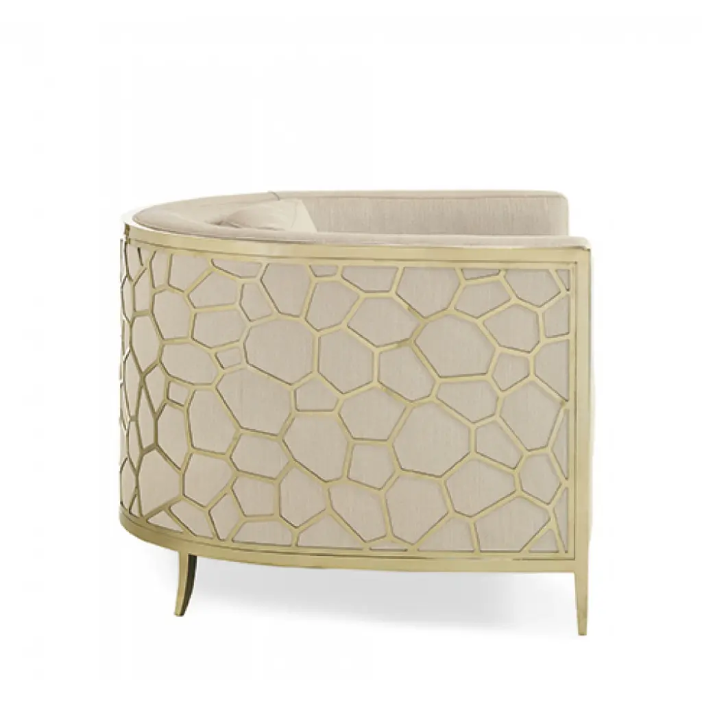 Get the party started with a chair they’ll be talking about long after they leave. We design our product with our clients’ satisfaction in mind. Custom engineered frame wrapped in a Gold Bullion metal tone. A micro-herringbone pattern in off-white linen-blend fabric offers simplistic beauty.