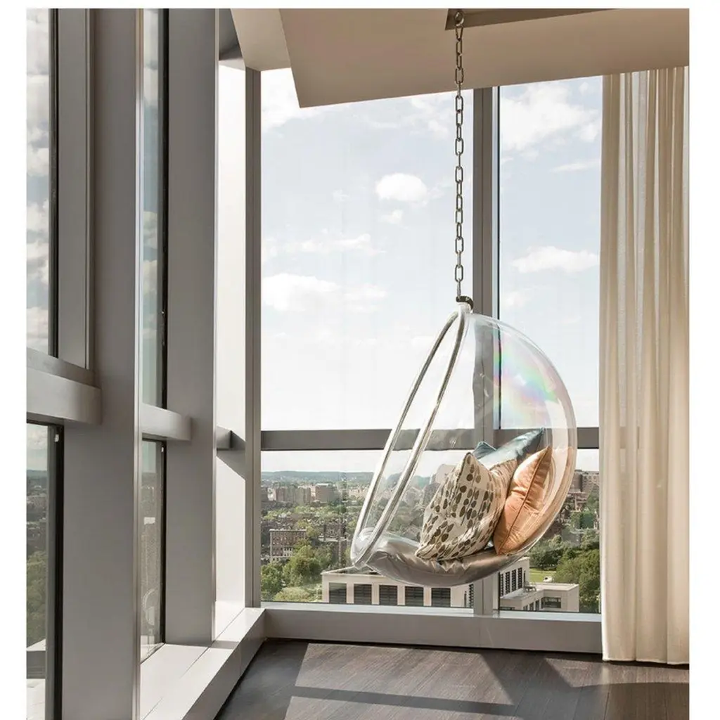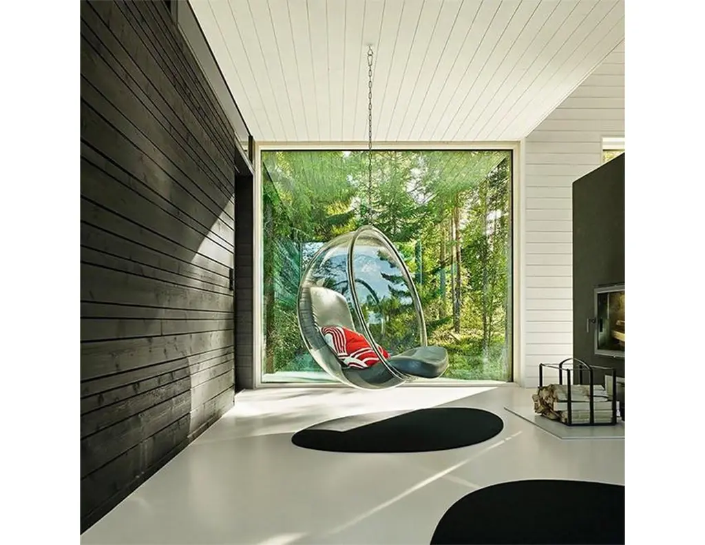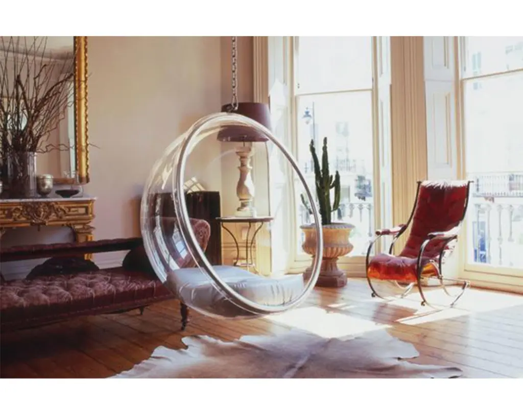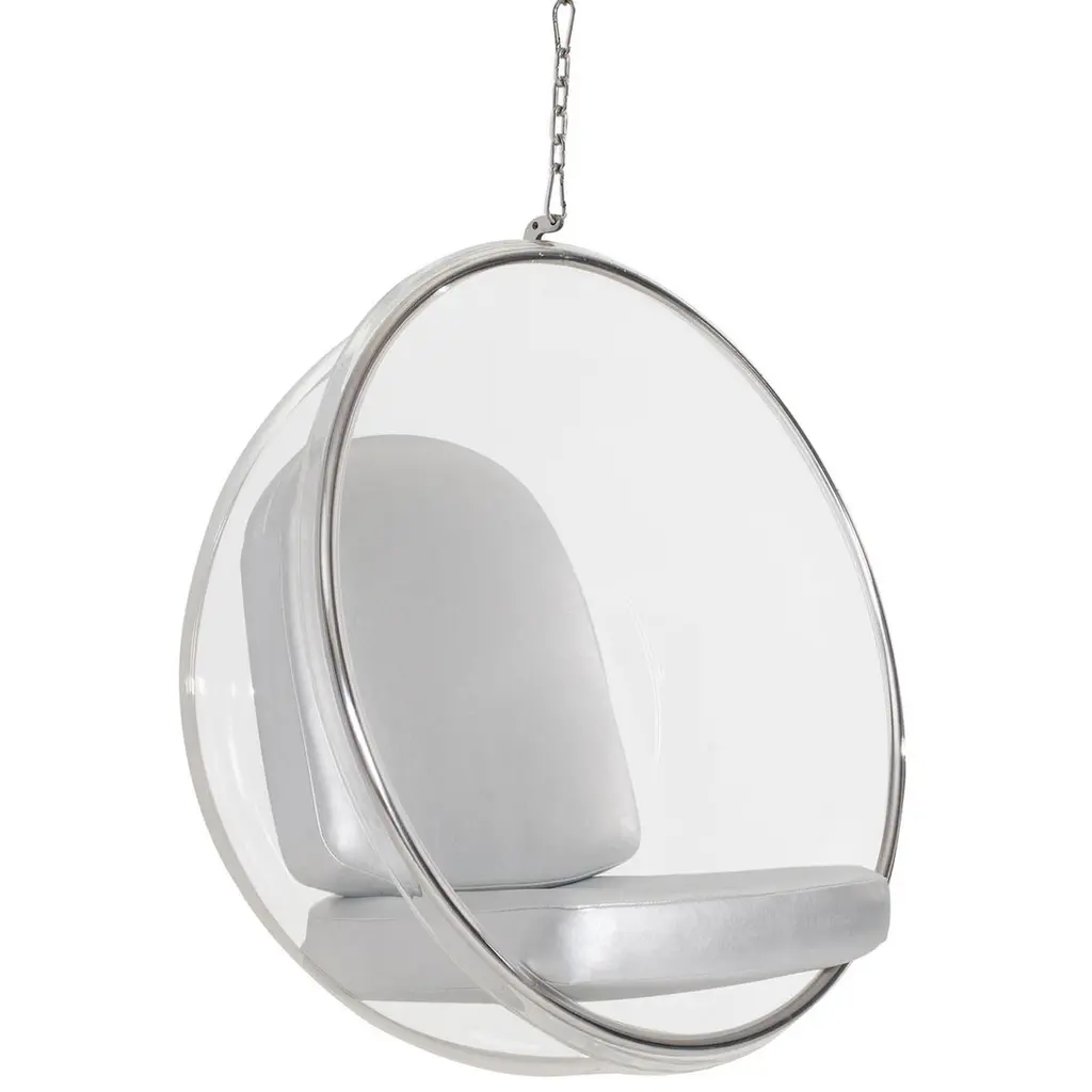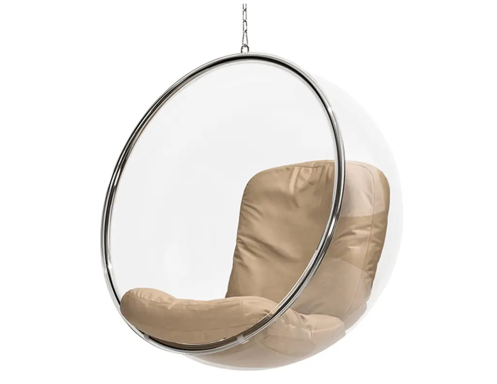 The Bubble chair was designed by Eero Aarnio in 1968. According to Eero’s notes, the Bubble hangs from the ceiling because ‘there is no nice way to make a clear pedestal.’ It shares the same unique acoustics as the Ball chair, a little cocoon that shields off the outside world.The hanging Bubble chair is made from acrylic and solid stainless steel, and is available in four different leather options by Sørensen Leather.We are happy to provide you leather samples to help you decide the perfect color for your Bubble. Dimensions: 103 cm width x 90 cm depth x 105 cm heightMaterials: Acrylic, solid stainless steel, natural leatherChain is 2 meters longAs a young boy Eero Aarnio had been fascinated by soap bubbles. In the city he had never made one but fleeing the war to the countryside he remembers blowing huge soap bubbles from a barn. The bubbles would take off with the wind and drift far away to the fields. The image of a field filled with transparent soap bubbles stuck with him.