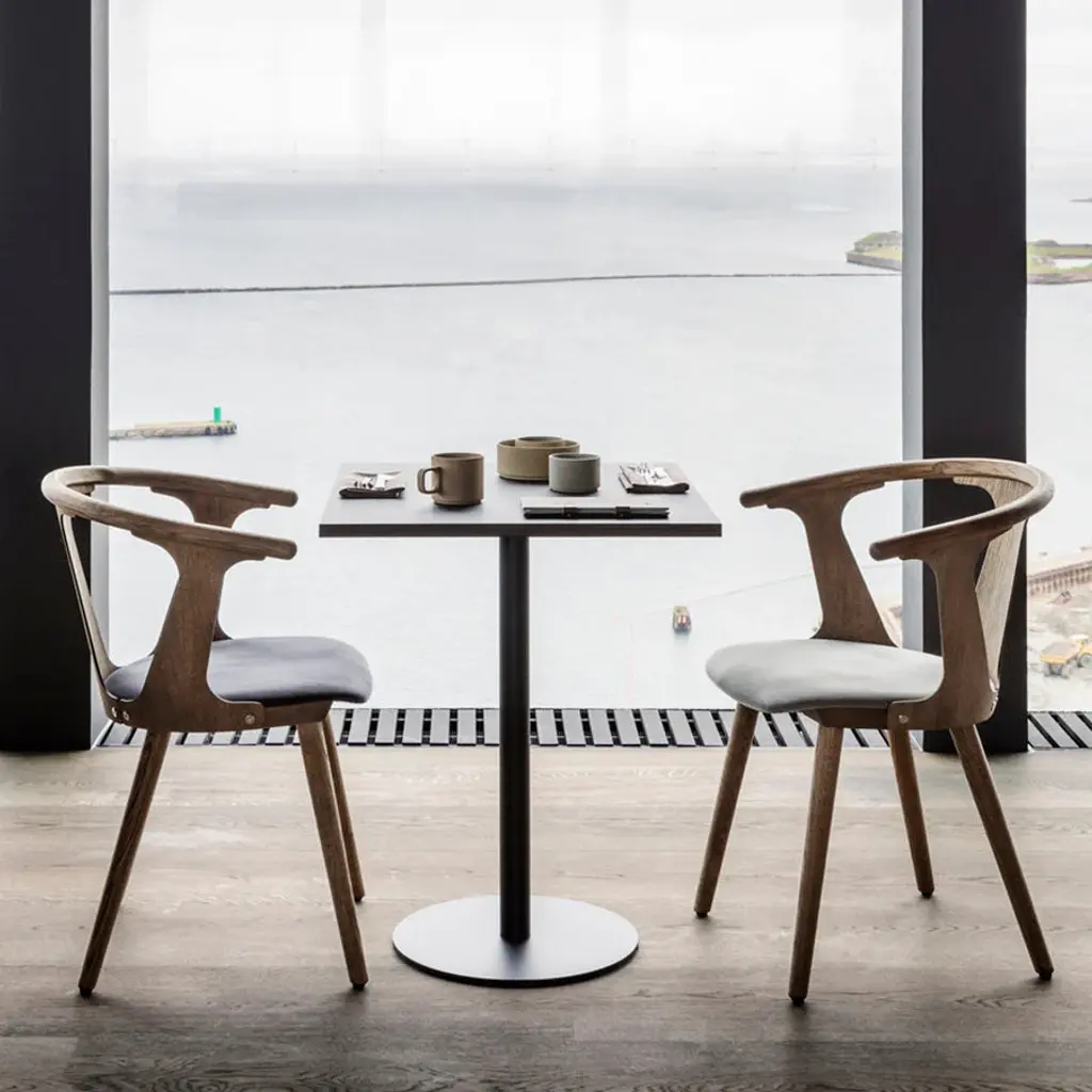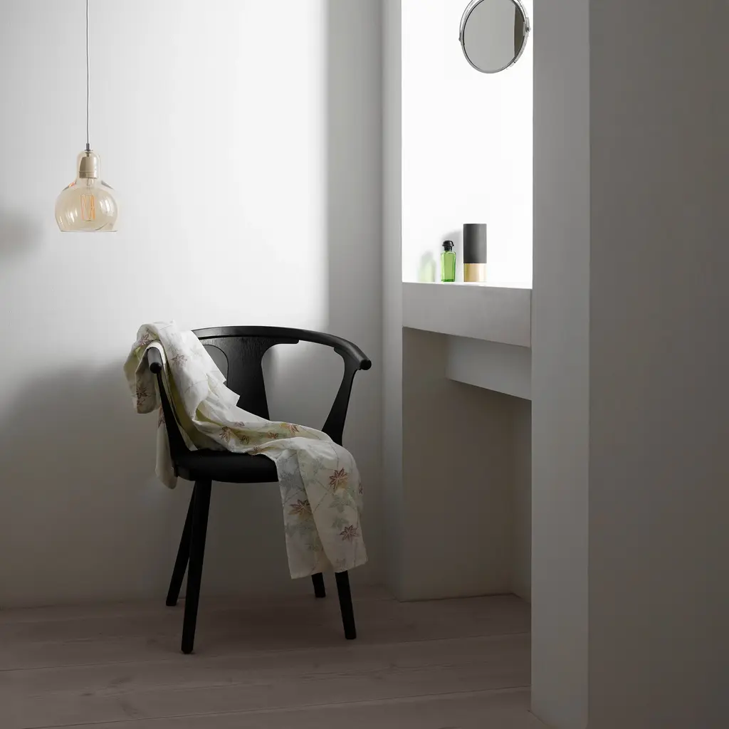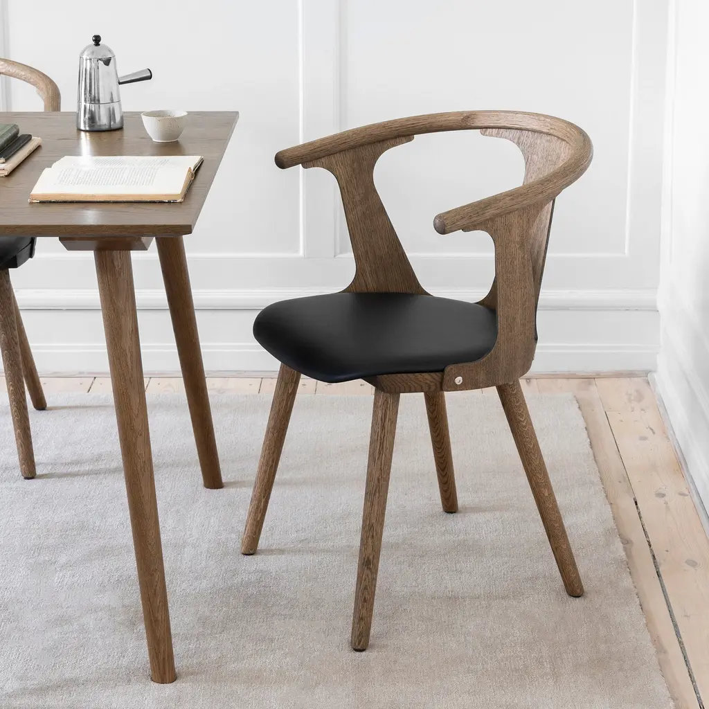 The first wooden chair in &Tradition's lineup, Sami Kallio's head-turning In Between, gets a variation with an upholstered seat for additional comfort without compromising the chair's light and elegant expression. Helsinki-born Sam's design reflects its perfect balance between methods of manufacturing, design and aesthetics. It's produced by way of hand and machine. There is the wood turning, a classic technique using a lathe for greater detail. Compression molding is also applied, allowing for strength despite the lightness of the thin frame. It's no accident that ash and oak, which Sam uses for this chair, respond very well to these techniques. Dynamically angled legs provide balance and equilibrium of form to the low-swung, crescent back, the armrest and very slightly pitched seat pan. The back and side panels offer solid support and a visual interplay of positive and negative space that further illustrates the In Between notion.If the semicircular rail brings to mind that 1949 Danish icon the Wishbone Chair (a.k.a. the Y Chair), Sam freely admits his regard for designer master Hans Wegner. Yet Sam also pushes his In Between forward with a more graphic, modular and lighter form.In Between is part of the "Between Gaps" series by this award-winning designer, who is now based in in Gothenburg, Sweden, and is produced by &Tradition in Copenhagen.