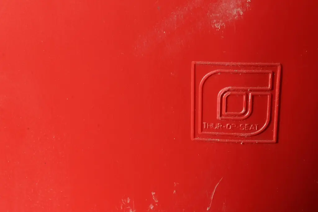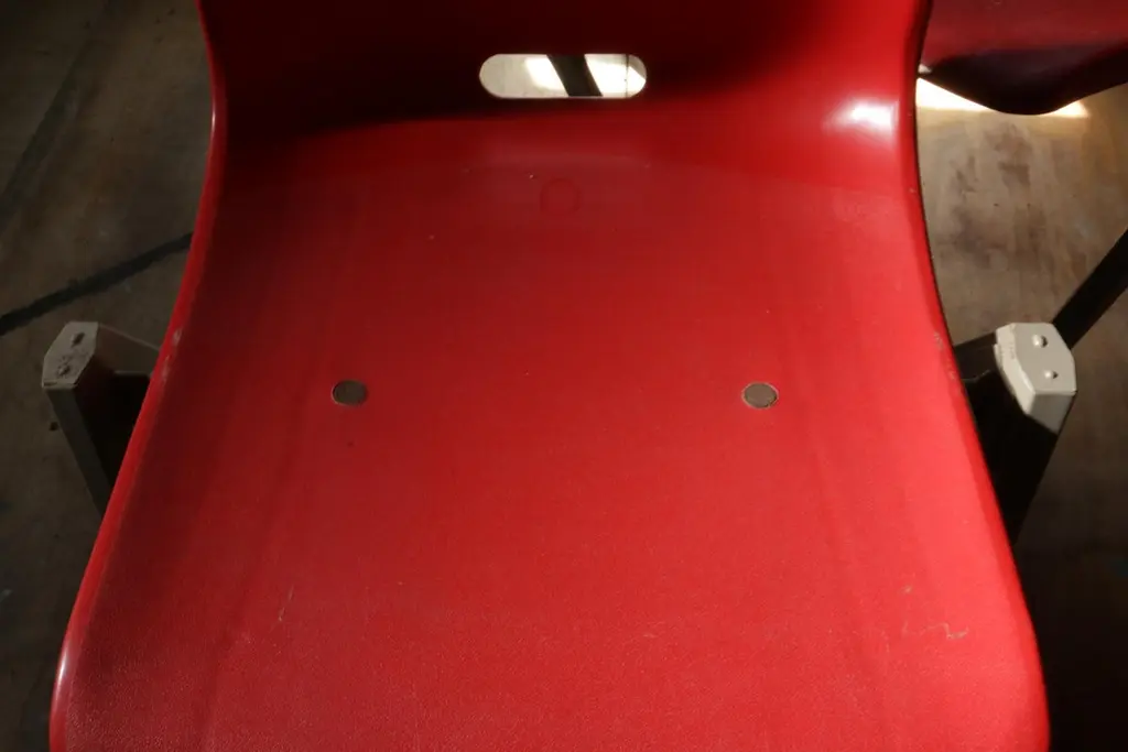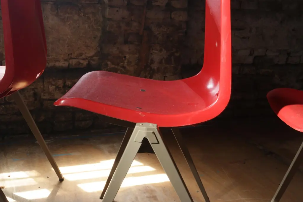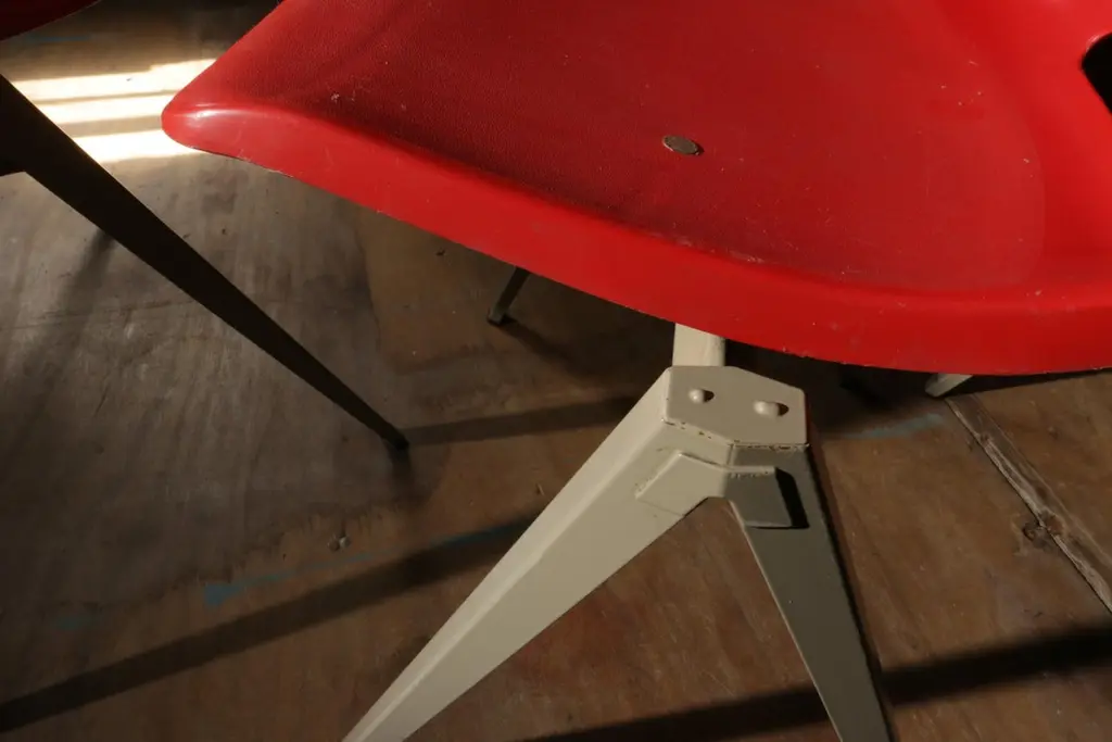 Industrial Galvanitas S22 Compass / Pyramid School chairs from the 1960s.The chair has a light gray coated metal frame, a plastic molded seat with closed shell in a red color.This legs are very easy stack able on each other. In this way you create a fixed row of seats.