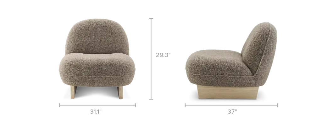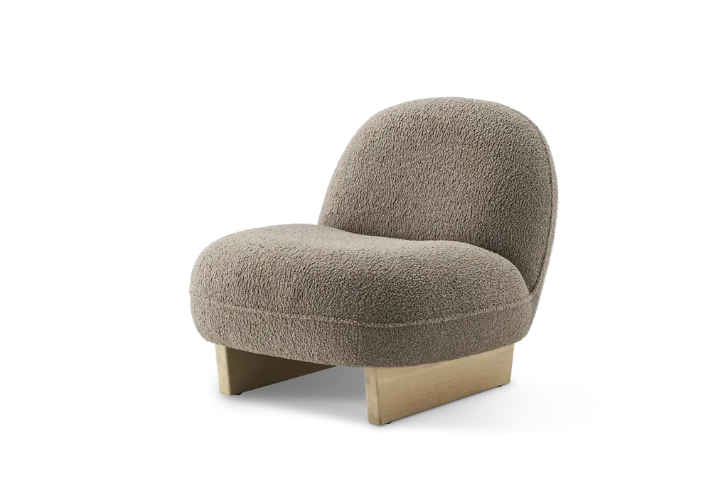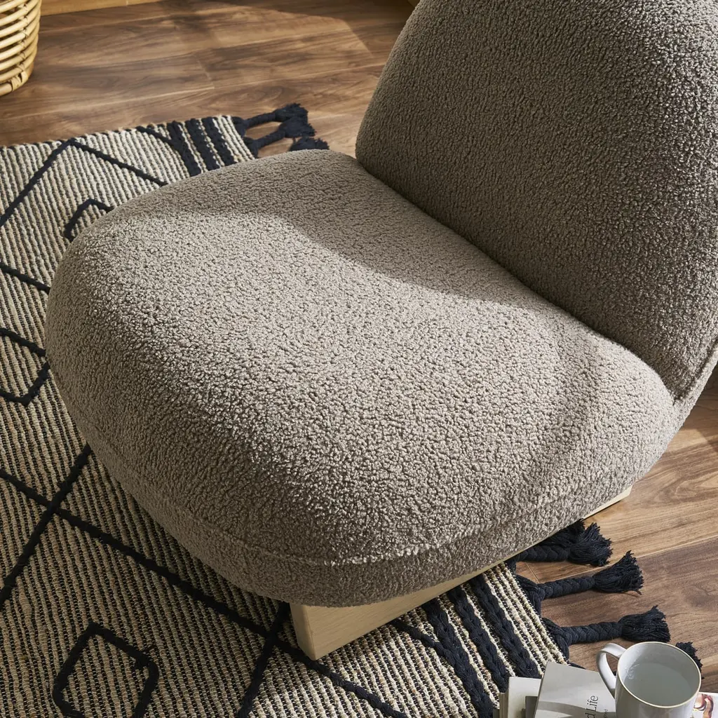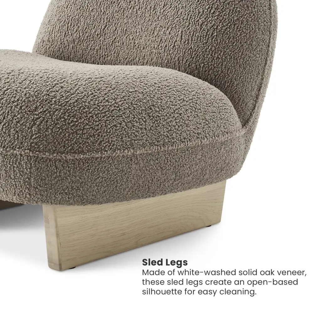 Ingrid is a distinctive piece with a tilted backrest and wooden sled legs. Sit back and unwind on upholstered, cozy sherpa fabric.