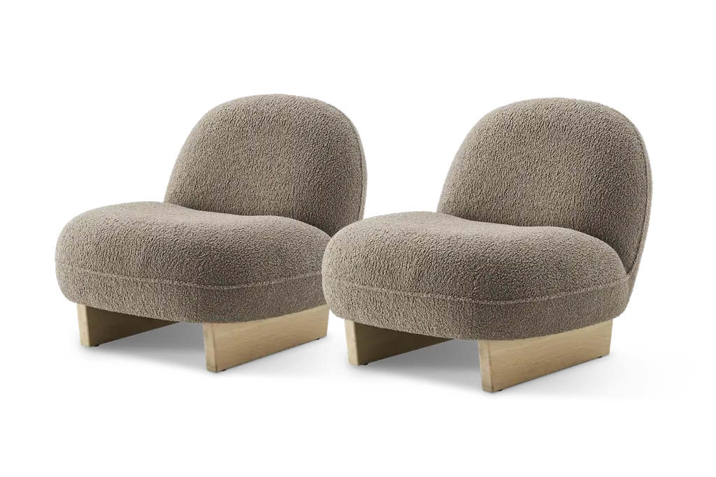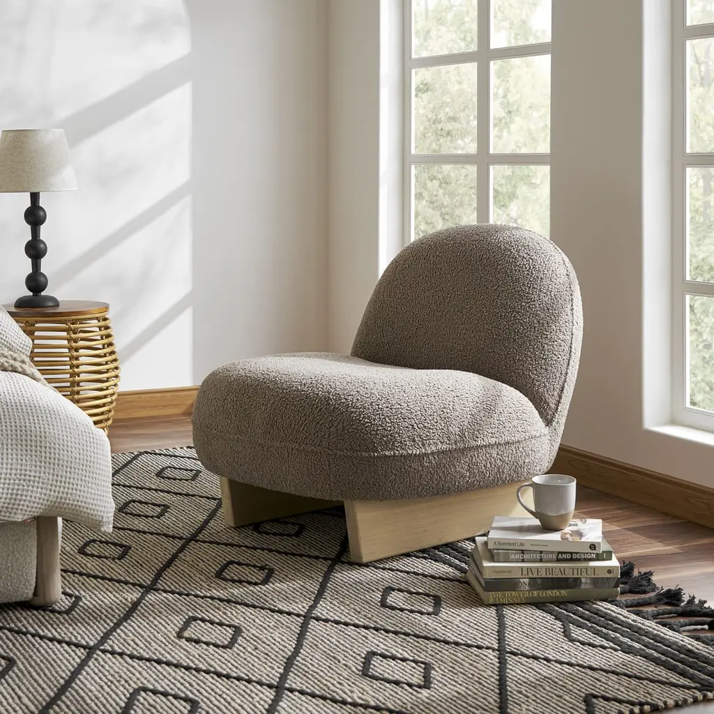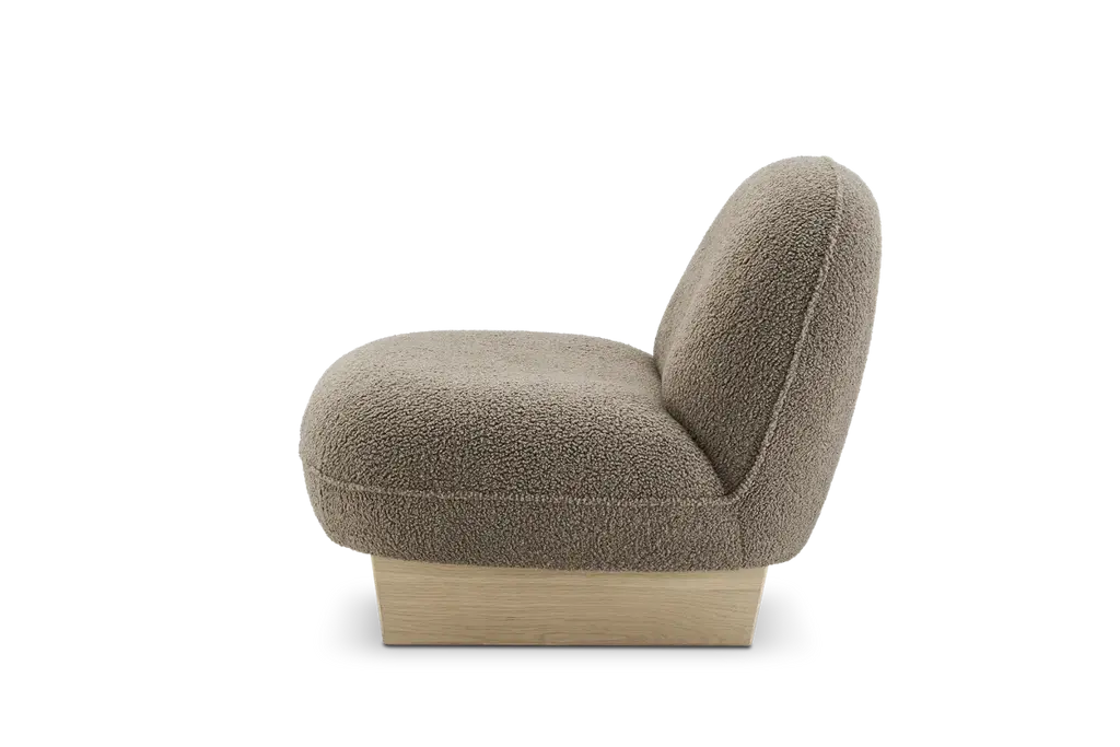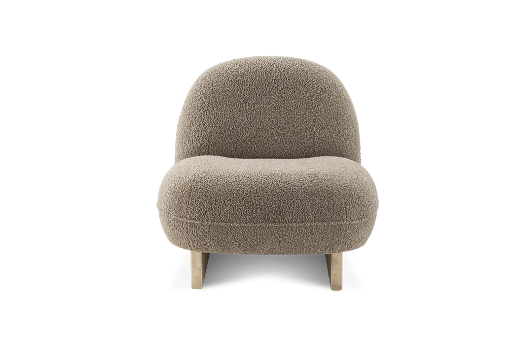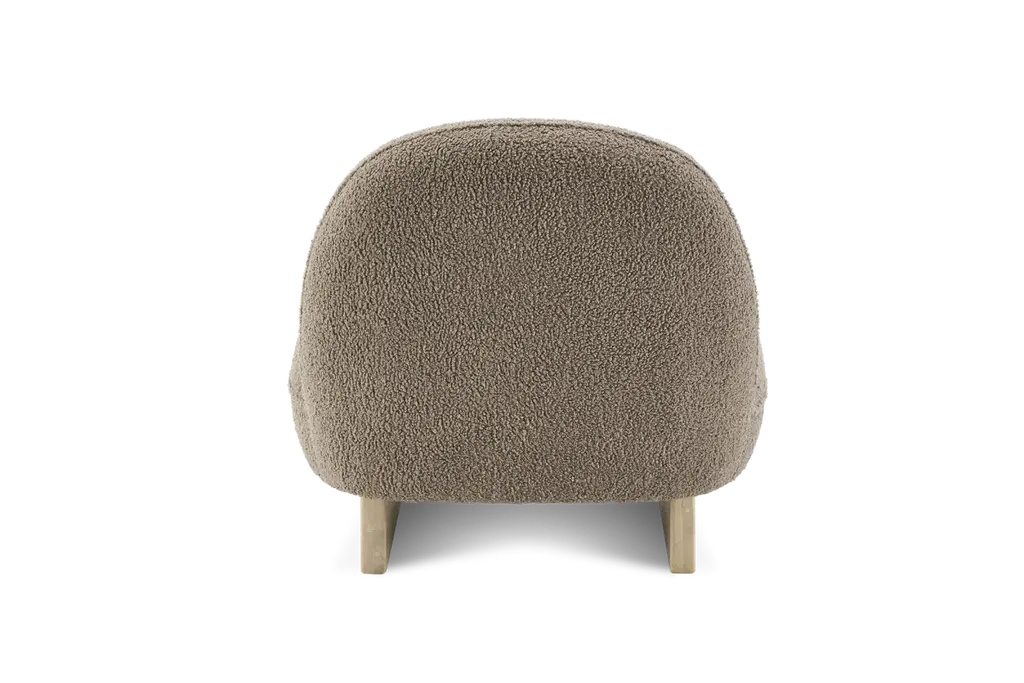 Ingrid is a distinctive piece with a tilted backrest and wooden sled legs. Sit back and unwind on upholstered, cozy sherpa fabric.
