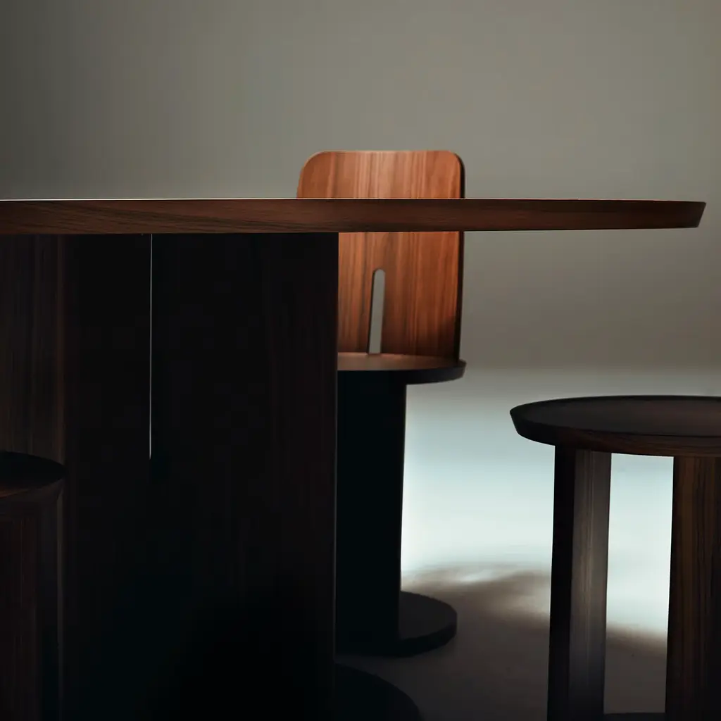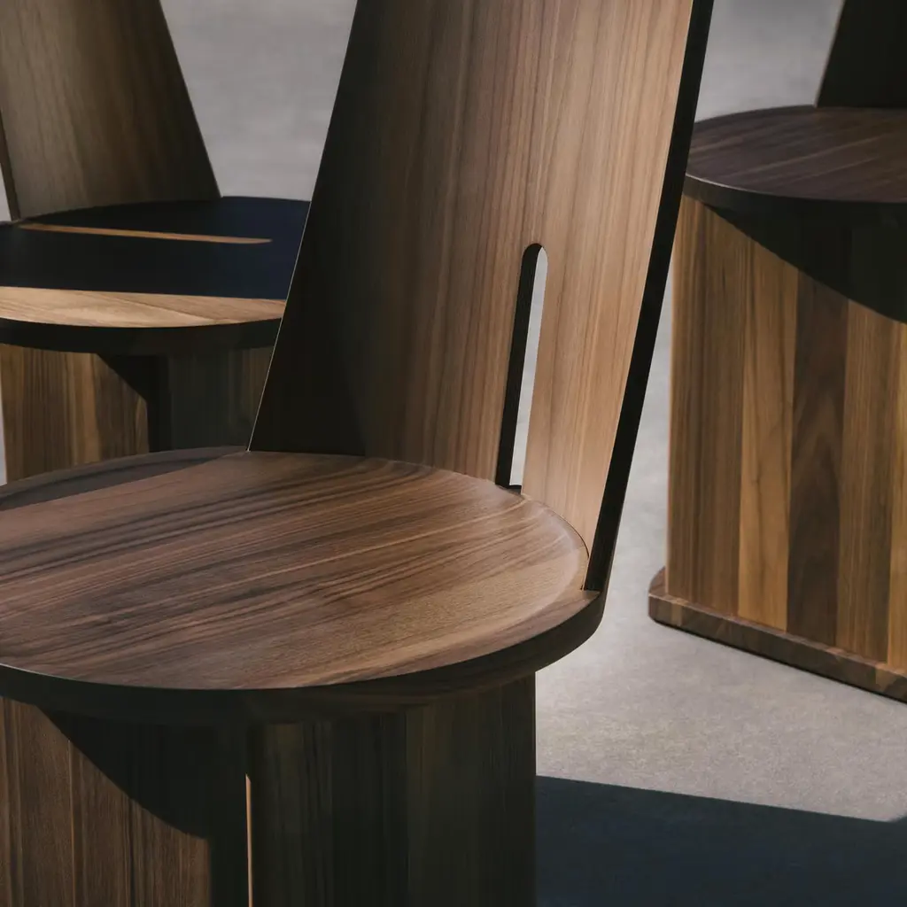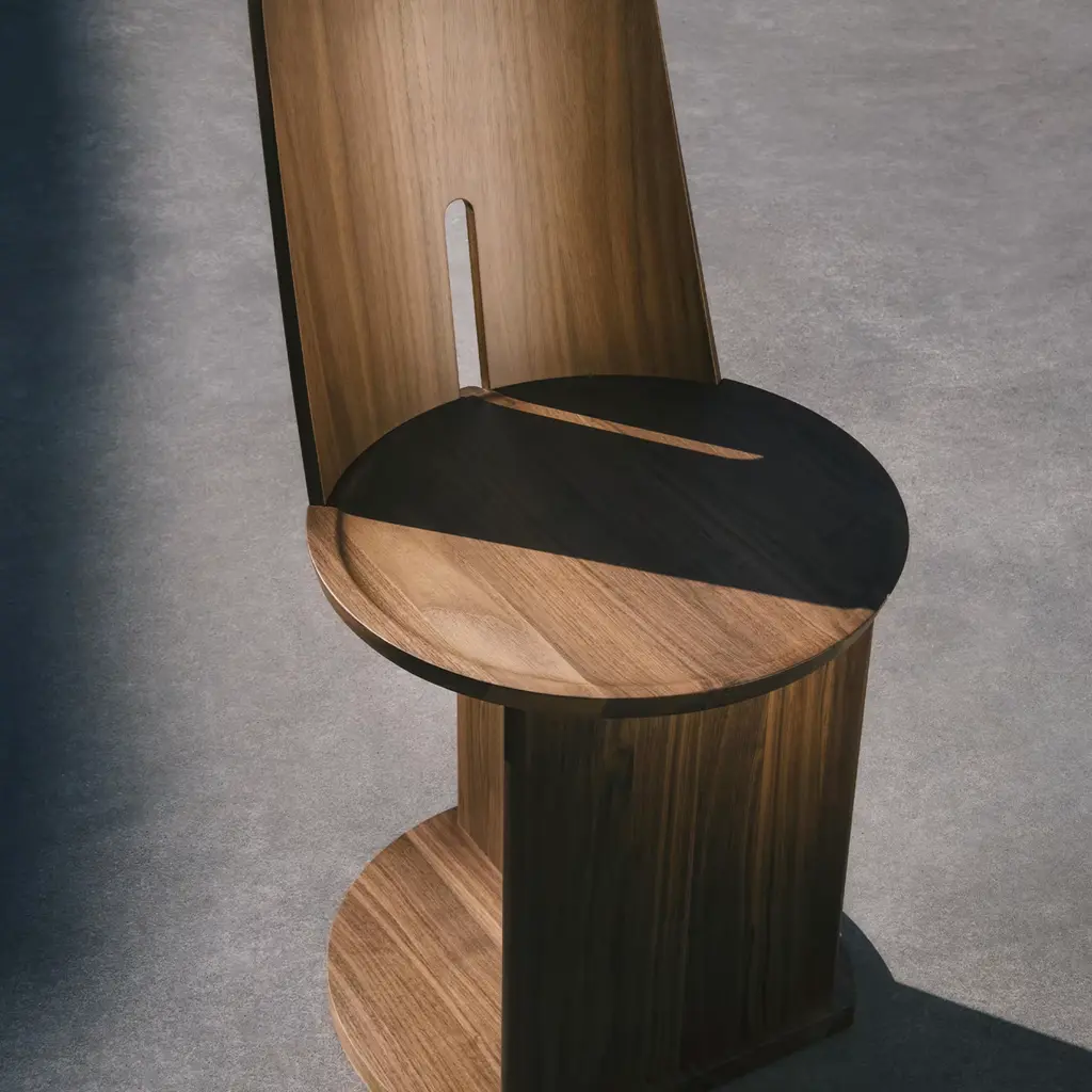 Part of the Intersection collection inspired by monastery life, this sculptural chair, characterized by clean and uncluttered lines, evokes traditional and religious furniture. Made from high-quality walnut wood, despite its simple and austere look, it radiates a certain sense of tranquility and serenity. It is an invitation to focus on what truly matters, on building sincere relationships.