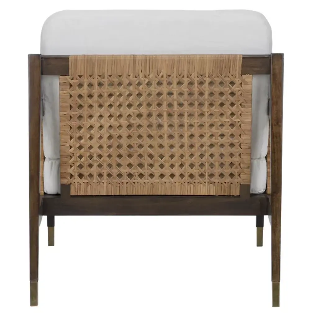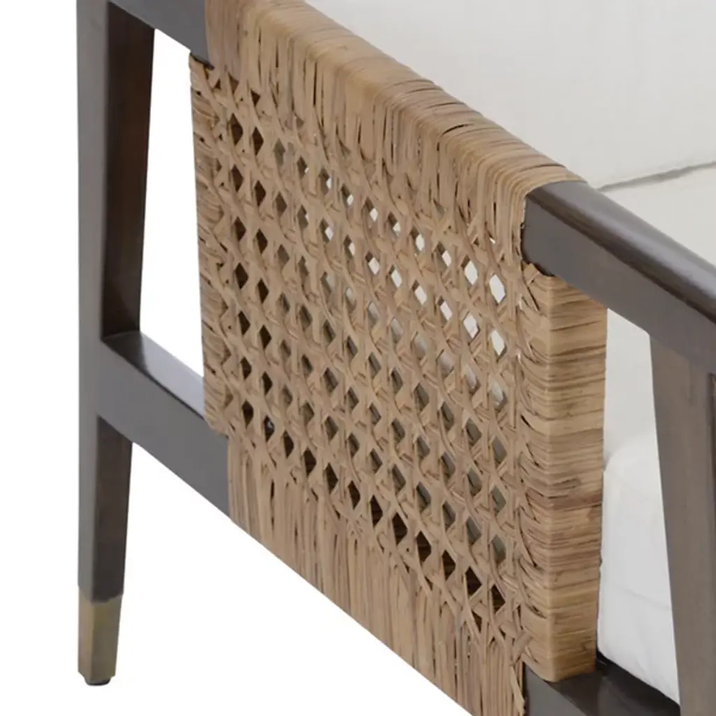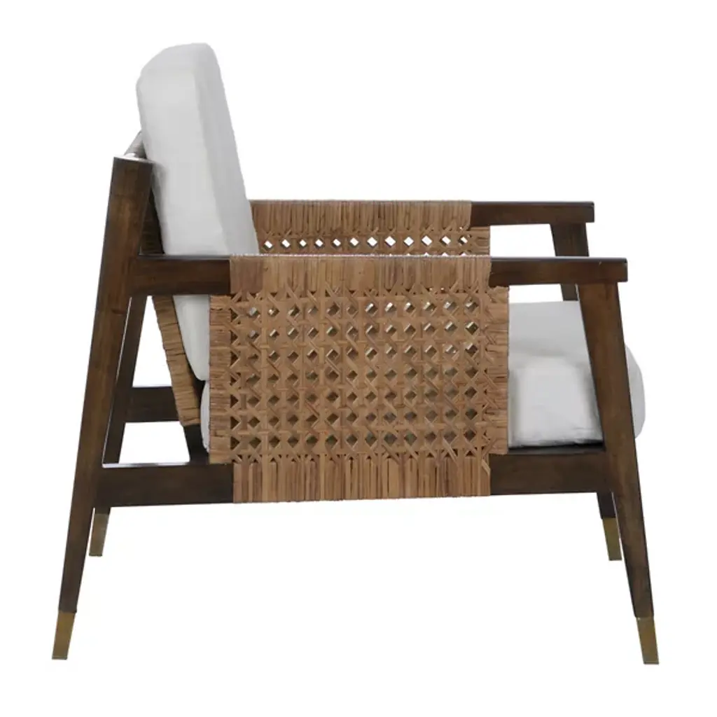 The Isle Of Palms Lounge Chair from Wildwood combines solid gmelina arborea wood with handwoven cane panels that filter light through their open weave pattern. The chair's frame employs traditional joinery techniques, while the cane work adds tropical texture and breathability to the seating experience. Tapered legs narrow gracefully toward brass ferrules that catch and reflect light at floor level. Removable foam cushions in neutral fabric provide comfort while allowing the natural materials to remain prominent. This lounge chair balances structured woodwork with organic cane elements for a relaxed yet polished aesthetic.