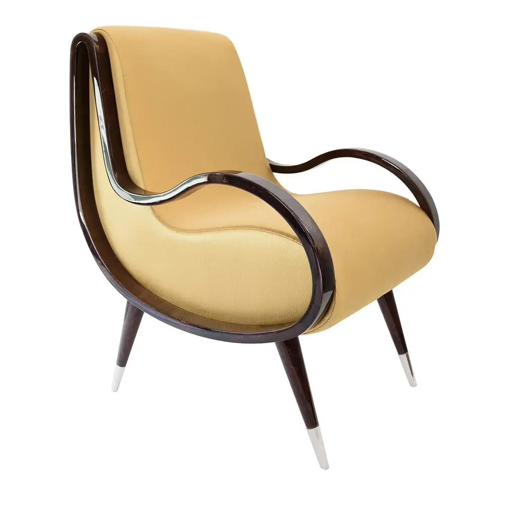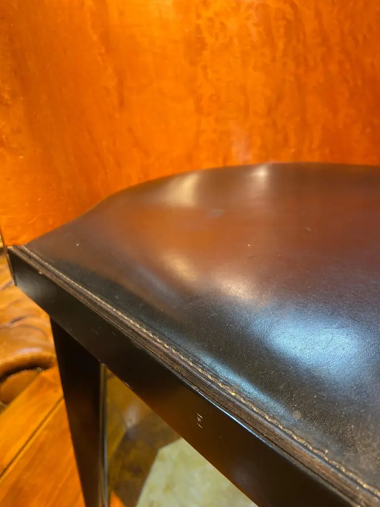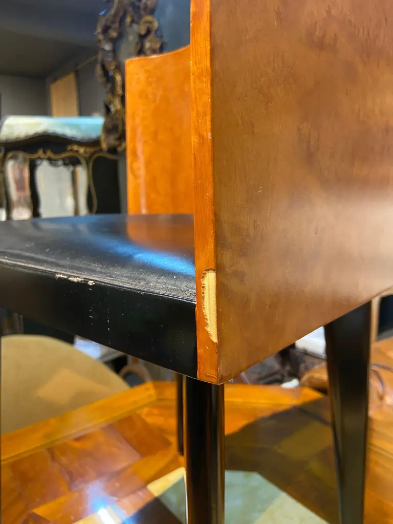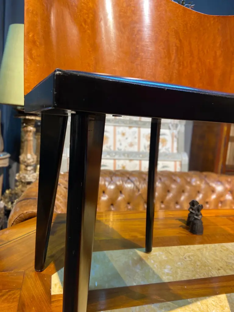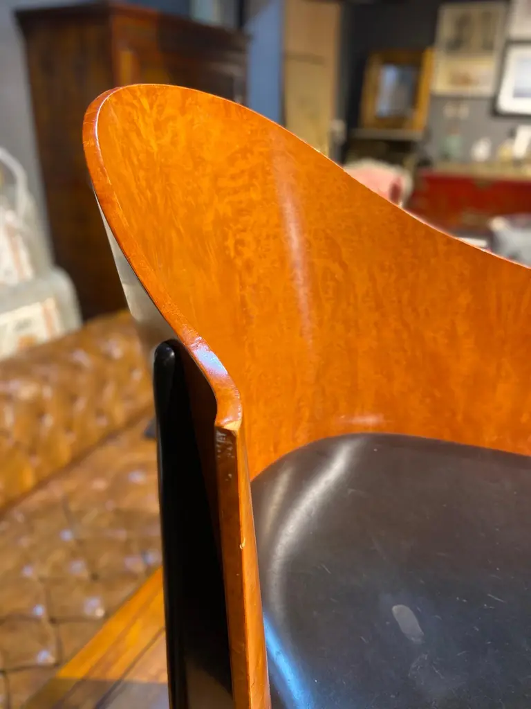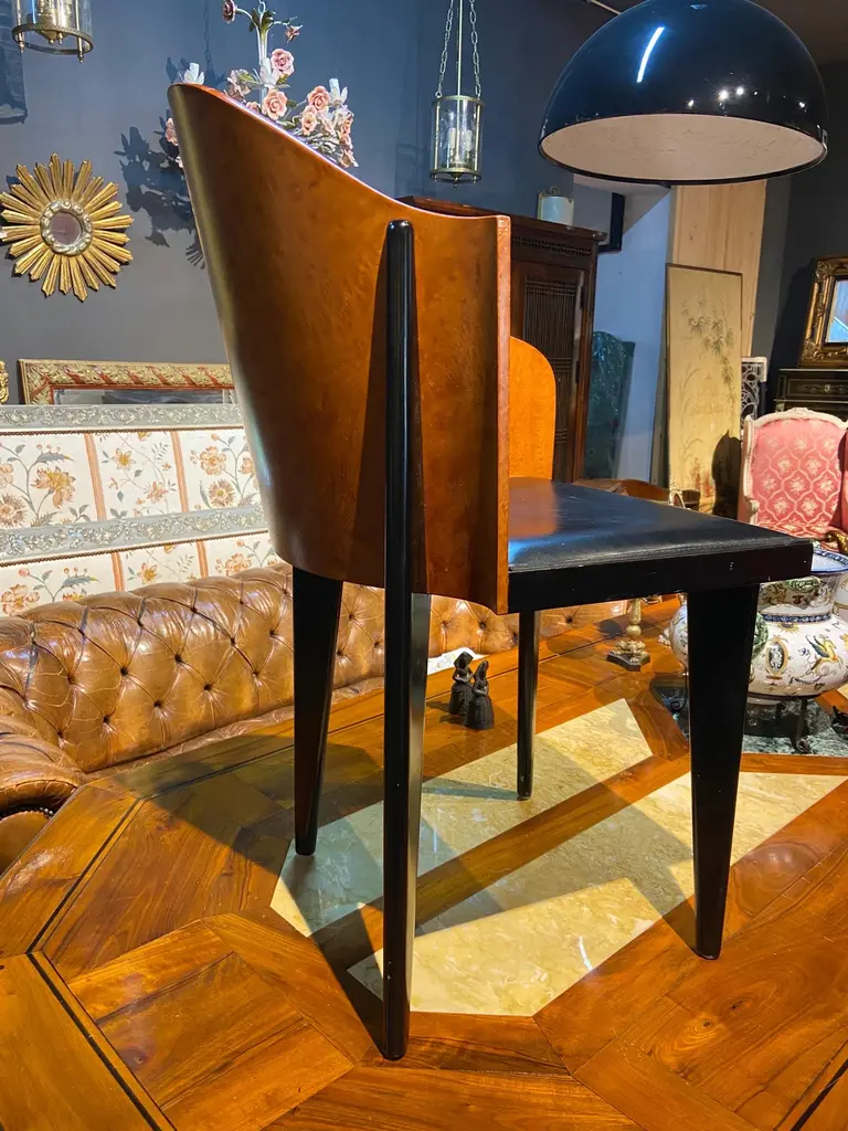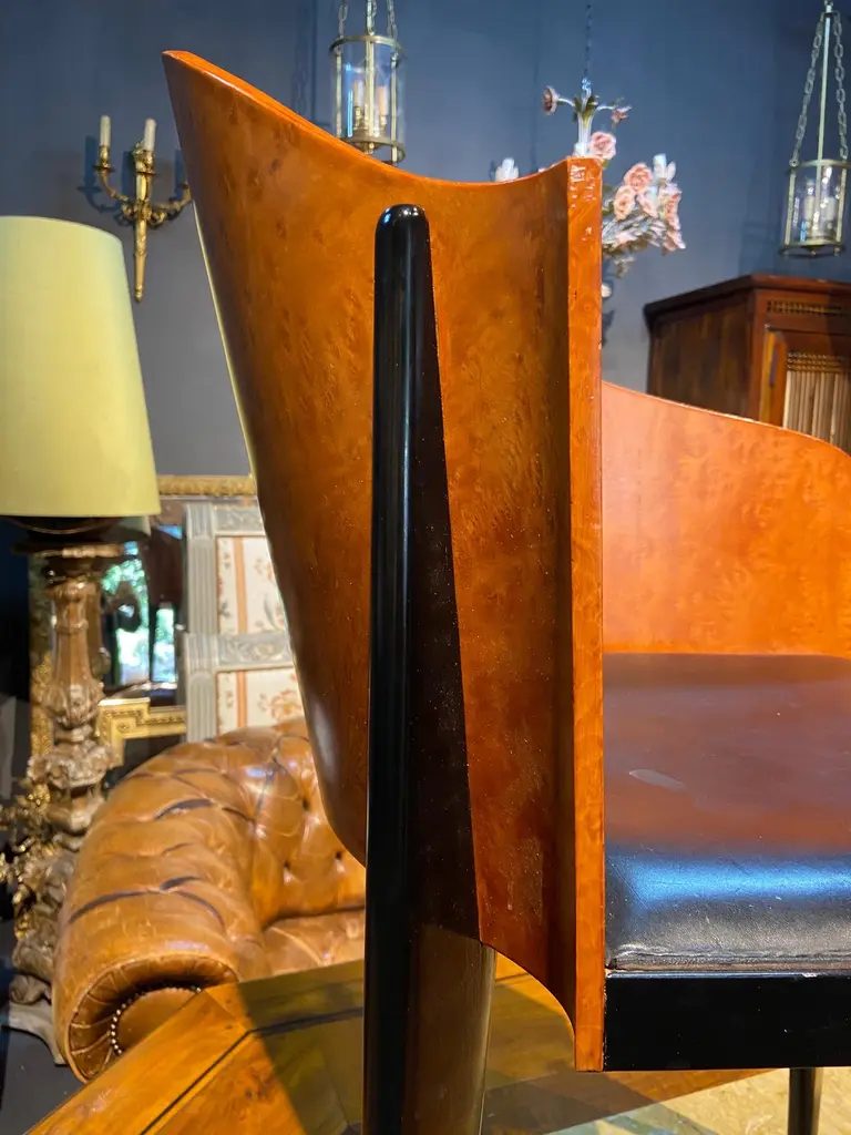 Here we present a single Toscana chair designed by Piero Sartogo for Saporiti in 1986. It feature a curved burl veneer back creating a beautiful biomorphic asymmetrical look. The seat is upholstered in black leather. The chair is in good overall condition and there is only one small crisp that needs a restoration.Italy, late 20th Century.
