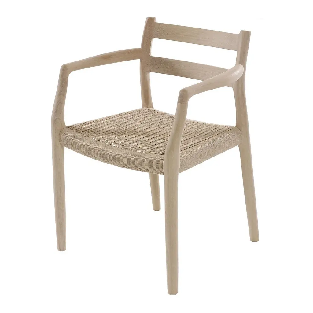 FDB Møbler’s J81 chair, designed by Jørgen Bækmark in 1962, is an attractive wooden spindle back chair based on the 1950s chair collection J80. Featuring an angular frame with distinctive, rounded armrests and back, this solid oak chair is one of the icons of mid-century Danish design. A paper yarn seat complements the natural look of the chair, and its functional form serves many different styles and spaces. The J81 chair shares a similar appearance and materials with other chairs, benches and stools of the J80 collection.