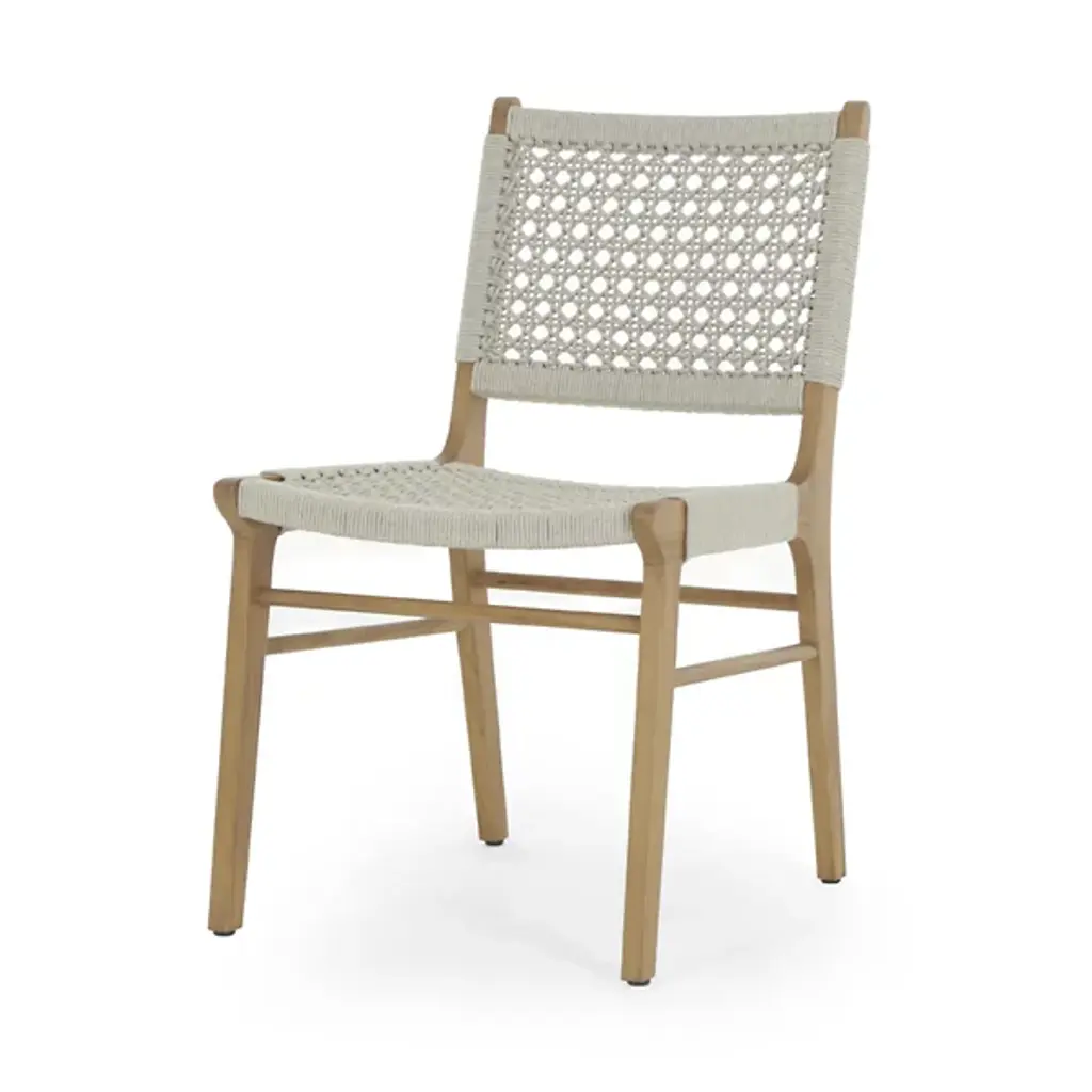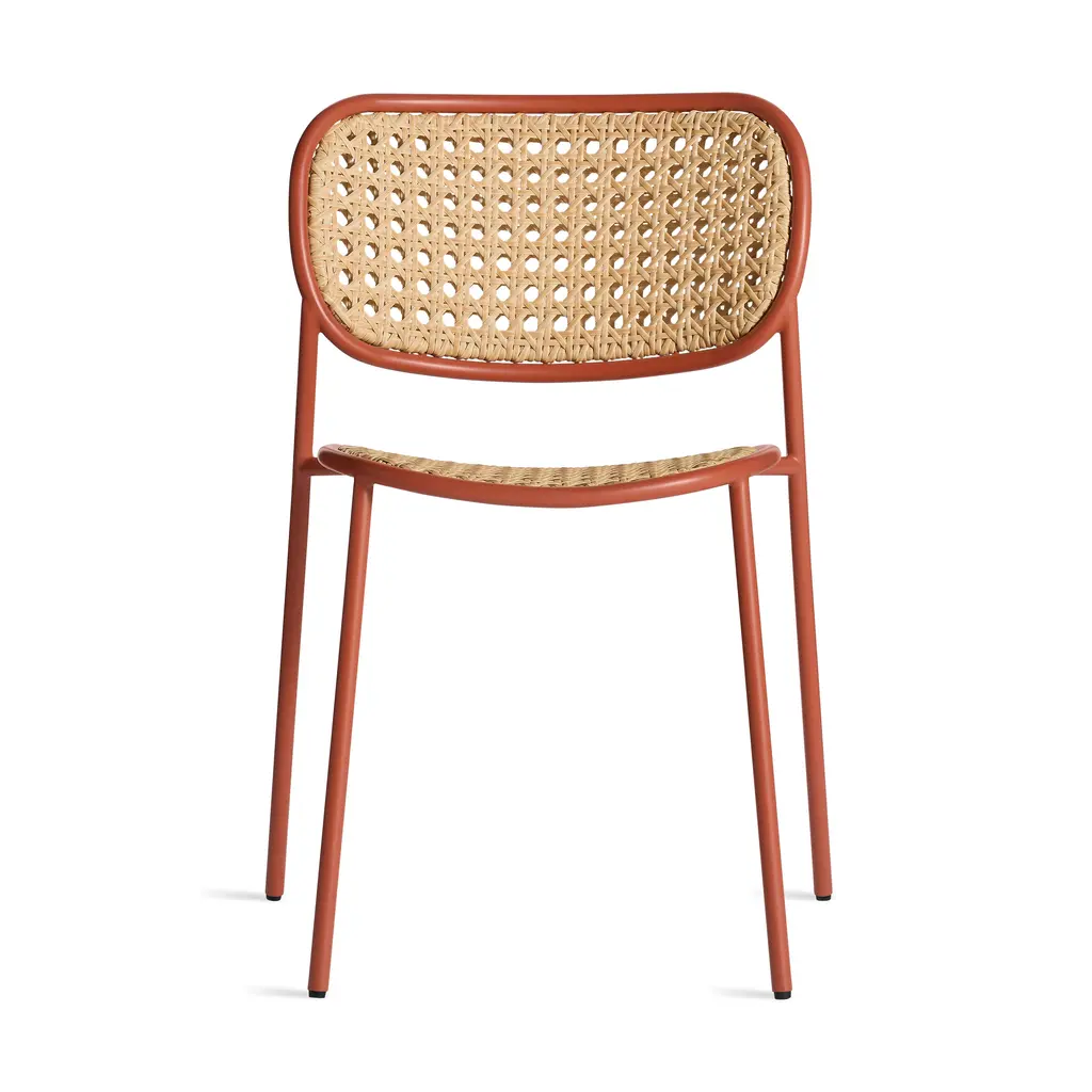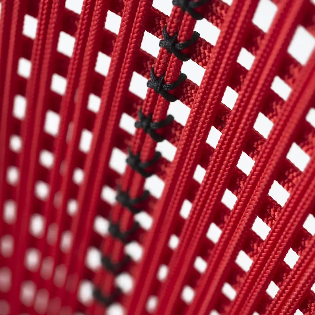 A sculptural work of art that functions as a contemporary chair, this piece boasts a striking design symbol of skillful craftsmanship. The slim and slanted structure is made of solid wood, and sustains the stunning and distinguishing element of this piece: a metal rod back covered with a captivating interlace of red rope. This chair is available in other finishes, please contact the Concierge for details.