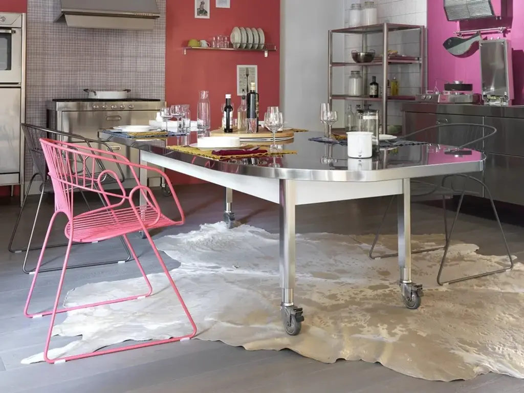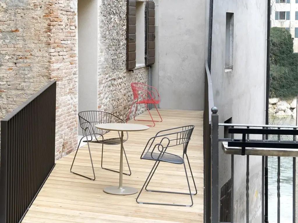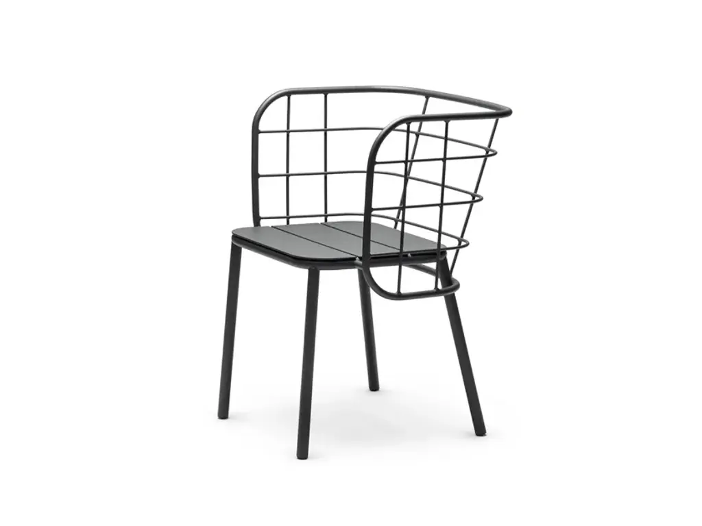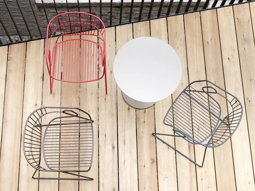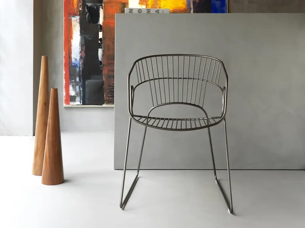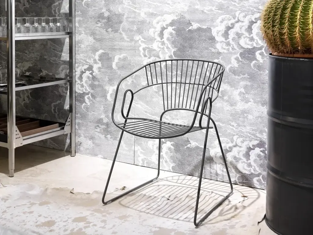 Japan is a chair made with a single curved metal rod. It is available for both indoor and outdoor environments. Characterized by an essential aesthetic, it appears as if it is suspended in a vacuum. The comfortable structure gives to the guest a pleasant welcoming feeling and comfort, thanks to a slight natural swinging.