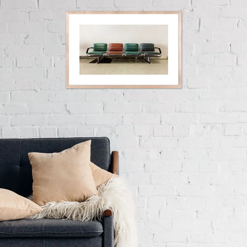 Exclusive to One Kings Lane: Taken at Calgary International Airport, this photo of empty seating can be perceived as serene or intriguing. Printed on high-quality paper, it arrives framed and ready to hang.Static treatments of our seemingly ordinary urban landscape, the photography of Los Angeles-based Jeff Seltzer reveals the effect of human occupation on contemporary environments. His images allow viewers to see beauty in the everyday and show harmony in scenes and scenarios we take for granted.