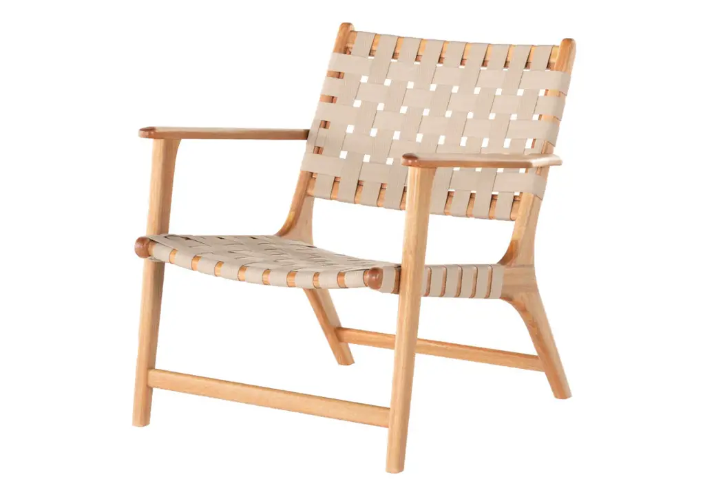 This airy outdoor chair features a light, relaxed style with its woven straps and minimal frame. Easily style several poolside or on a patio or deck for a tasteful design.