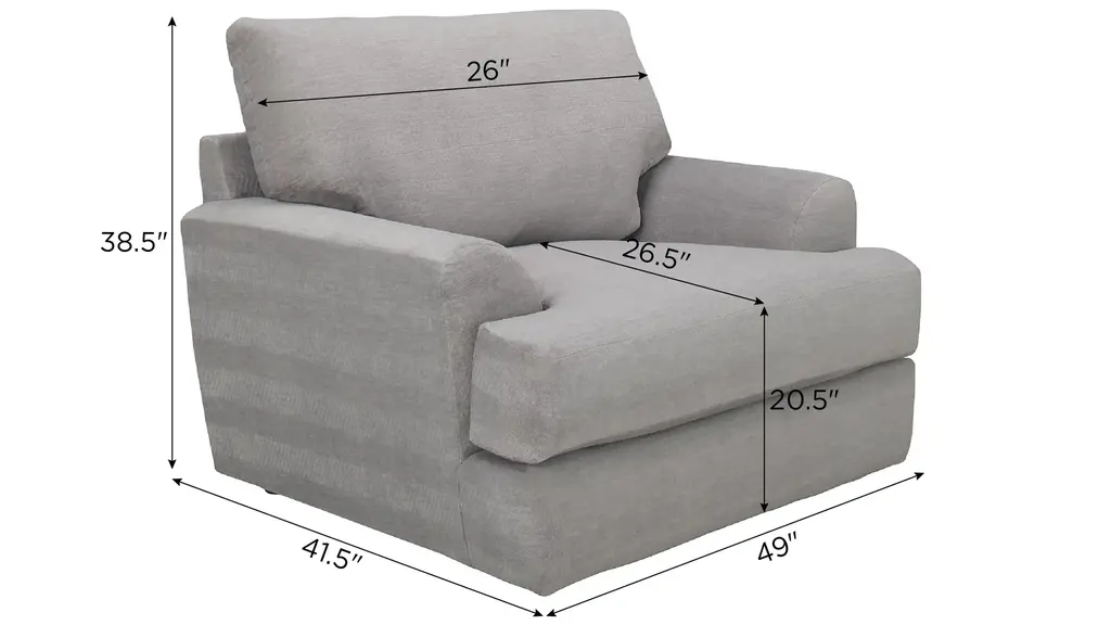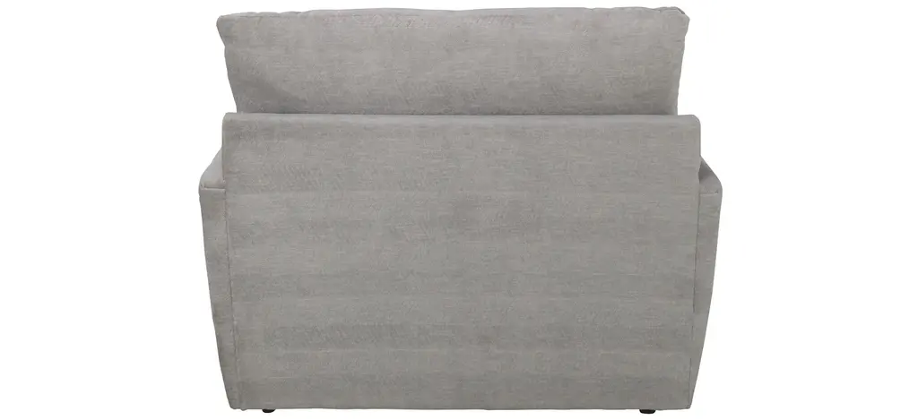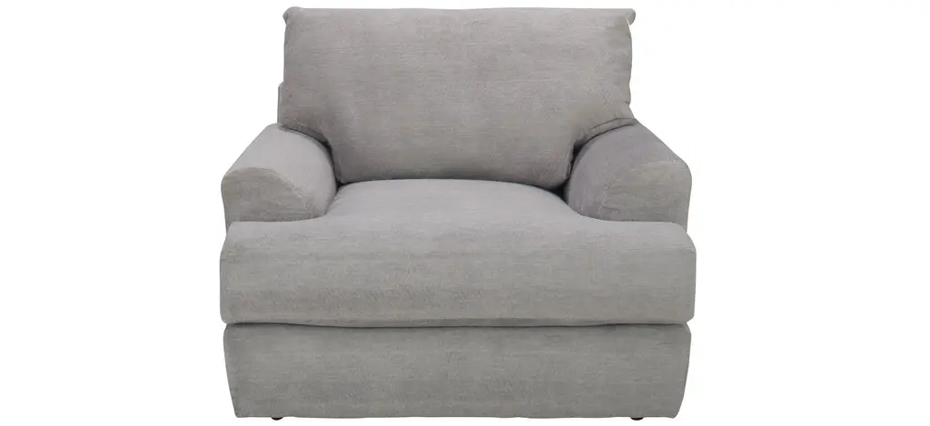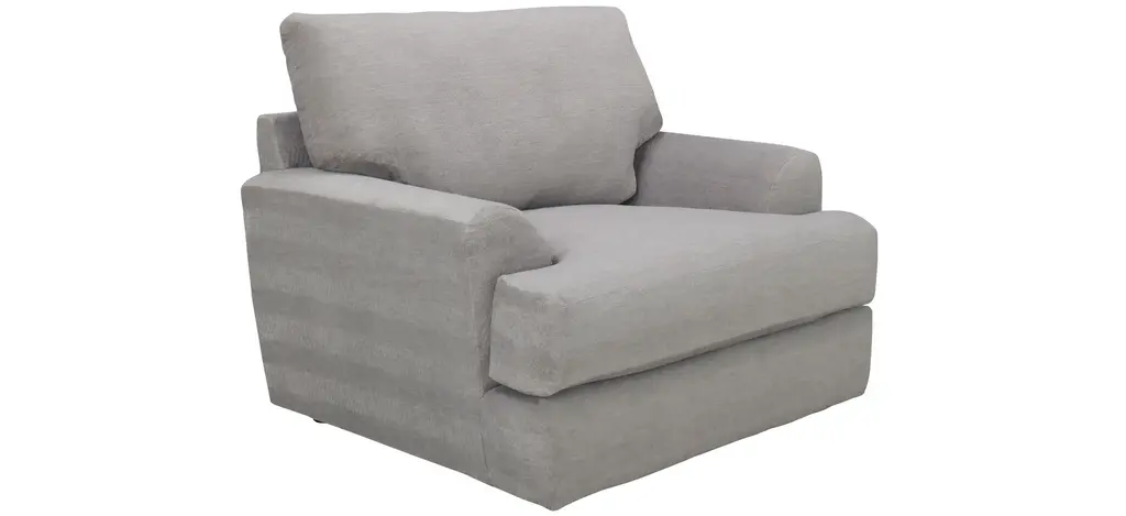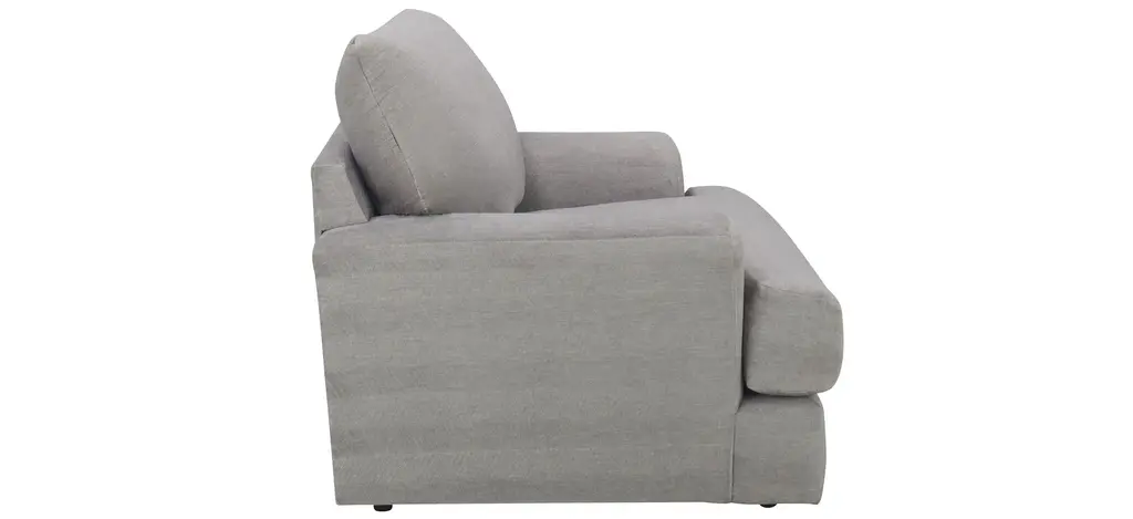 The low, broad profile and t cushions of the Joel chair-and-a-half make it a casual, fully lounge-ready choice for the family room or den. The subtle herringbone texture on the velvety soft upholstery is artful and interesting, while gently flared arms and soft, loose back cushions add to the delight.