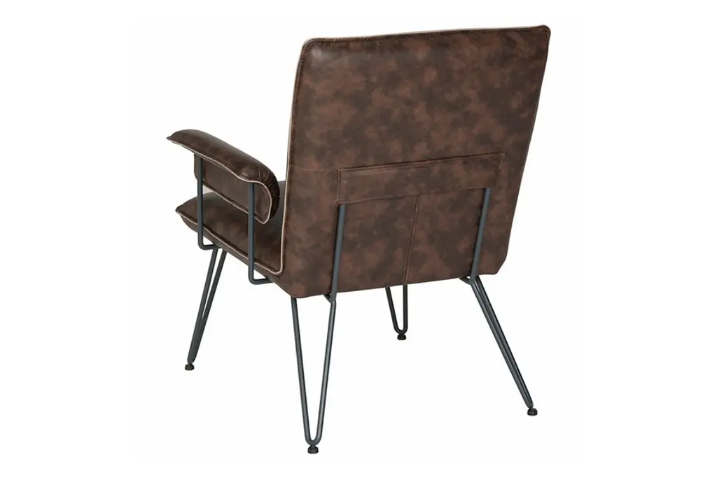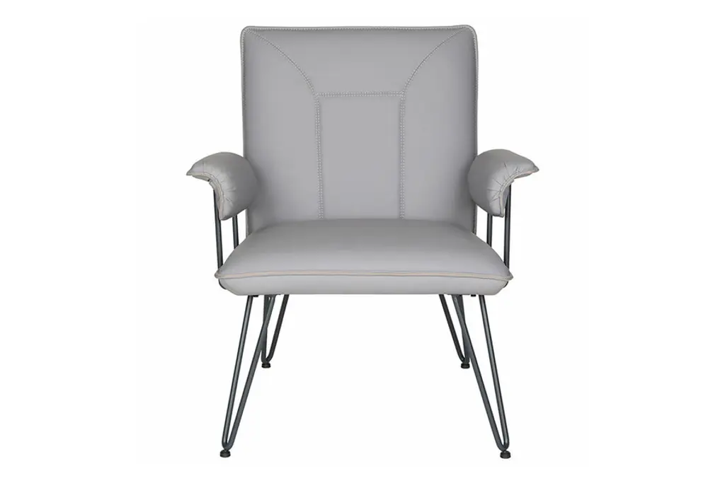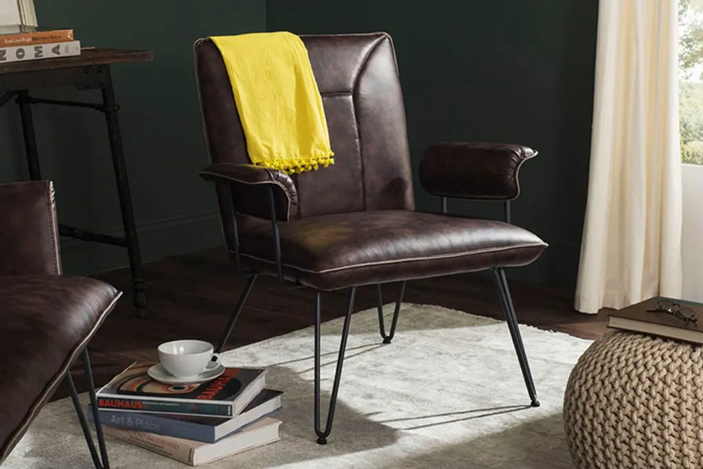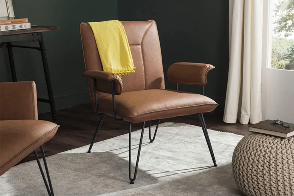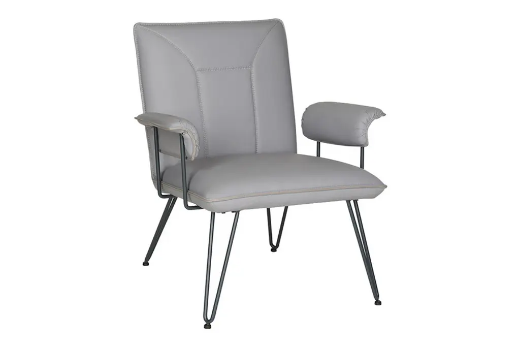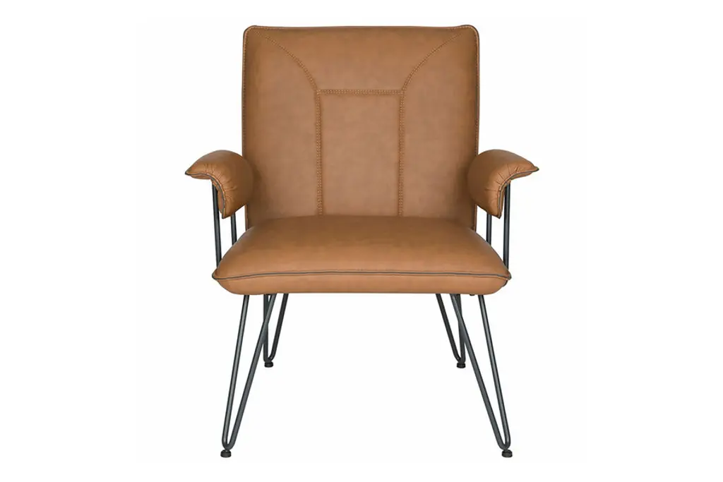 The retro look of the Johannes Arm Chair from Safavieh makes it an appealing option for complementing and modern or mid-century setting. This chair features a streamlined design that uses sleek blue-grey powder-coated steel hairpin legs to not only add stability, but to also add an industrial aesthetic to complement the luxurious seat. To really capture the retro feel, the Johannes Arm Chair is upholstered in luxurious leatherette, which offers a superb level of comfort and is easy to keep looking great.