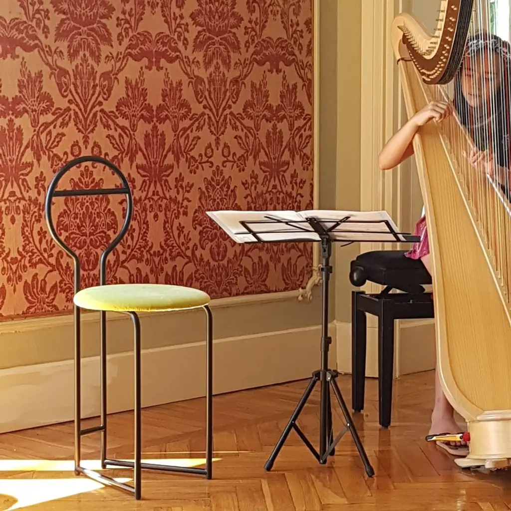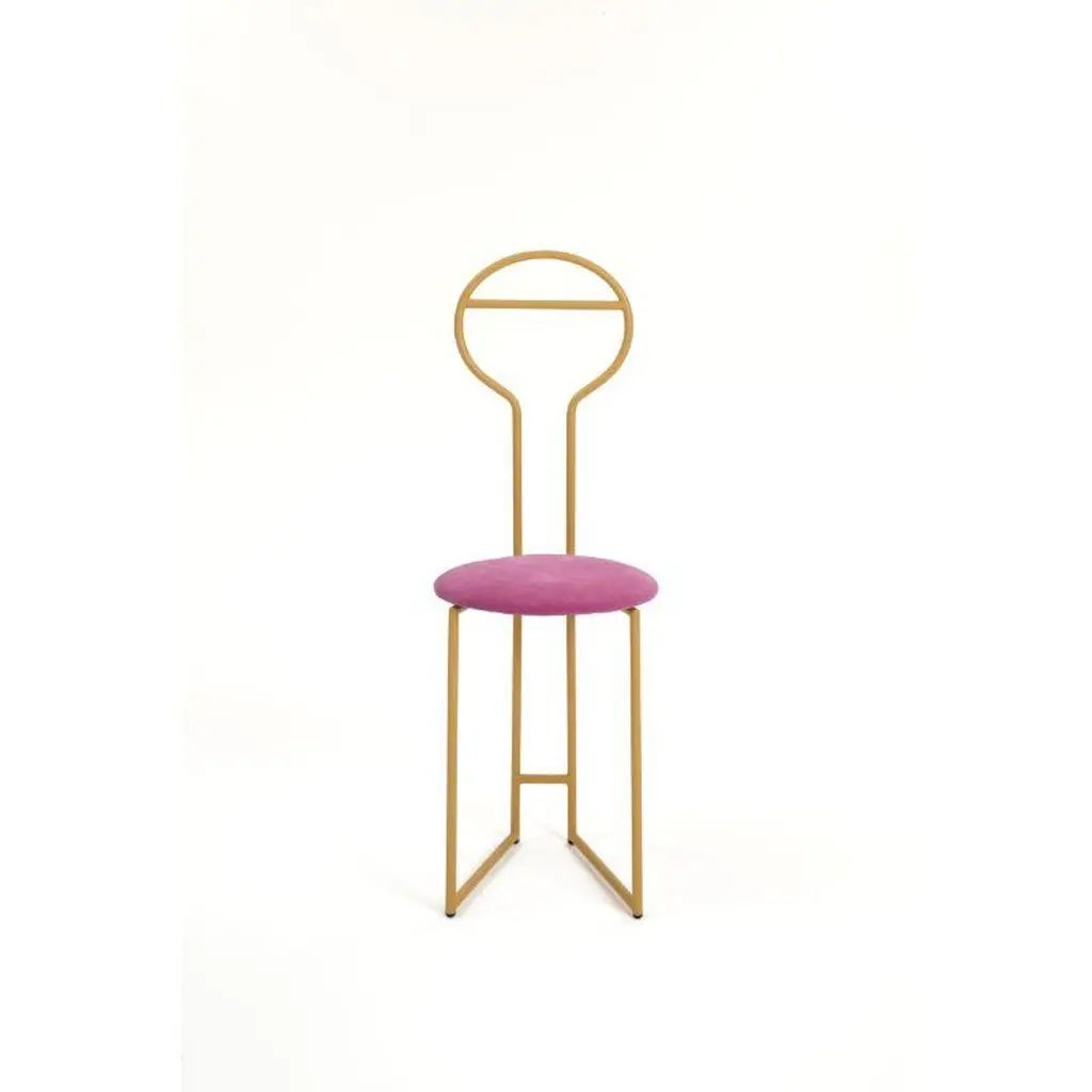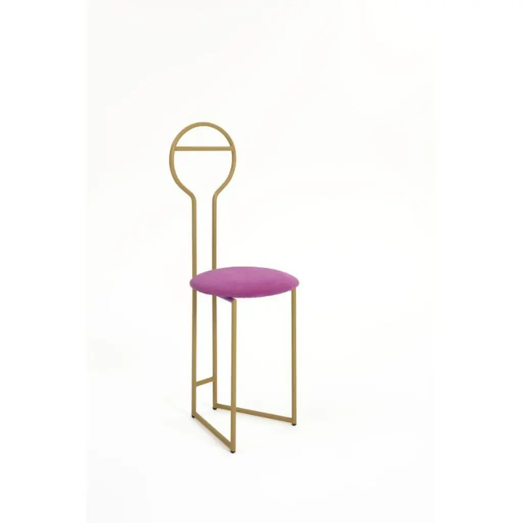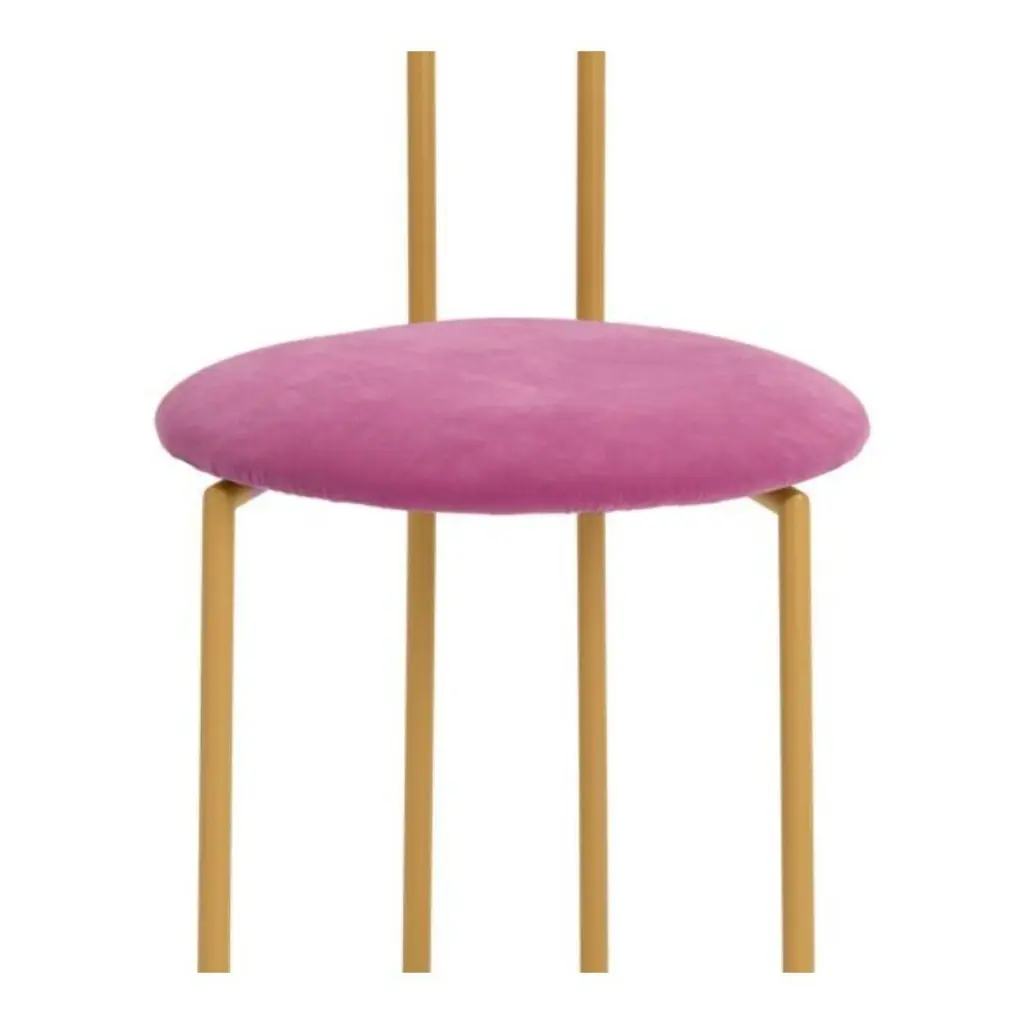 Joly Chairdrobe Gold HB Velvetforthy Malva by Colé Italia with Lorenz & Kaz (2019)Dimensions: H.105/seat H. 45 D.38 W.40 cmMaterials:tubular steel, bent and powder painted. Padded upholstered seatFinishing: GD gold; BK blackAlso Available: COM Fabric, Fabric Cat A, Fabric cat B, Leather Cat P, and high back.TC: C.O.M. fabric - send us your own materialCA: Cat A - Angel (polypropylene), Ganesha (synt. leather), Nord Wool (felt)CB: Cat B - Tiffany (polyestere), Lana (aquaclean)CC: Cat C - Velvetforthy (Velvet), Topia (wool), Novum (Wool), Opera (felt)CP: Cat P - Milano (full grain leather) The Chairdrobe, a manifestation of an always improvised object, like the chair next to the bed which turns into a wardrobe! Like the jolly in card games, Joly fills exactly this gap. It is a silent butler, a tray or an occasionalchair. Lightweight and easy to grip, it can “follow” its user into the living or sleeping area, as needed. Joly is ironic,decorative and functional. It serves well as an entrance piece, in the bathroom and obviously... in the bedroom! Jol(l)y good! Made of gold/black powder-coated metal with a top / seat in solid natural walnut or padded cushion.Colé is a young Italian design brand, with a high-end production 100% made in Italy. Born from the experience of Matteo De Ponti, architect, who grew up in one of the most outstanding Milanese design families, and the artistic sensibility of Laura Macagno, degree in Economics and passionate of art and design. Our mission is to create design icons, beautiful and comfortable pieces that can stand the test of time, furnishing houses of international and sophisticated clients, and realized with craftsmanship, thus unique. “We love objects which own deep roots, excellent quality, and a strong evocative power. Archetypal forms dressed with new beauty without losing their classical composure”.Our expressive research is inspired by the utopian force of Italian eminences grises architects and designers of the ’50s, the Scandinavian design, the Bauhaus, ethnic handcraft and houses of famous writers of the XX century, all different as a style but united by the intense soul of those who worked and lived there.
