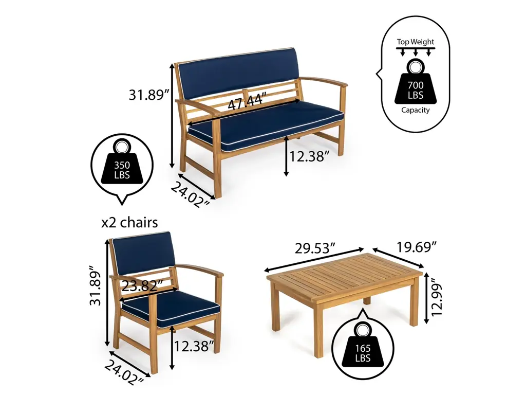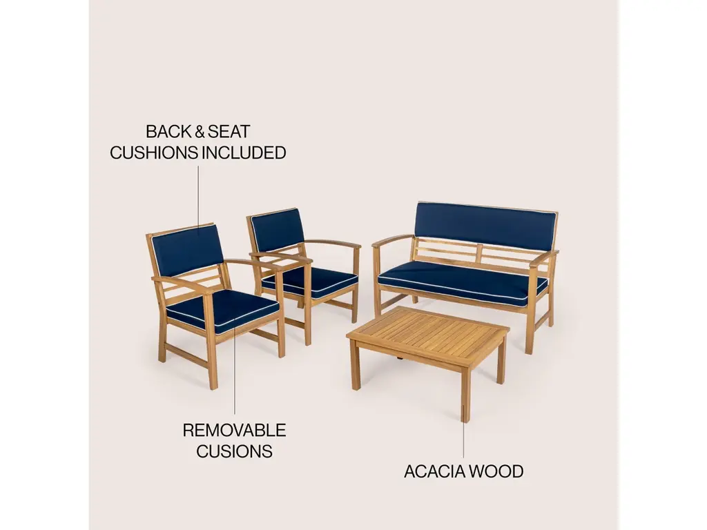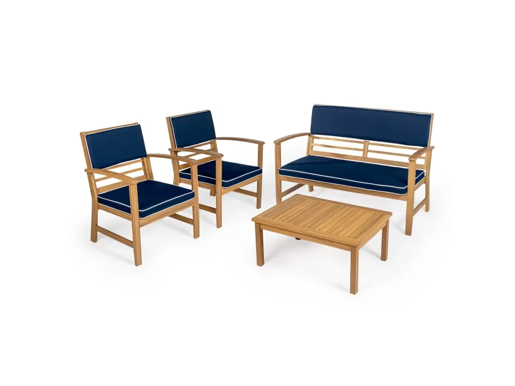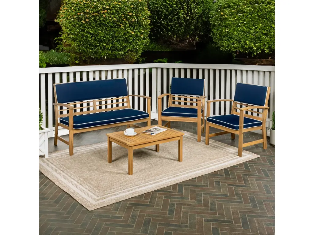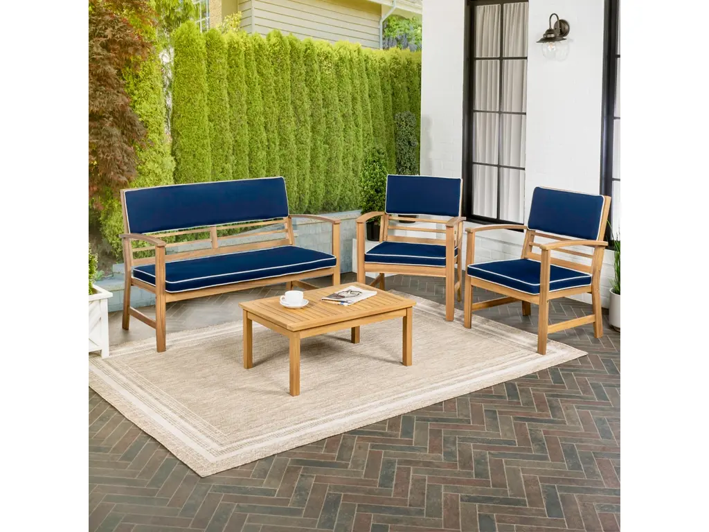 Give your porch or patio an instant upgrade with our classic four-piece outdoor furniture set. The comfortable settee and two chairs have cushions covered in outdoor fabric, complemented by a matching slatted cocktail table. The vintage design of this conversation set would look great at a traditional or modern home.