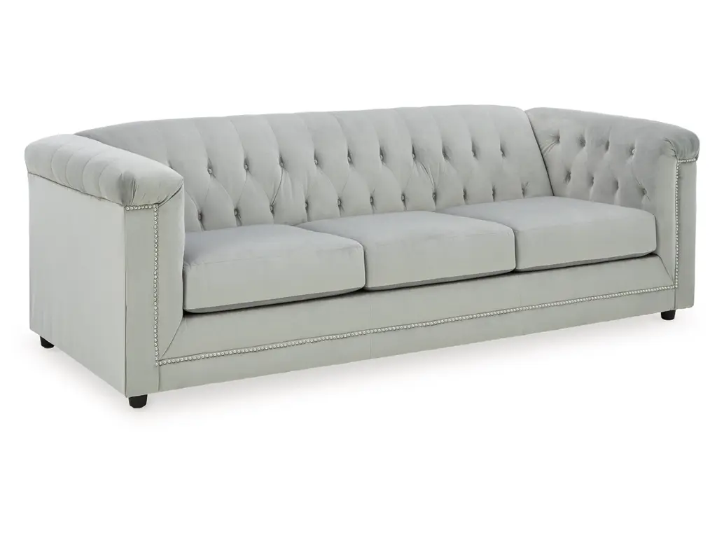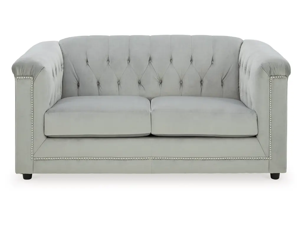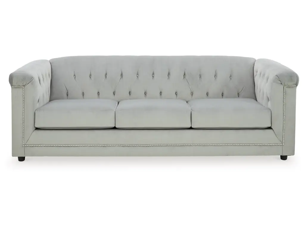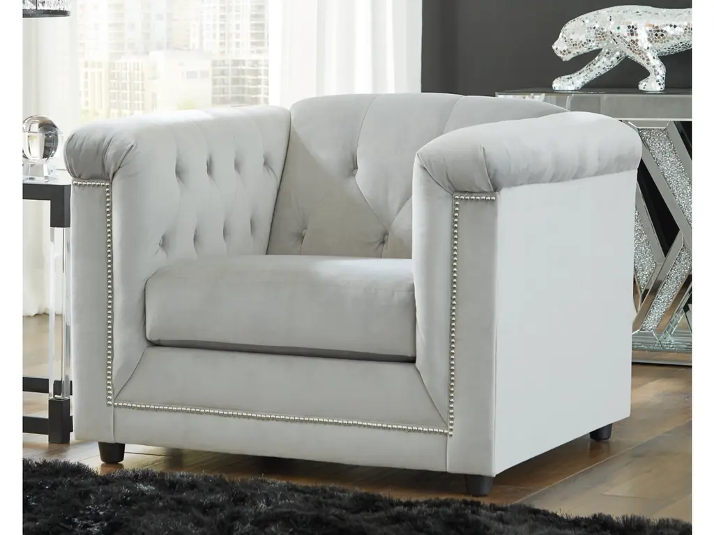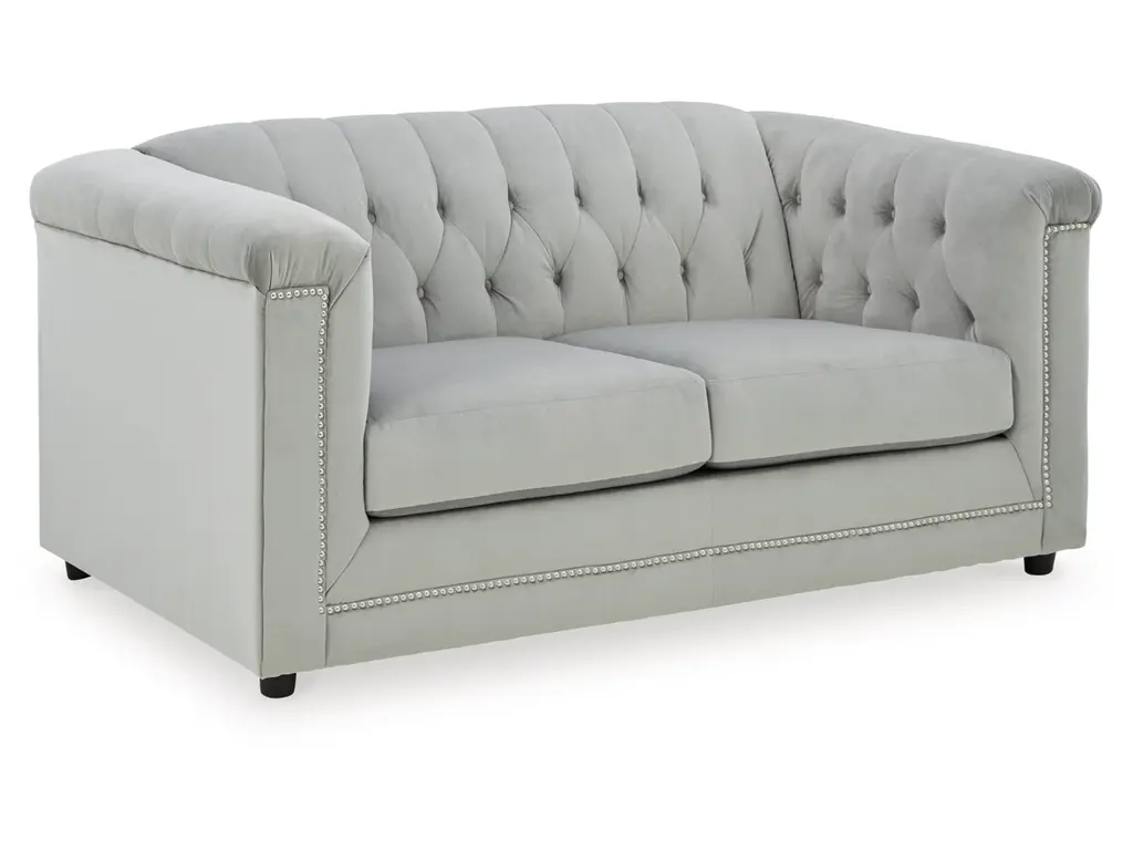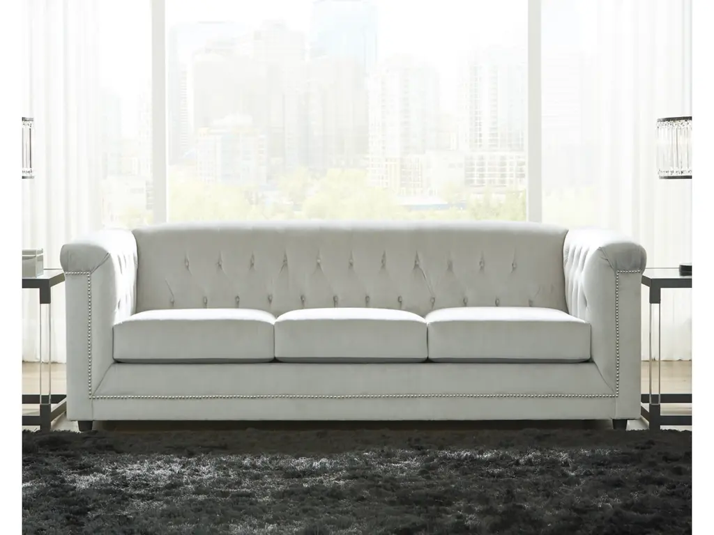With a timeless classic Chesterfield styling that's very much in vogue, the Josanna seating package makes a brilliant statement. Its beautifully neutral silvery gray velvet fabric looks as good as it feels. Nailhead trim, button tufting and high shelter arms give the set an effortlessly elegant appeal. The hidden leg design is an on-trend addition for modern spaces.