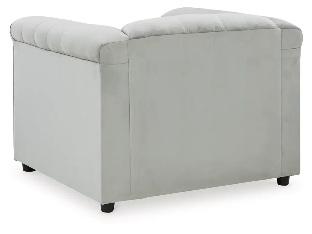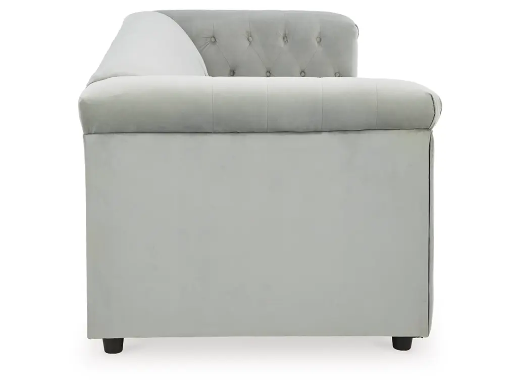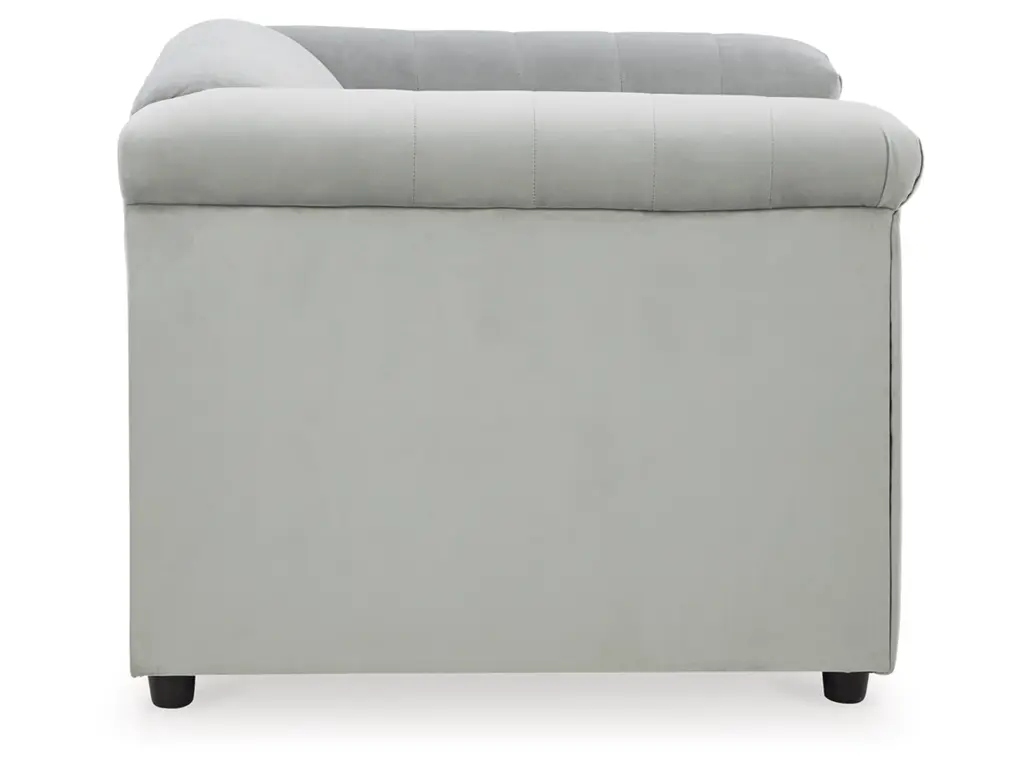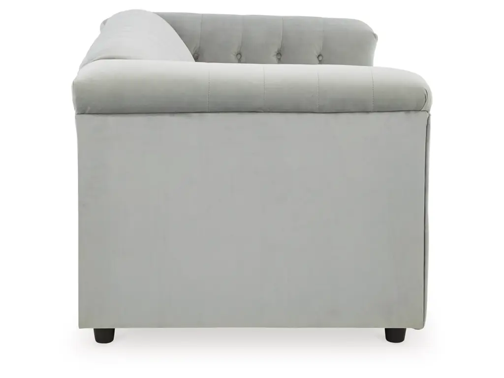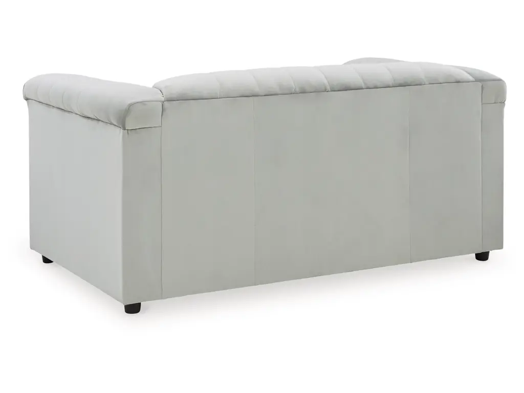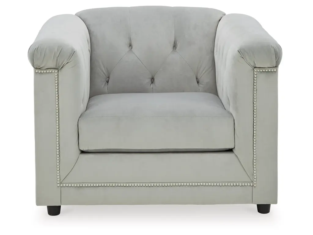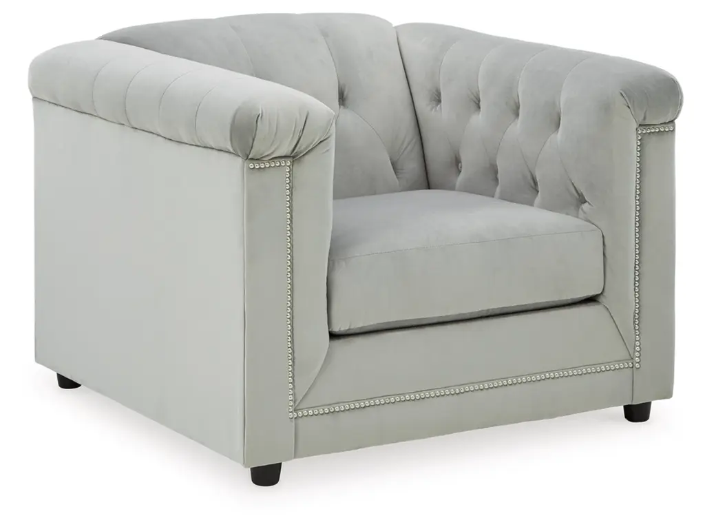With a timeless classic Chesterfield styling that's very much in vogue, the Josanna seating package makes a brilliant statement. Its beautifully neutral silvery gray velvet fabric looks as good as it feels. Nailhead trim, button tufting and high shelter arms give the set an effortlessly elegant appeal. The hidden leg design is an on-trend addition for modern spaces.