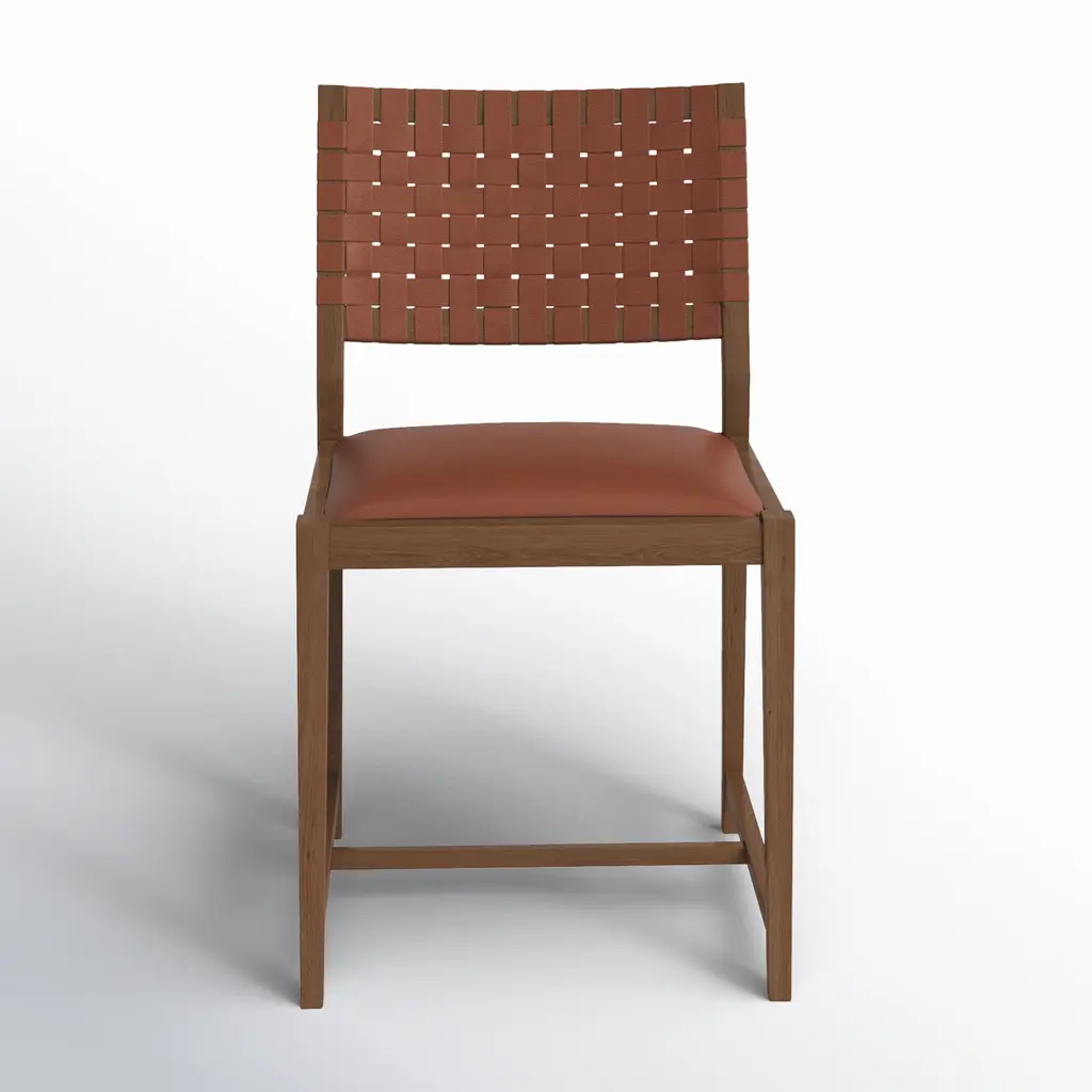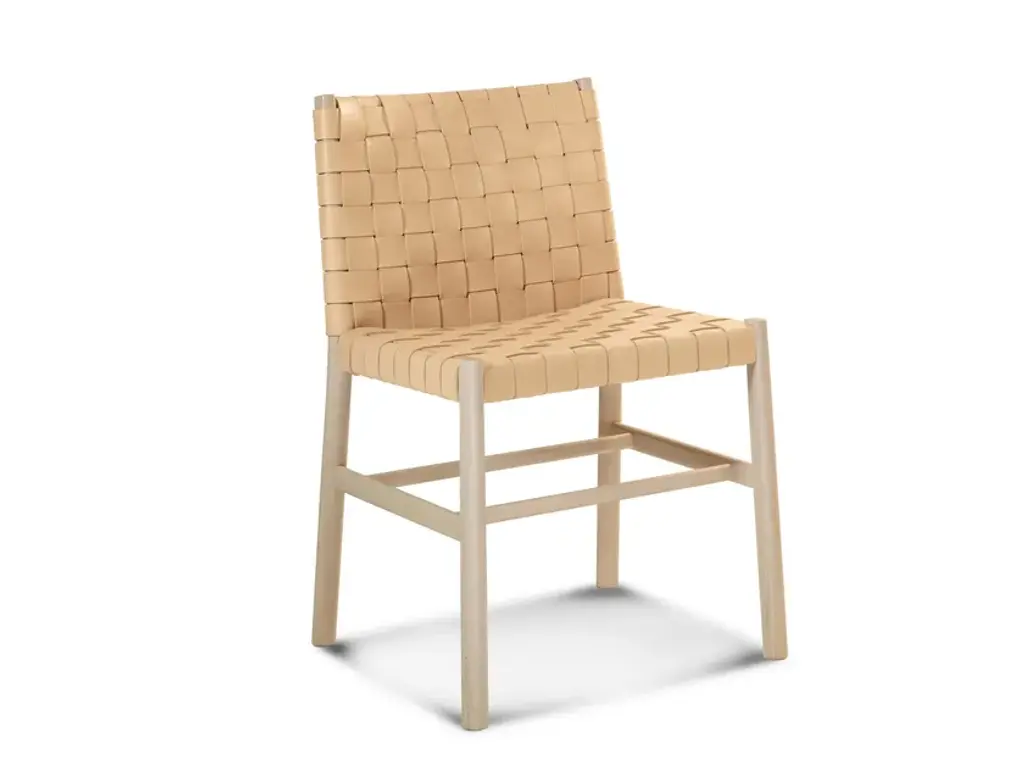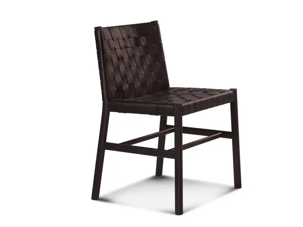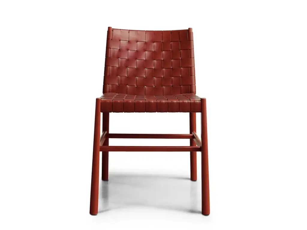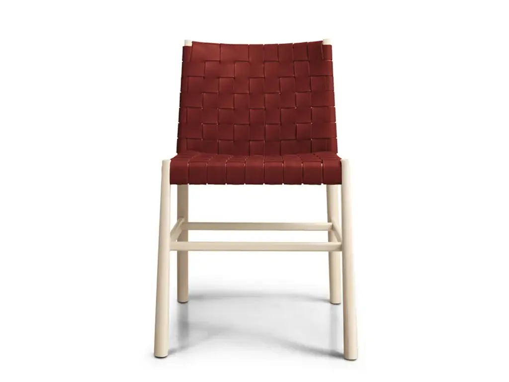 Beechwood with backrest in interwoven thick leather and wooden seat, covered with thick leather, also with armrests.