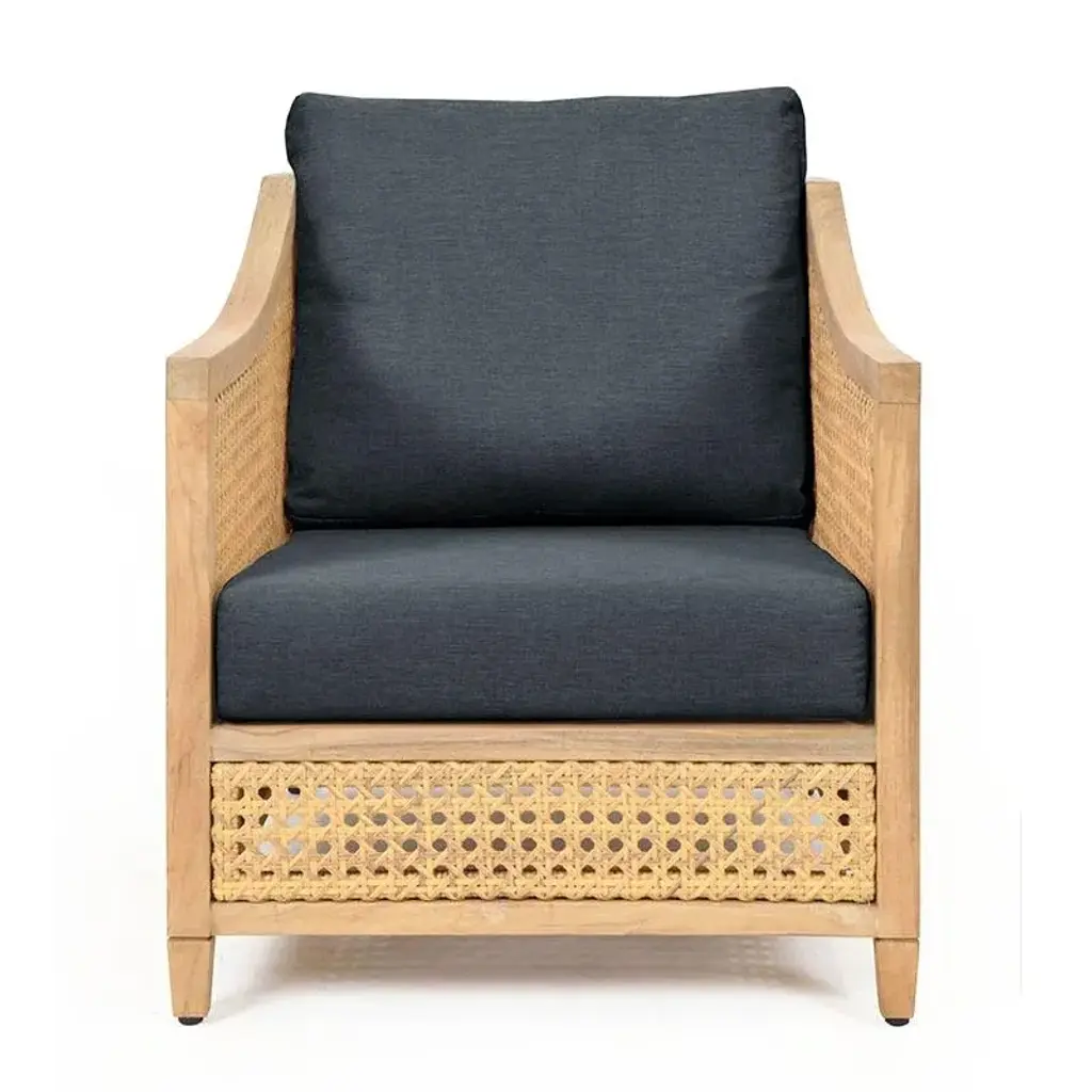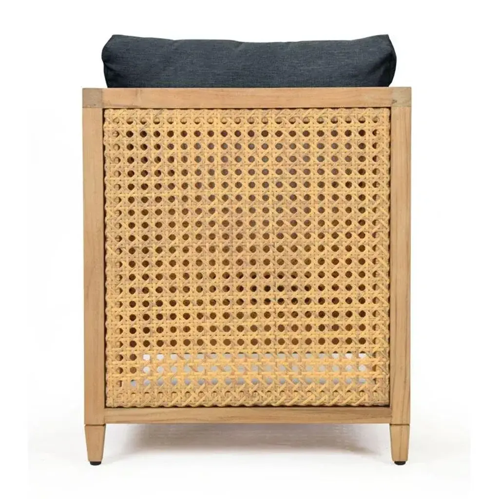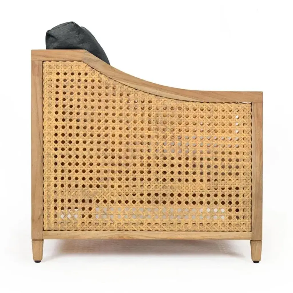 A sophisticated linear teak frame is accented by woven synthetic cane and fitted with a seat and back cushion. Natural teak with Handwoven Synthetic Fiber.