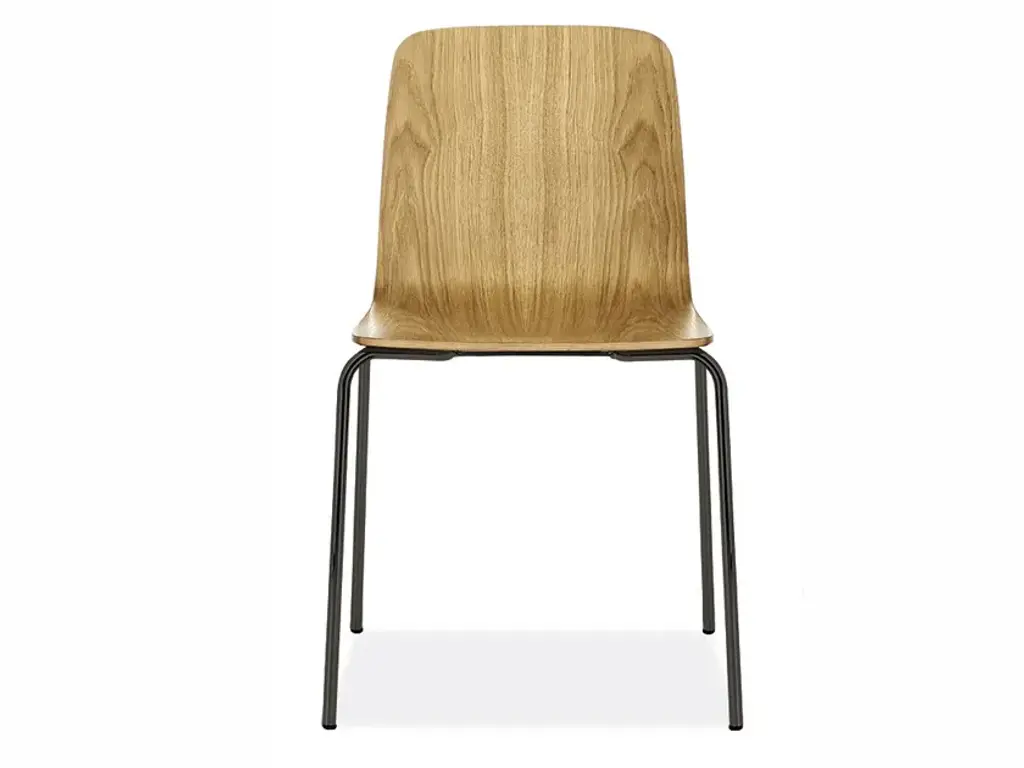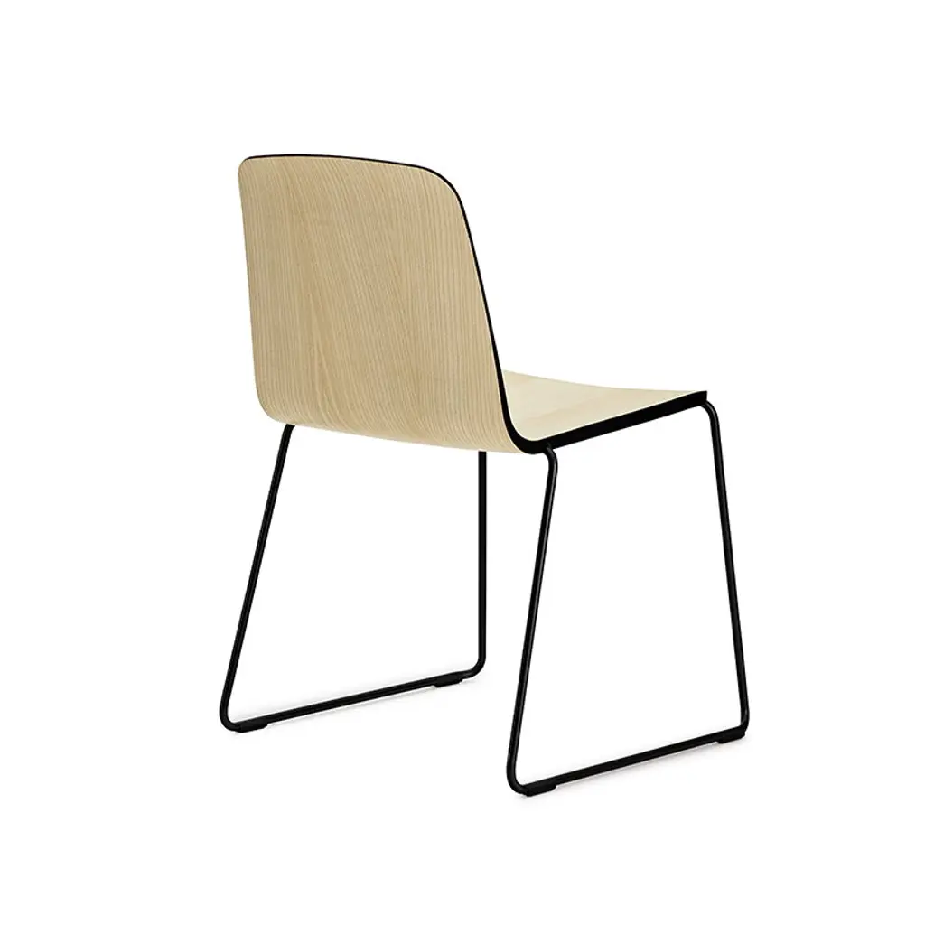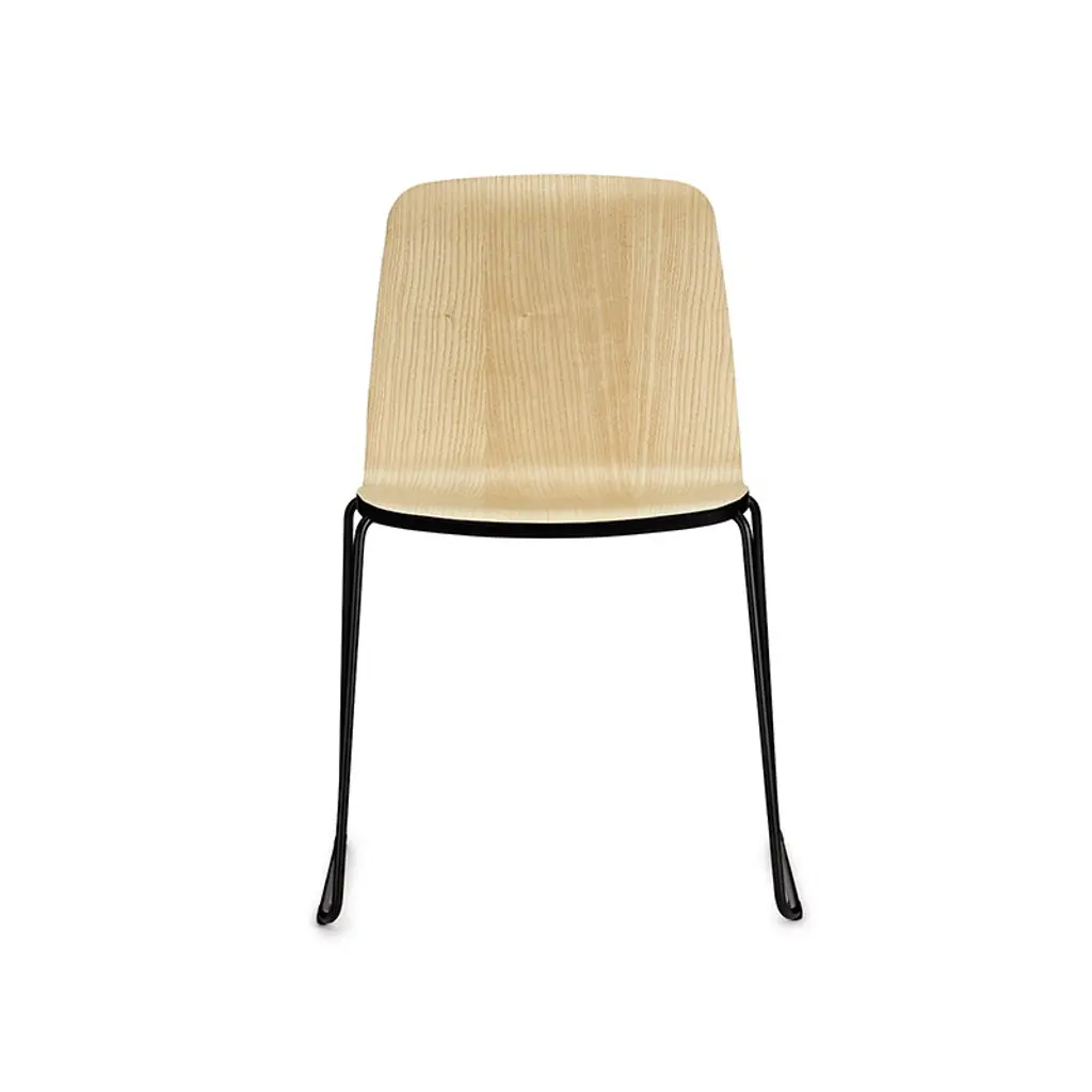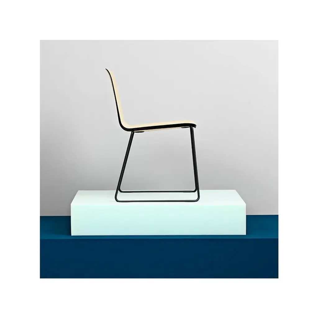 Just Chair, designed by Iskos-Berlin for Normann Copenhagen, is a minimalist chair that has been reduced to two elements: a slender metal base and an upward-tapering shell. The chair catches the eye with its thick veneer seat, highlighted further by a colored edge in some models, and provides a comfortable sitting experience due to its slightly downward curving front. Thanks to its simple design, Just Chair is well suited for a variety of spaces and uses. In 2014, the chair was recognized with the Interior Innovation Award.