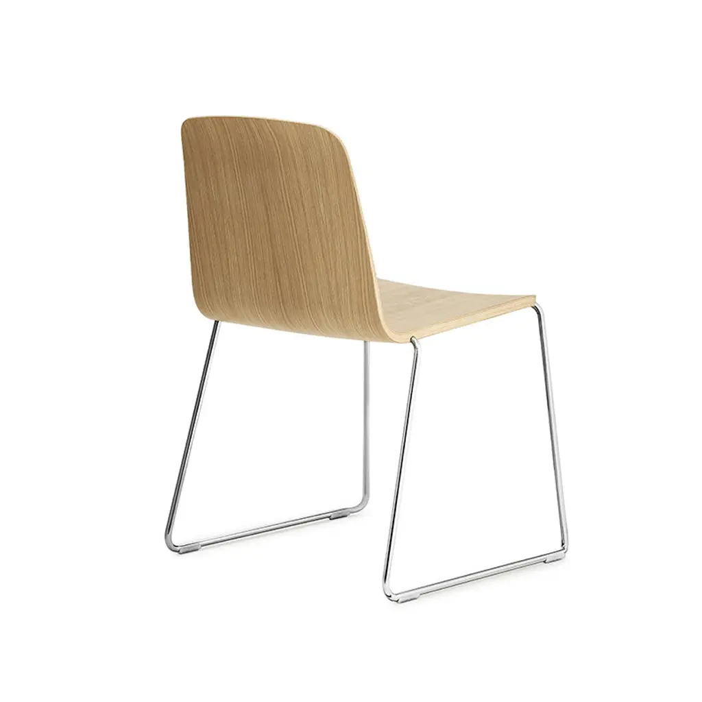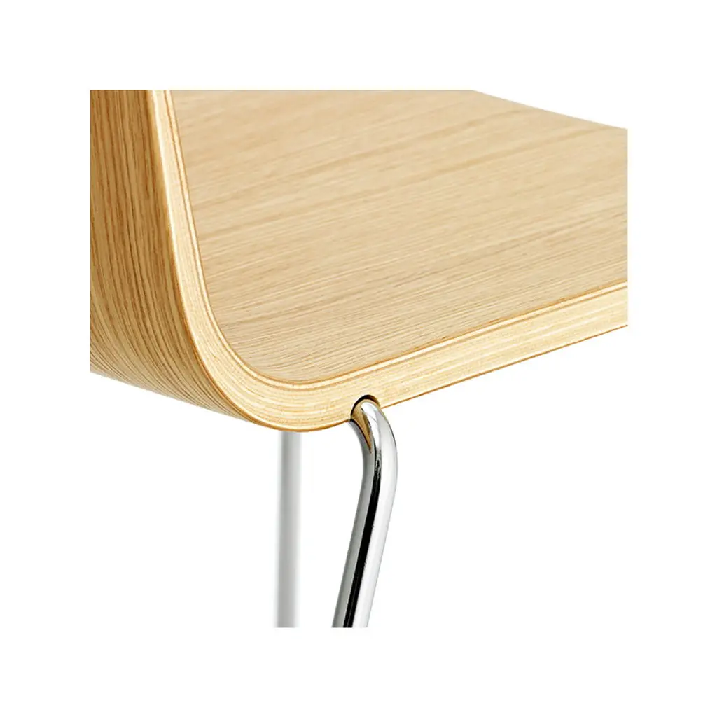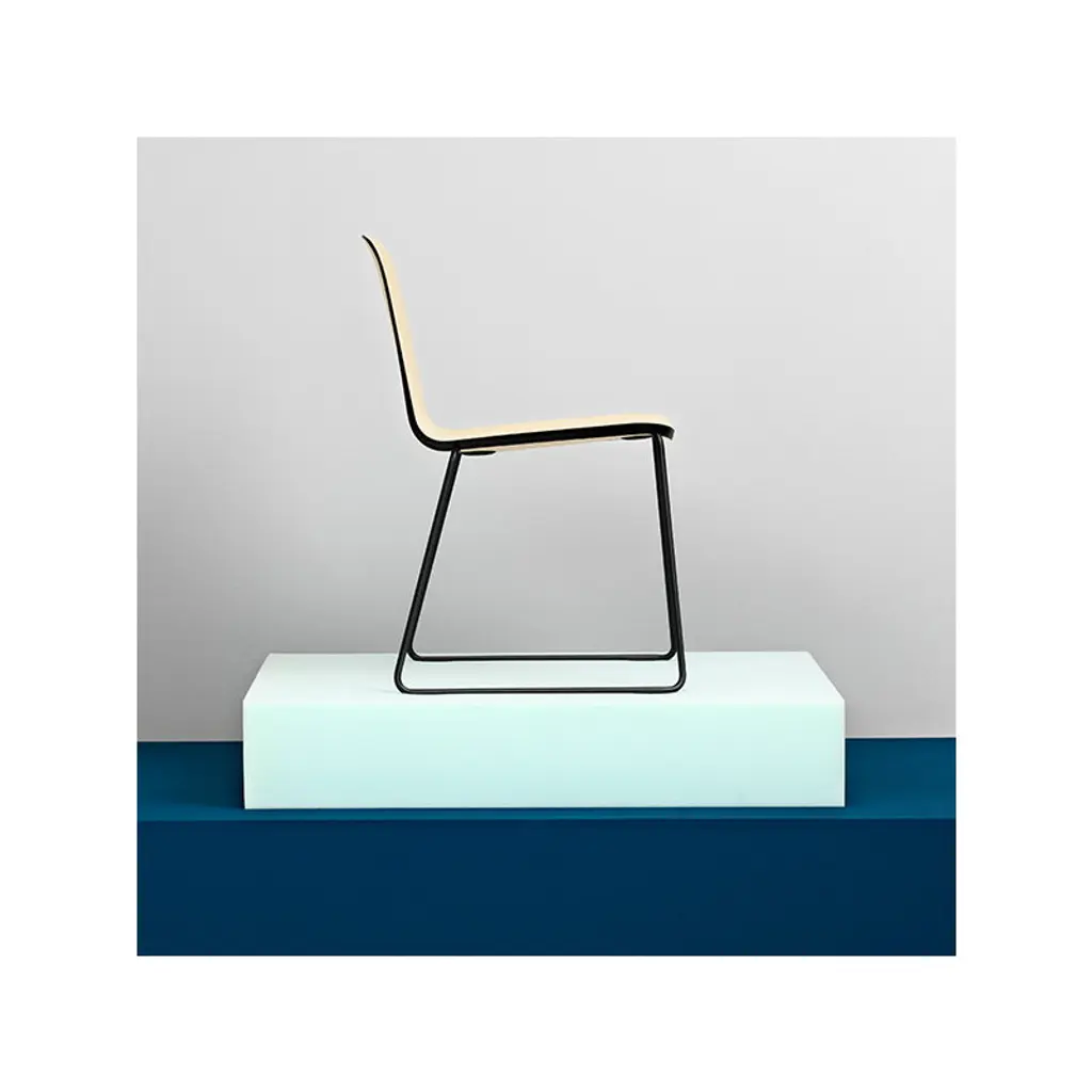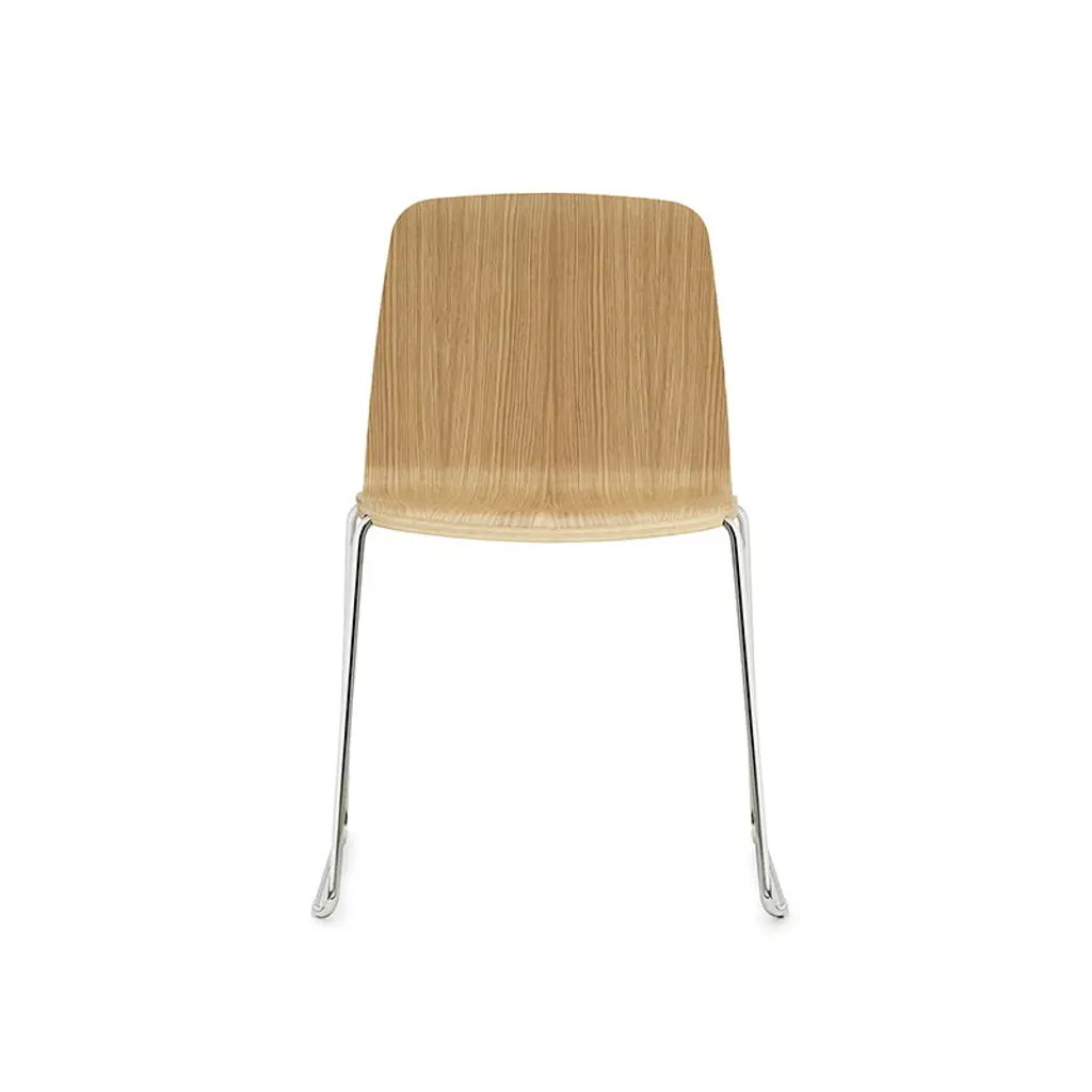 Just Chair, designed by Iskos-Berlin for Normann Copenhagen, is a minimalist chair that has been reduced to two elements: a slender metal base and an upward-tapering shell. The chair catches the eye with its thick veneer seat, highlighted further by a colored edge in some models, and provides a comfortable sitting experience due to its slightly downward curving front. Thanks to its simple design, Just Chair is well suited for a variety of spaces and uses. In 2014, the chair was recognized with the Interior Innovation Award.