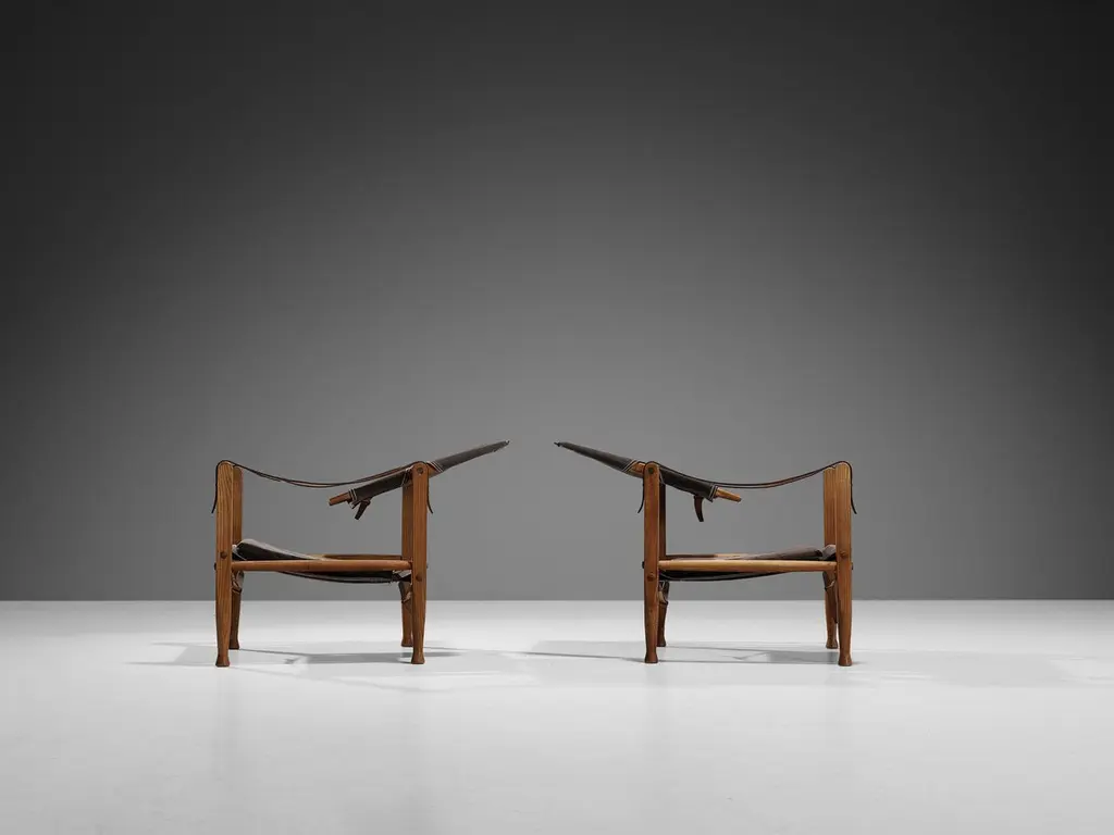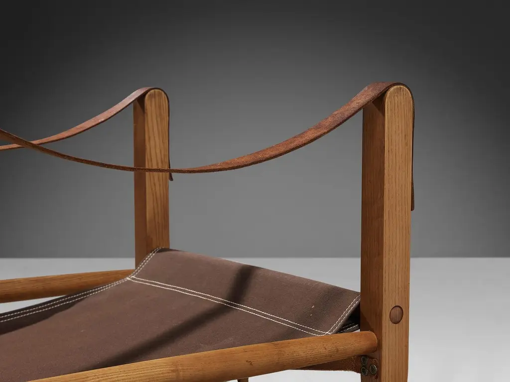 Kaare Klint for Rud Rasmussen, pair of safari chairs model 'KK47000', ash, canvas, metal, brass, leather, Denmark, designed in 1933 and produced in 1960s. The chair shows very elegant and well-designed lines, in combination with carefully crafted wood joints. Equipped with elegant sculpted legs and backrest which can be tilted to optimize the seating comfort. Upholstered in brown canvas that beautifully complements the ash frame. The buckle and strap underneath the seat and back enrich the leather in a vigorous manner.Kaare Klint (1888 - 1954) was a Danish architect and furniture designer. Klint can the seen as the father of Danish Midcentury design. Klint's was the son architect Peder Vilhelm Jensen-Klint who architect, designer and artist who is mainly known for designing the Grundtvigs church in Copenhagen. Kaare Klint himself has walked the same path from architect to designer as his father. In 1924, Klint founded the art academy of Copenhagen where he was professor in furniture design. Klint worked and thought along a few strong principles being the importance of former styles and believed that the only way forward was to have a deep knowledge of craftsmanship. One of his other core design principles was to research functionality and deep knowledge of the working of the human body. Klinkt drew inspiration from the Shakers, Chippendale and Biedermeier. Kaare Klint's style from the 20s and 30s has had a lot of influence on other designers in both Europe and the United States. Amongst others, Hans Wegner, Børge Mogensen, Finn Juhl and Poul Kjærholm have taken influence from Klint.Please note that these items are in used condition and are in need of restoring before use. We kindly ask you to reach out to our design specialists for further information. The shown price, is the price per item.
