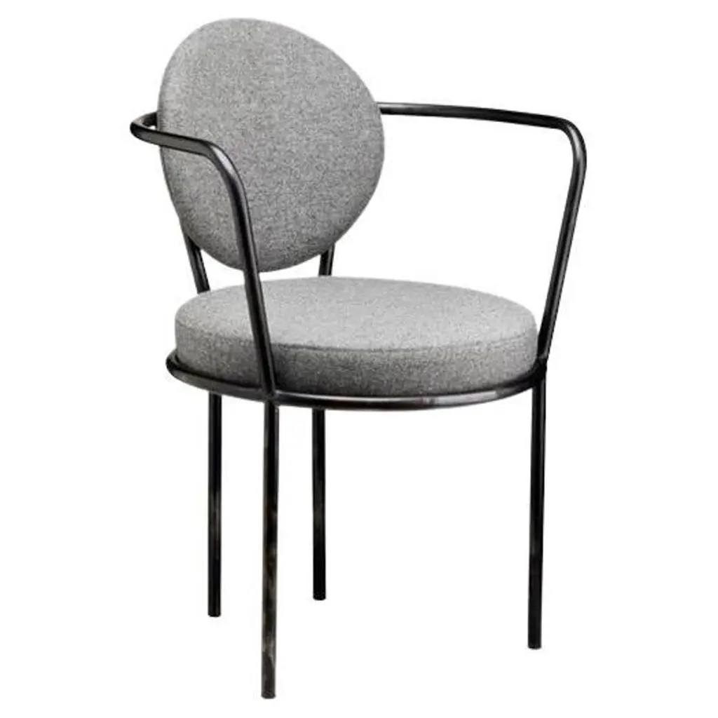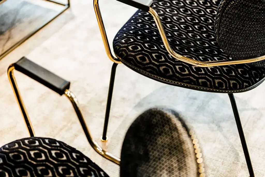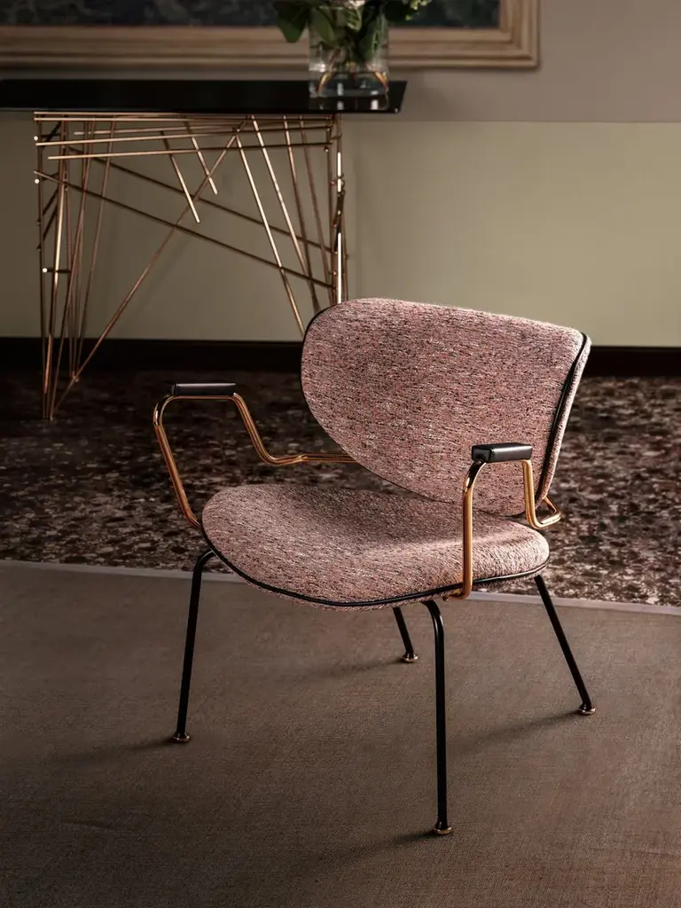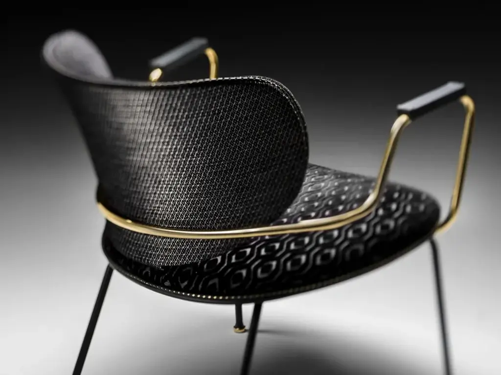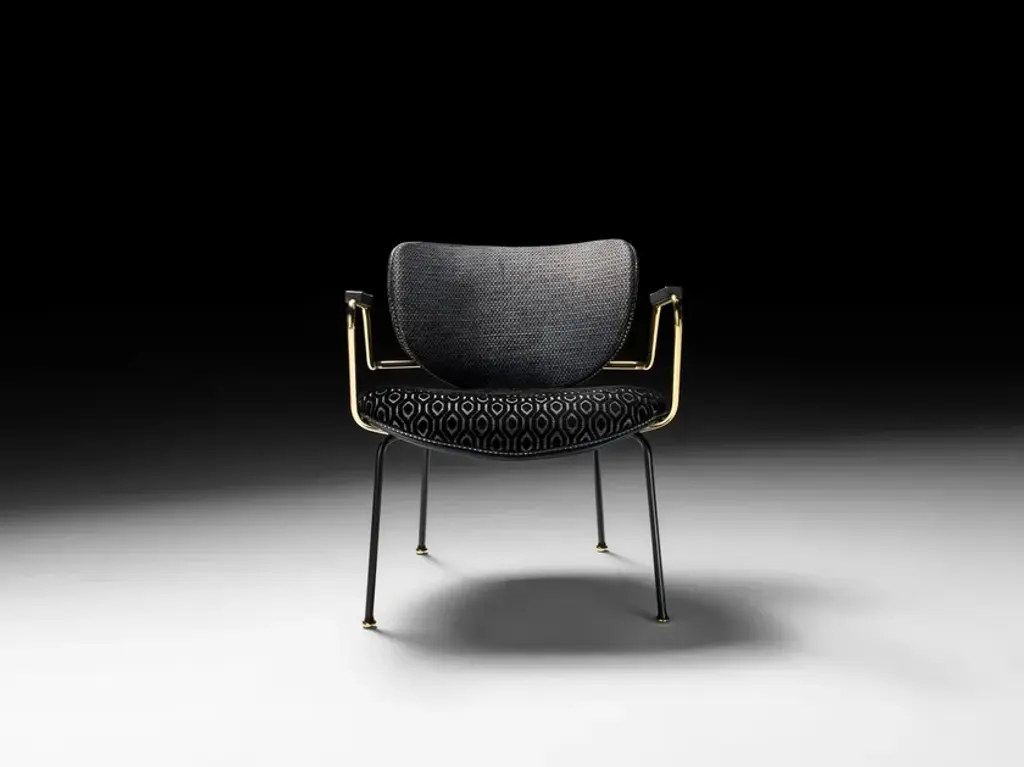 Kalida Lounge is a fabric chair.Fabric Montrace col. 060. Base in matt black-varnished metal rod. Seat, back in curved beech wood, padding in high-resilience expanded polyurethane. Metal glides and armrest (optional) in polished gold finishing. Non removable cover. The skilful design of the Kalida Lounge seating system becomes a chair, that stands out for its elegant informality. The distinctive mark of the black painted legs is enhanced by the foot in a polished gold finishing. The armrest element (optional) accommodates the backrest with a wide and distinctive gesture, to give further comfort to an object that knows how to stand out in a contract, business or home situation. The care for fabric combinations is the signature of Black Tie style.Kalida Lounge is not just a chair: it is a seating system making style and lightness functional. Everything starts from the sign: the backrest is skilfully designed, in a golden proportion that combines beauty and absolute comfort. The matt steel legs are graceful and light: the elegant foot in a polished gold finishing, coordinated with the optional armrest, transforms Kalida Lounge into an informal chair with a refined character.