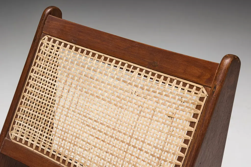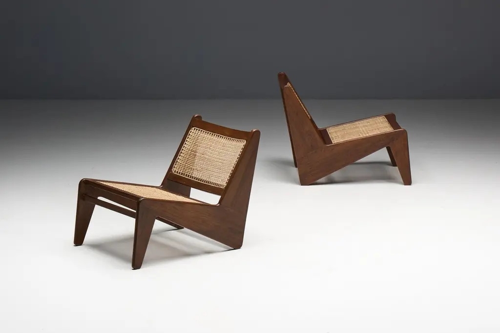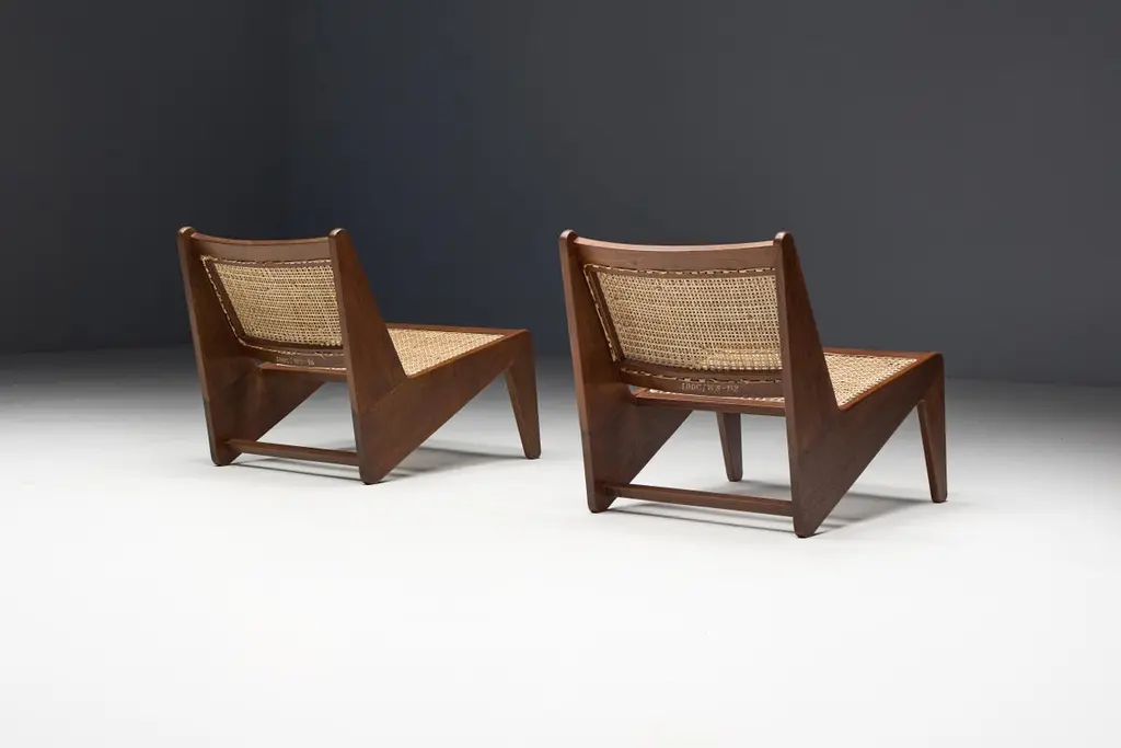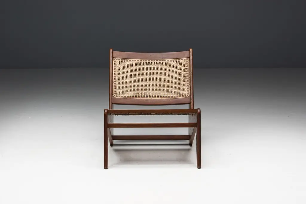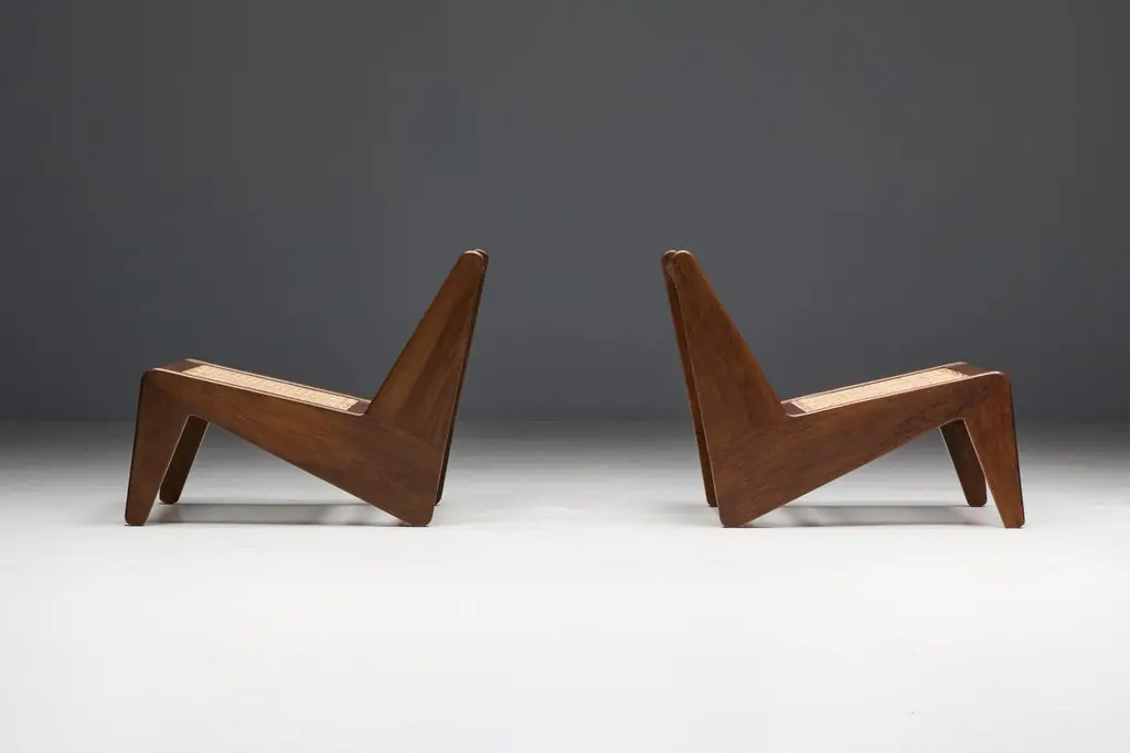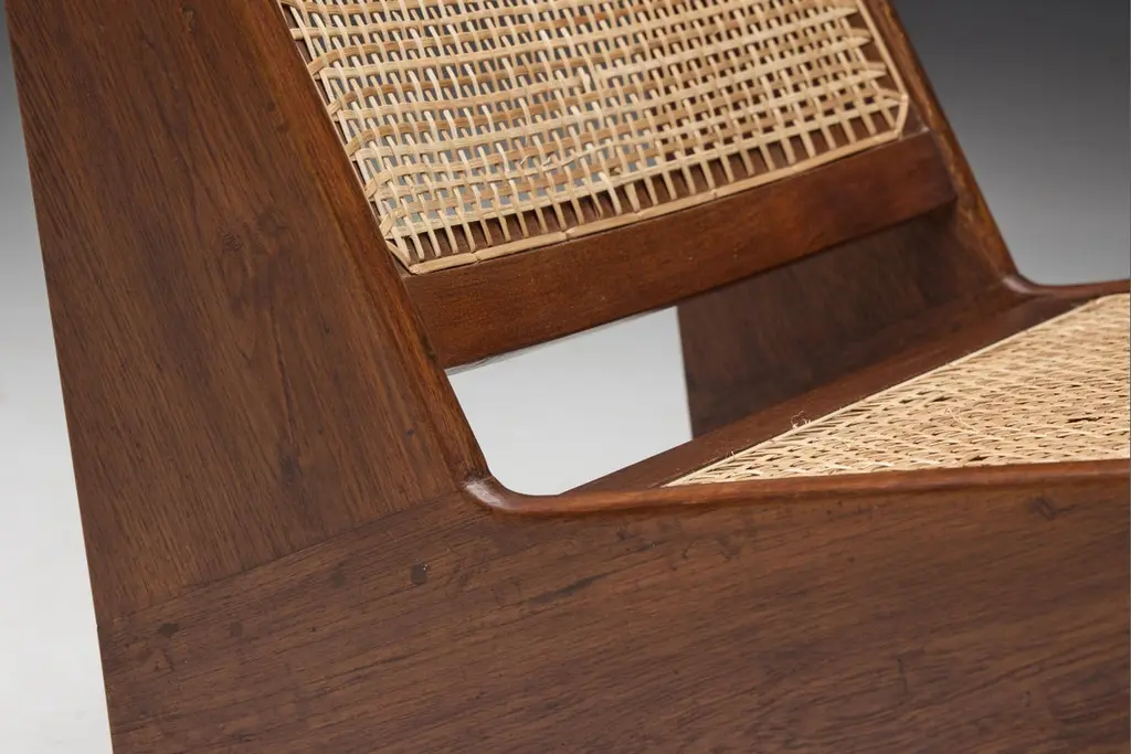 Kangaroo chairs designed by Pierre Jeanneret for Chandigarh’s General Hospital Hall, crafted from solid teak and intricately braided cane. These iconic chairs became integral to the city’s furniture landscape, blending modern European aesthetics with traditional Indian influences. Jeanneret’s designs are celebrated for their simplicity and elegance. This low chair is defined by its unique "Z" shaped sides, formed by a sequence of three vaguely triangular, coplanar elements. The seat and backrest showcase a signature weaving technique within the wooden frame. Found in both public buildings and private residences, the chair symbolizes Chandigarh's mid-century design. Notably, the chairs were made from trees harvested during the city's construction, reflecting an early commitment to sustainability. Their eco-friendly origin further adds to their historical value. Two chairs are available, priced individually