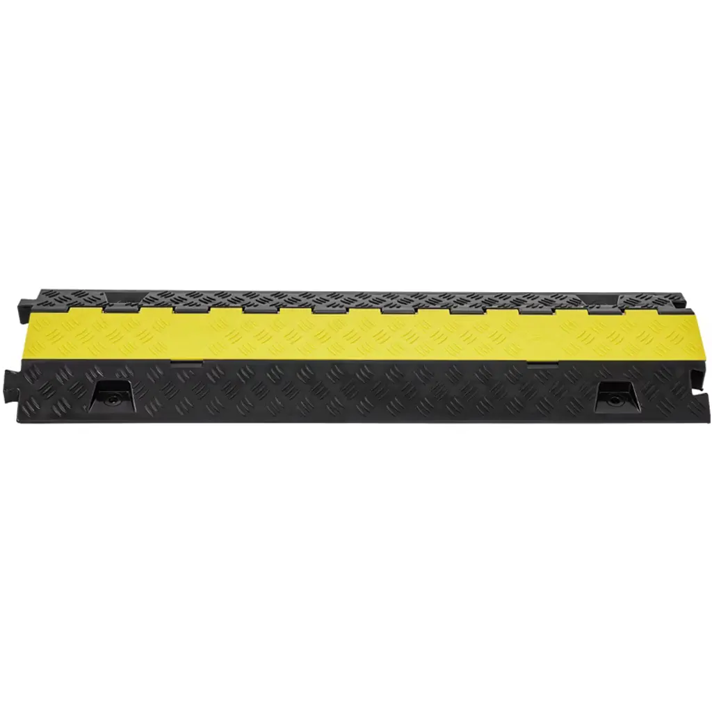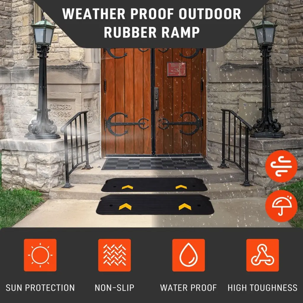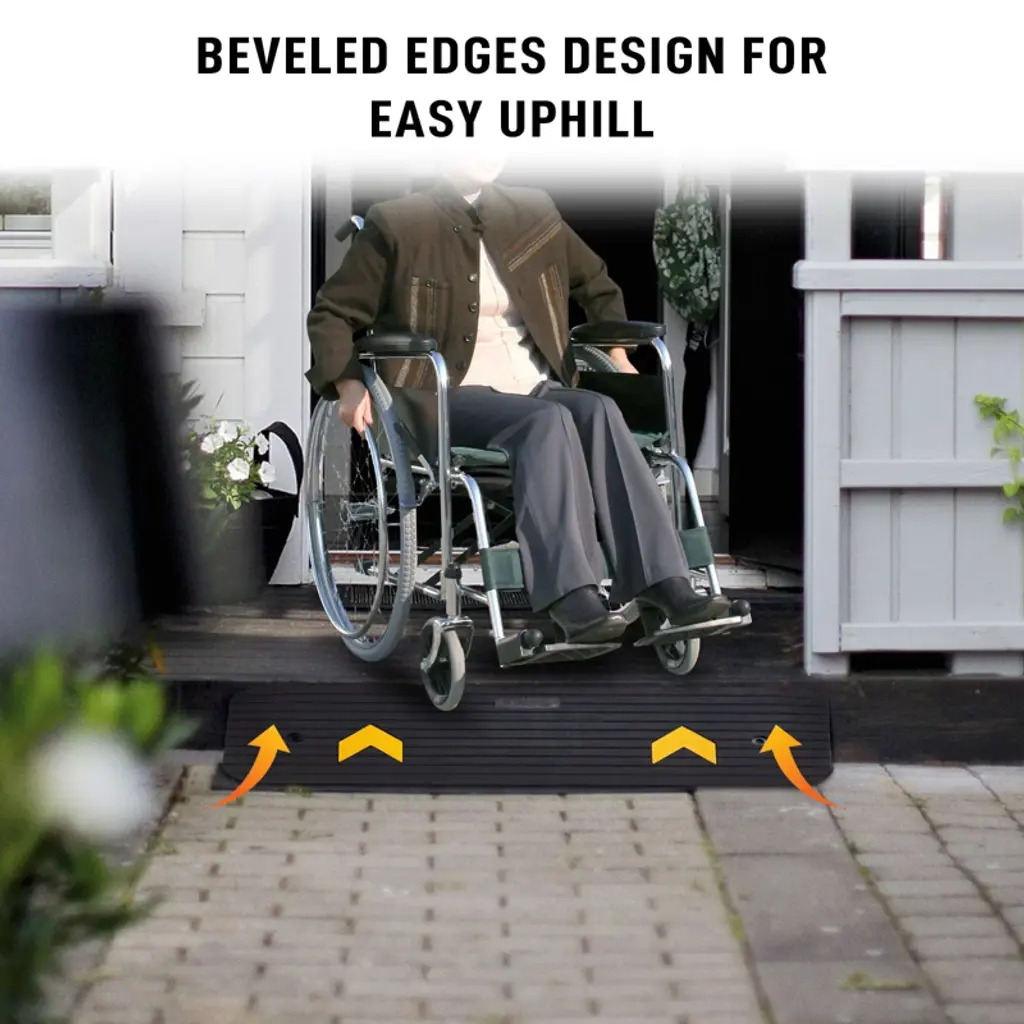 Easily overcome rises with the rubber doorway ramp. The ramp has an impressive can easily support most wheelchairs or power scooters. It is designed to be used both indoors and out. The solid rubber construction easily accommodates gravel and other uneven surfaces and is safe in all weather conditions due to the non-slip textured surface. For added convenience, this threshold ramp includes 3 bottom channels that are ideal for containing hoses, cables, wires, extension cords, and anything else crossing the doorway that could cause an accident or be a tripping hazard.