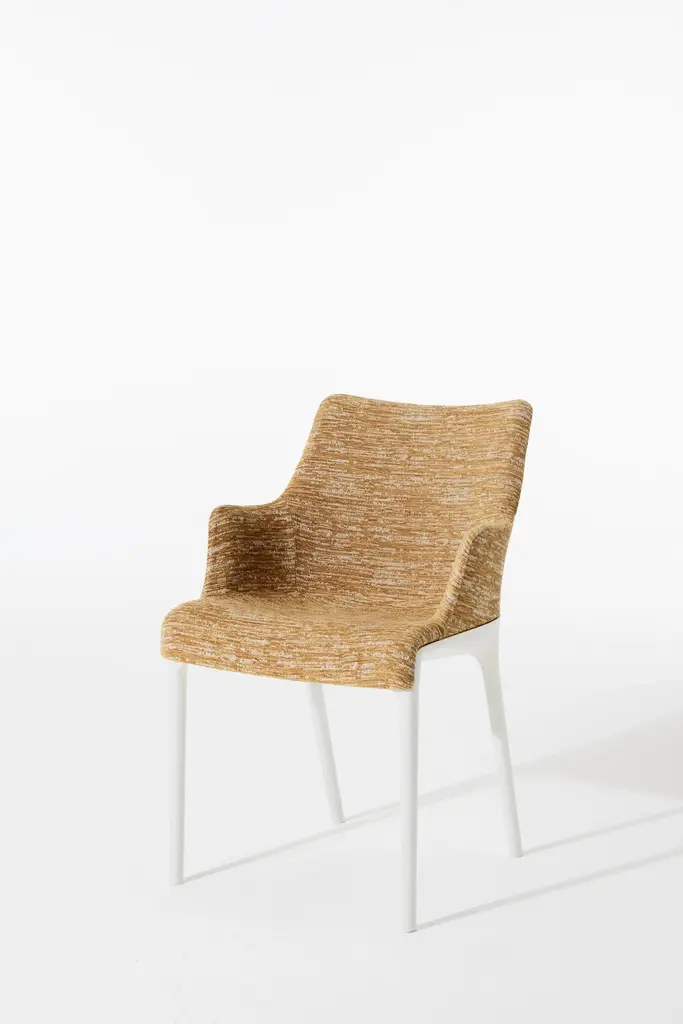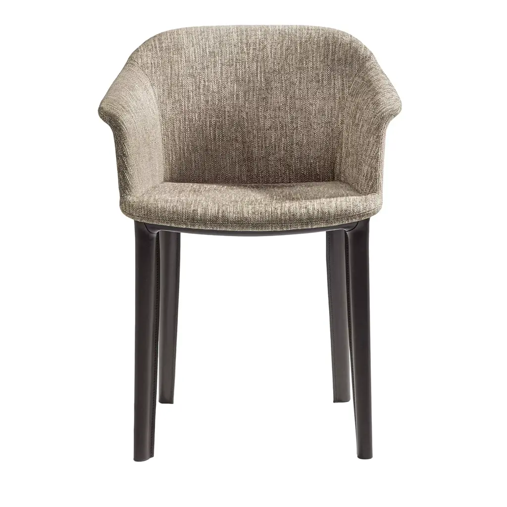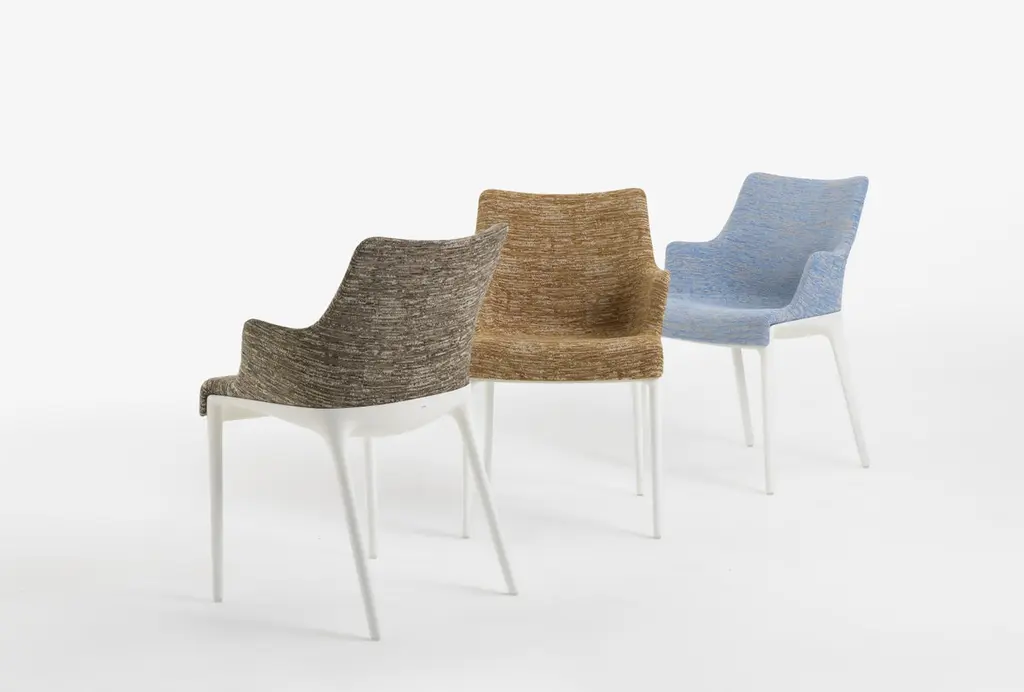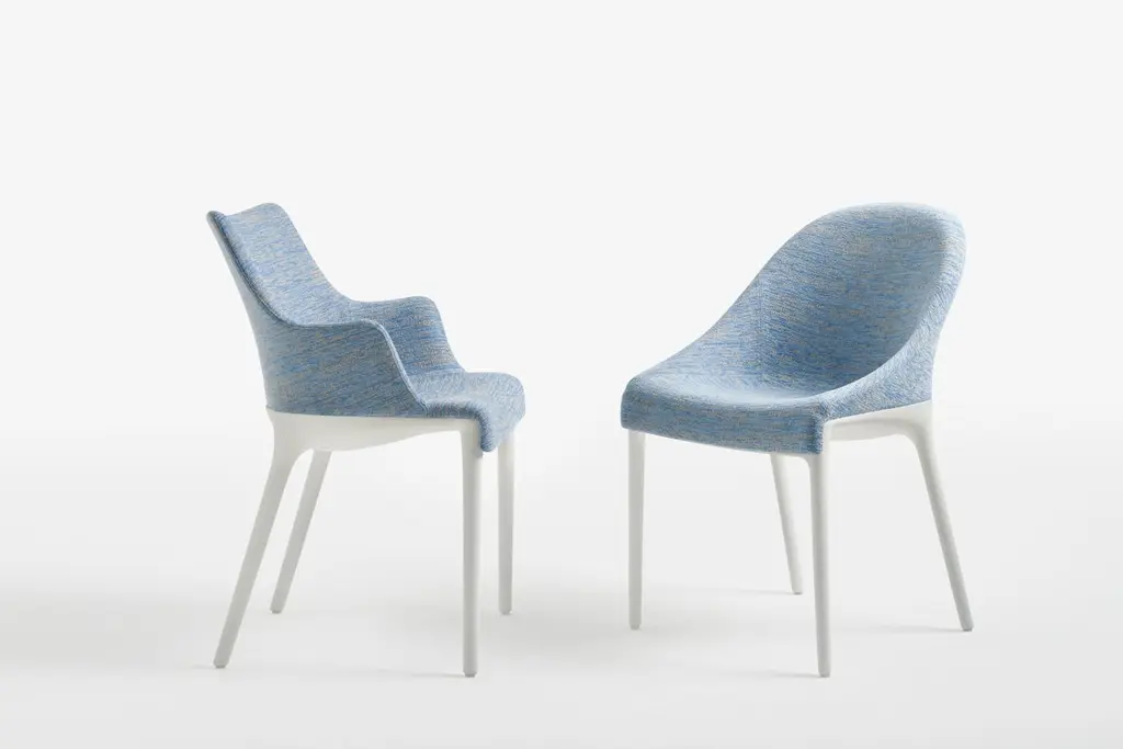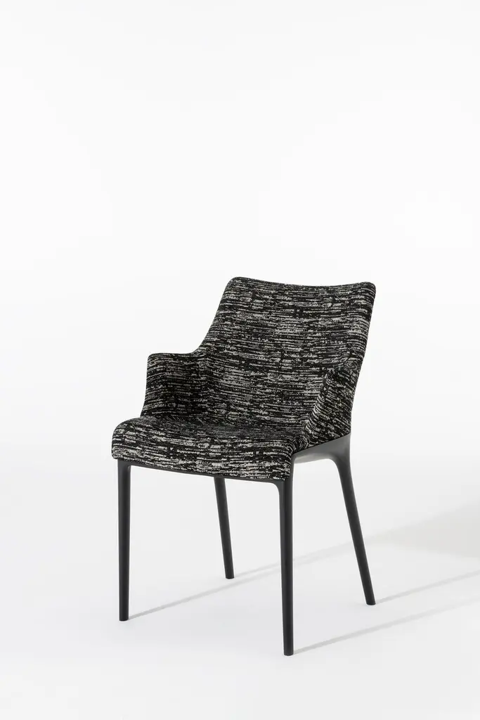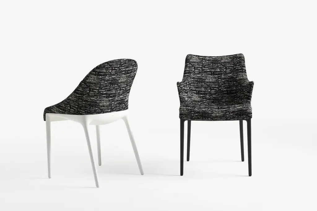 Elegance and its discreet charm. Philippe Starck has re-thought the essential lines of Italian style with a timeless chair that combines the world of Haute Couture with bon ton. Distinctive features: refinement and discretion, softness and fluidity. This upholstered armchair comes in two versions, Eleganza NIA and Eleganza ELA. Both are sinuous and lightweight forms on which fabric – either mélange or faux leather – plays the lead role, softly covering the lines of the chair.The frame comes in black and white.