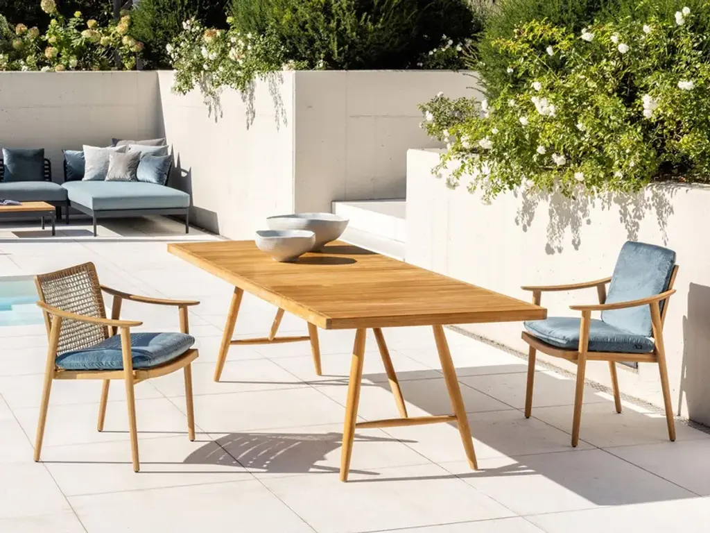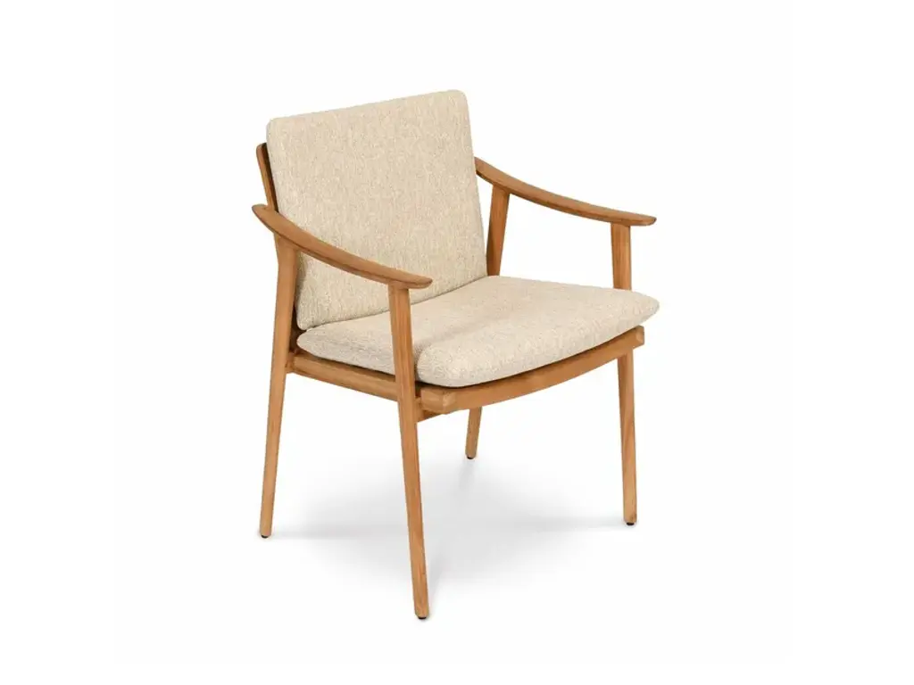 A teak chair with armrests is not just a piece of seating furniture, but a symbol of timeless elegance and the beauty of nature. This special piece of furniture combines comfort and aesthetics in a unique way, making it the perfect addition to any home or garden, and the teak armchair not only embodies the beauty of nature, but also durability.The teak wood used for these armchairs often comes from sustainably managed plantations, making it an environmentally friendly choice. The most eye-catching feature of this teak armchair is its modern but classic design. The curved armrests give it a gentle curve, giving the armchair an inviting and aesthetically attractive shape.The combination of classic elegance and modern refinement makes the KENO chair an outstanding piece of furniture art. In addition to the aesthetic appeal, this teak armchair offers a high level of seating comfort. The generous seat surface and the ergonomic design of the backrest, together with the comfortable cushions, make this possible in a successful way.KENO is available with backrests in teak or with wicker made from the new, robust and weather-resistant fm-rope twist. KENO cuts a fine figure everywhere.
