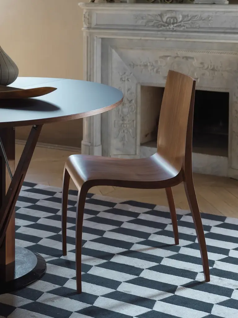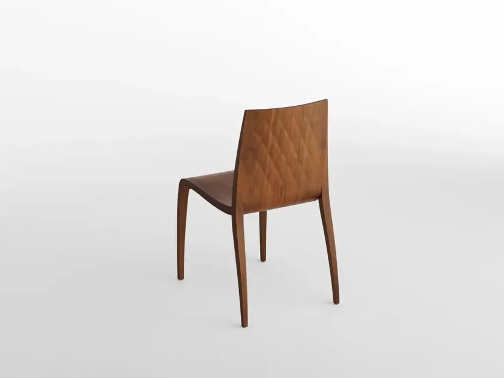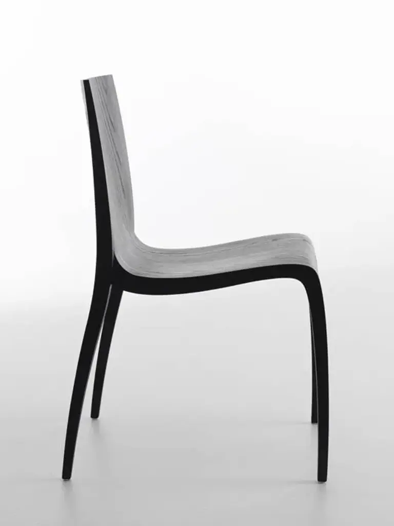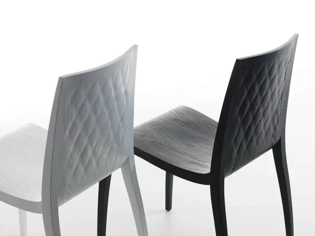 In the Japanese culture, the “ki” represents the energy found in every element. It is the inspiration for the challenging formal research that Mario Bellini solved with refined and modern taste. The result is a sinuous, lightweight seat, partly due to its polyurethane foam inside. The back, embellished with an embossed decoration reminiscent of the diamond pattern of stitched fabric upholstery, is the formal feature for a chair that combines simplicity, elegance and ergonomics.Stackable chair with structural parts made from solid beech, veneered and/or stained and/or lacquered. Internal support made from injected polyurethane. Transparent PVC feet. Weight: 3.7 Kg / 8.15 lb. The open pore finish allows you to appreciate the sight and feel of the natural characteristics of the wood, like its veins, colouring and nodes and, of course, its pores. The embossed lacquering is made with special coatings containing mineral powders, usually quartz, that create a finish of a certain degree of roughness depending on the type, thickness and density of the powders that it contains. Embossed lacquering, by virtue of its thickness, is particularly shock and wear resistant as well as scratch resistant.FINISHOpen pore white finish, open pore black finish, blackwhite (the front of the chair is blackwhite veneered, the back is black varnished), walnut, embossed white lacquered, embossed black lacquered