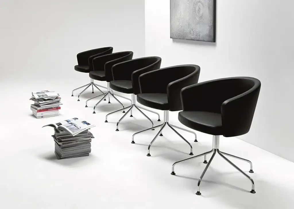 Kicca is an elegant and enveloping upholstered armchair featuring an extensive range of frame typologies, perfect for the hospitality market.