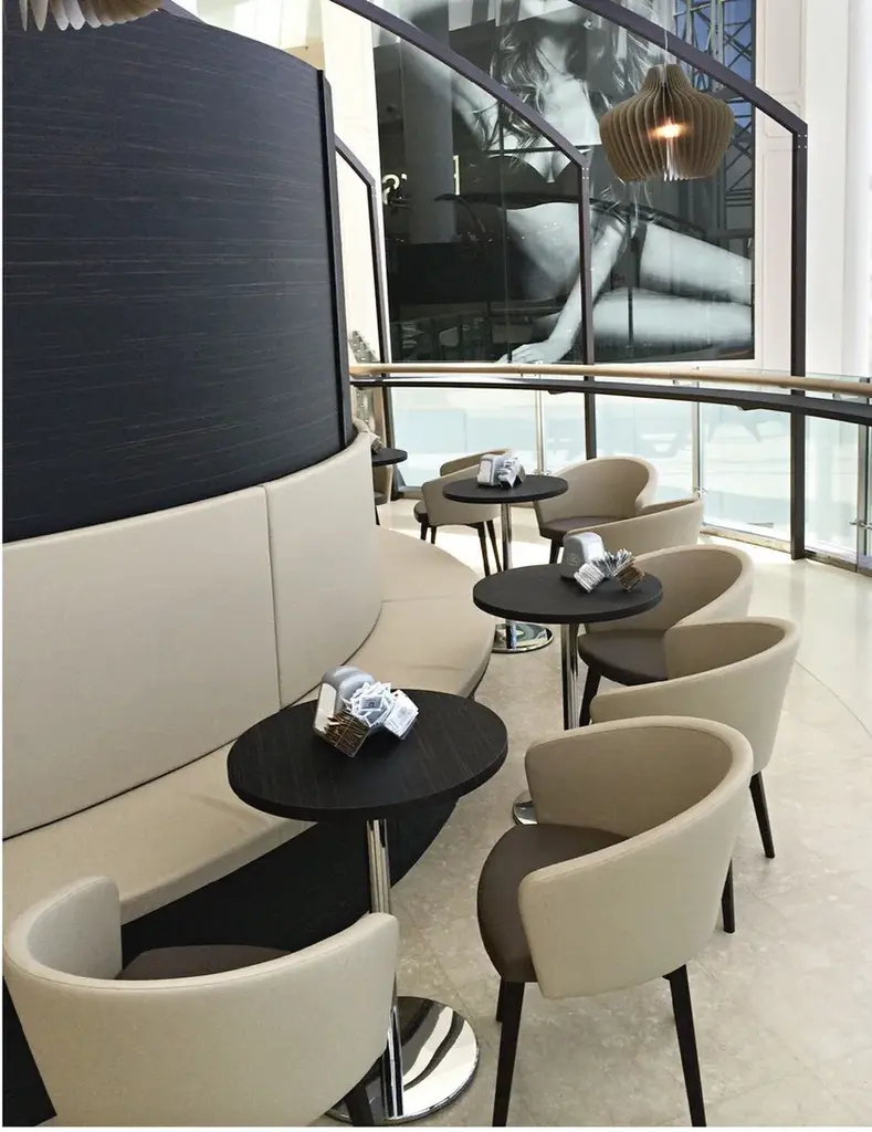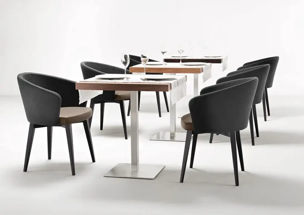 Kicca is an elegant and enveloping upholstered armchair featuring an extensive range of frame typologies, perfect for the hospitality market.