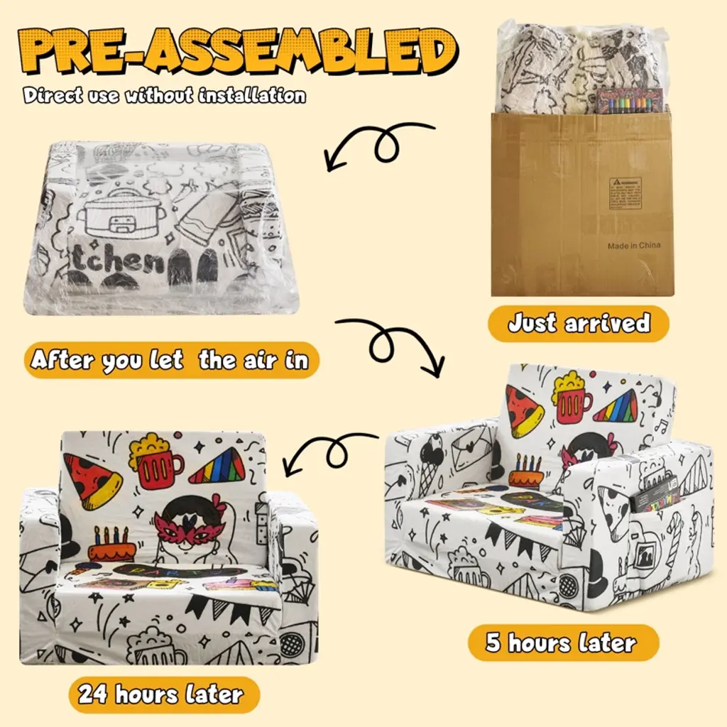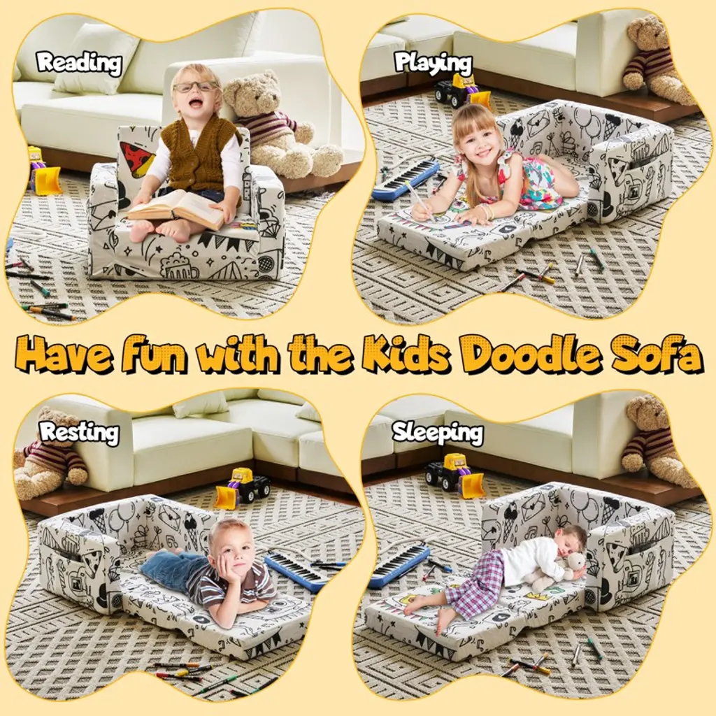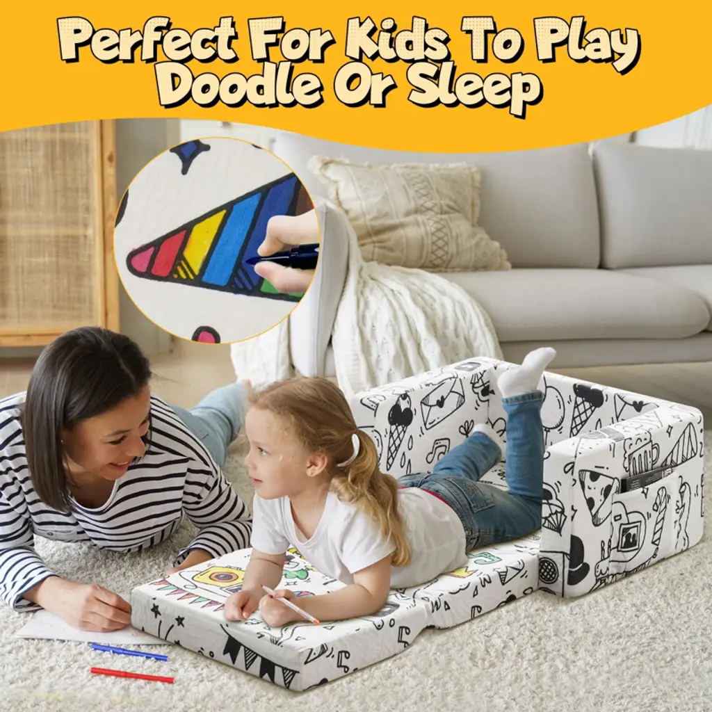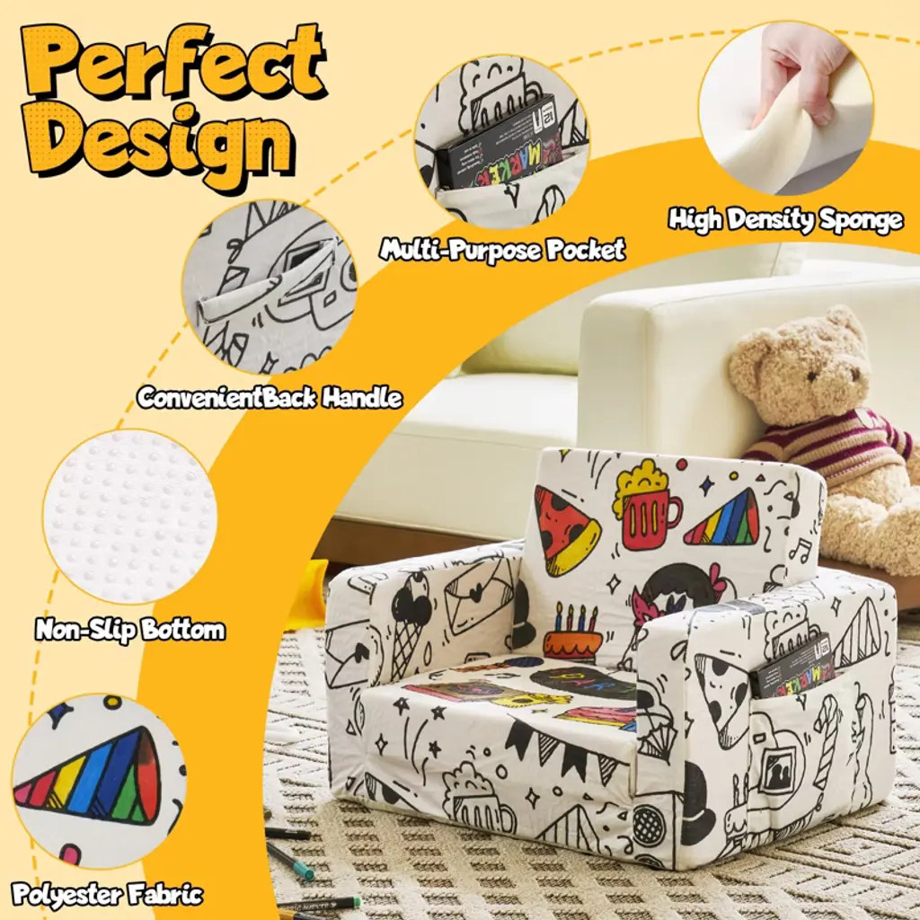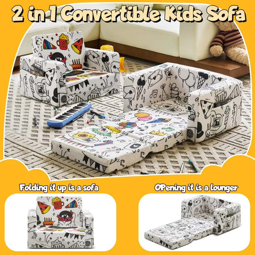 Bring fun, function, and comfort to your little one’s space with this 2-in-1 Convertible Kids Sofa! Designed with vibrant graffiti-style flocking fabric, this adorable piece easily transforms from a cozy sofa into a relaxing lounger — perfect for reading, playing, or napping. Crafted with fuzzy plush fabric for a soft touch, it features child-friendly handles for easy movement and double side pockets for storing books, toys, or snacks. Lightweight yet sturdy, this sofa is ideal for bedrooms, playrooms, or living areas.