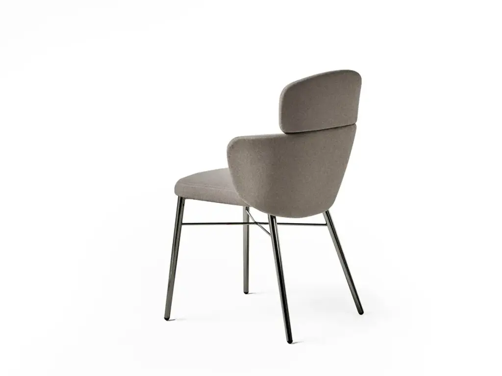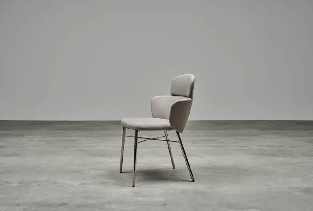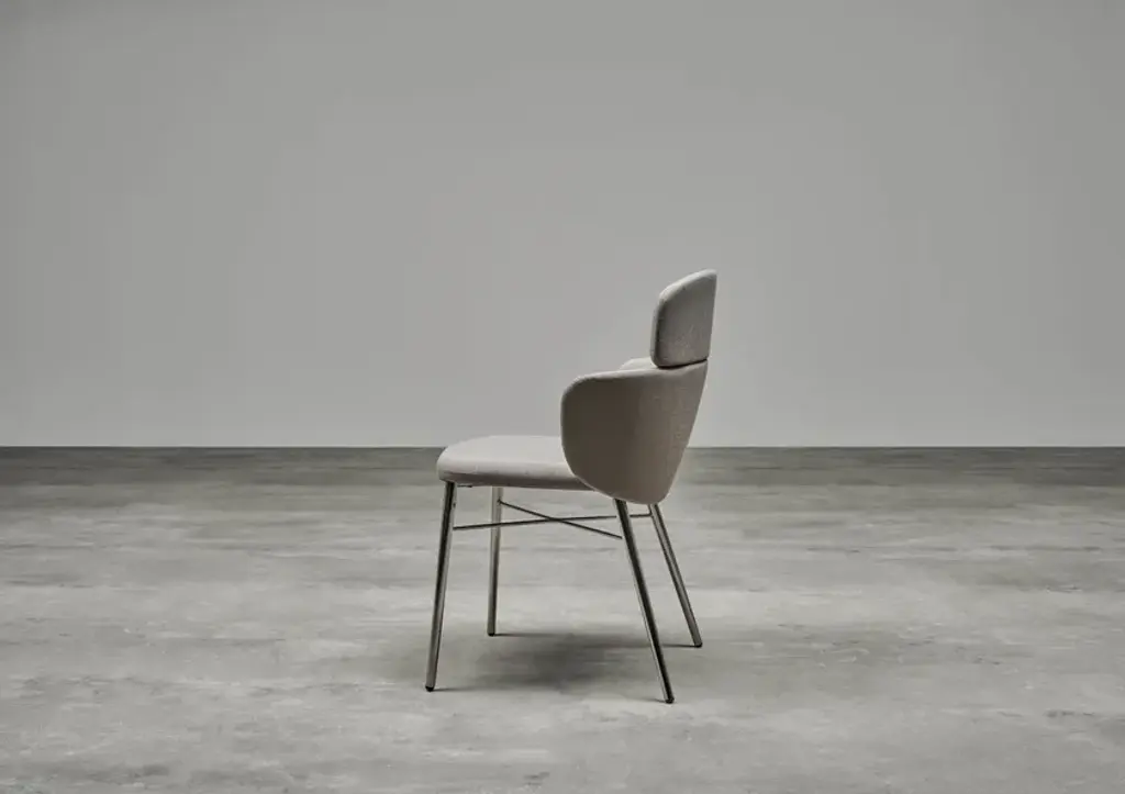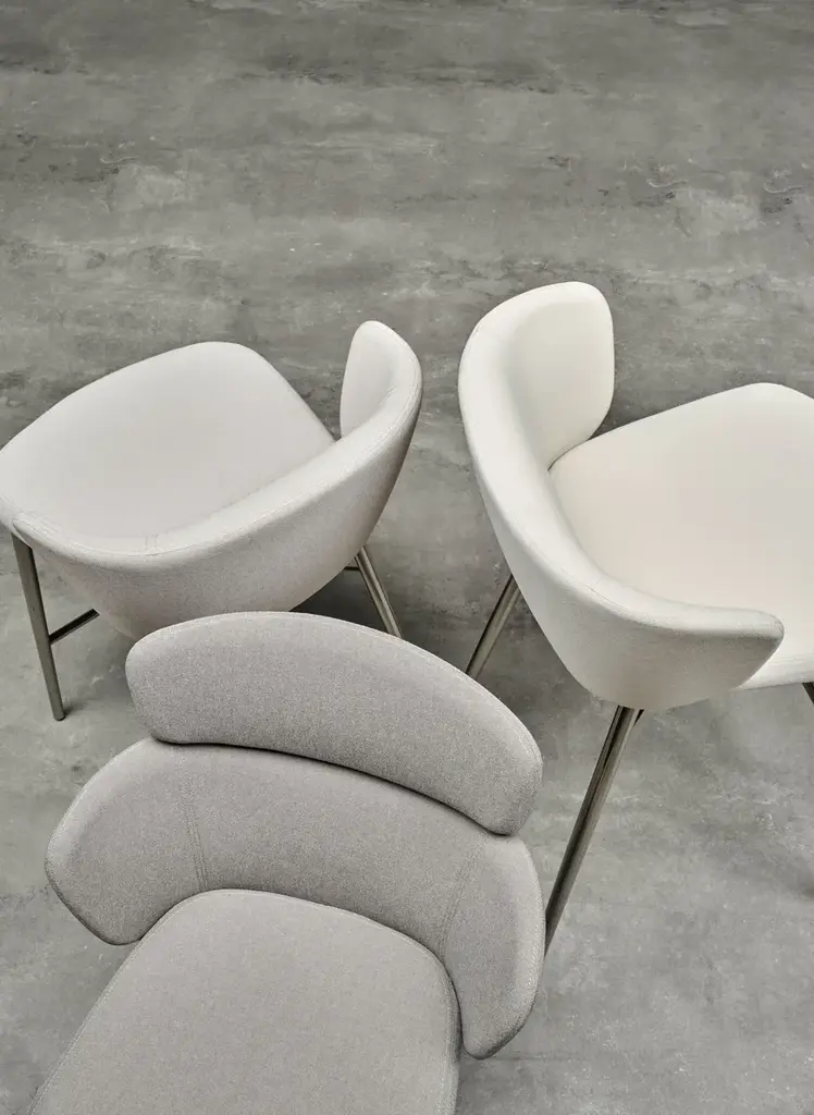 The Kin chair takes inspiration from the Japanese Kintsugi technique, which tends to embrace the value of breakages rather than seeking to conceal them. Reflecting the Japanese tradition, designers Radice and Orlandini have taken the different parts of the frame and put them together in an unprecedented visual solution that conveys a sense of seemingly unstable balance. The bearing structure is hidden from view and the deceptive contrast between the parts can be emphasized with different materials and finishes. One of the practical benefits of the irregular shape is the compact size of the armrests, which provide sufficient support without being too bulky, allowing the chair to fit comfortably under a table.Chairs with mini armrests with structures made of matt black RAL 9005 or metallic silver epoxy powder coated, chrome steel tubes. Flexible polyurethane backrest, cold, processed without CFC.