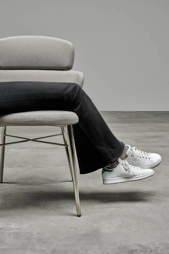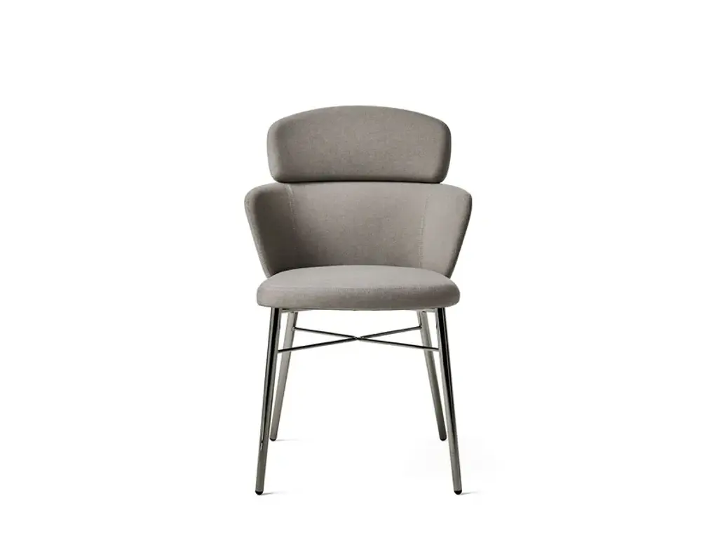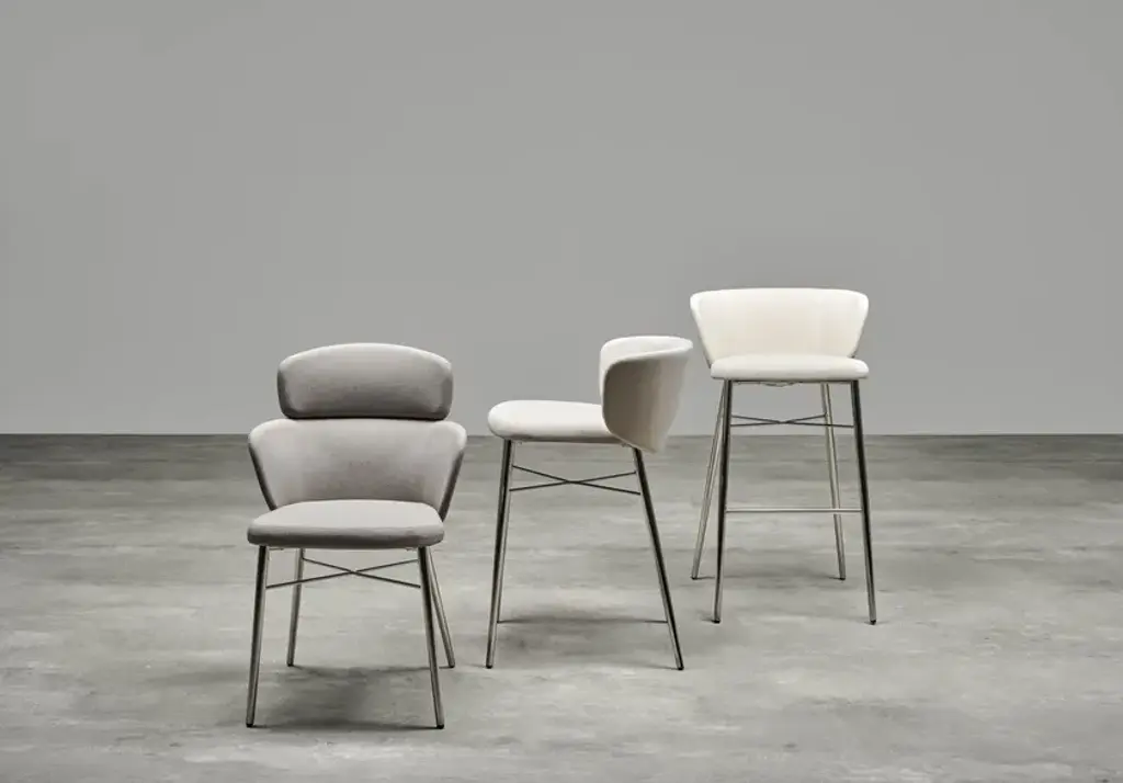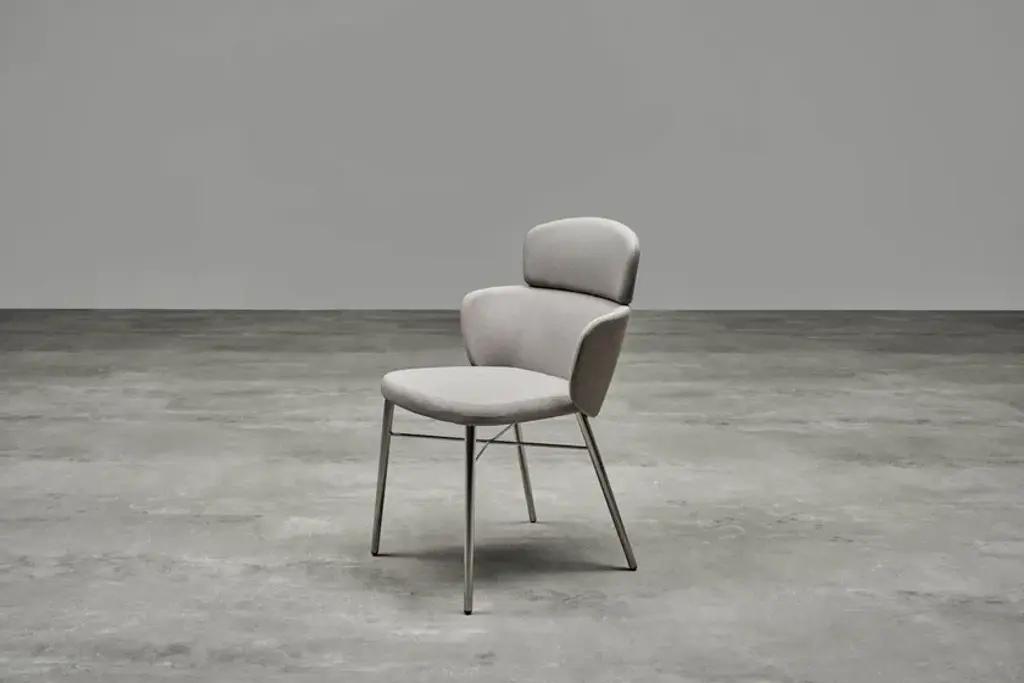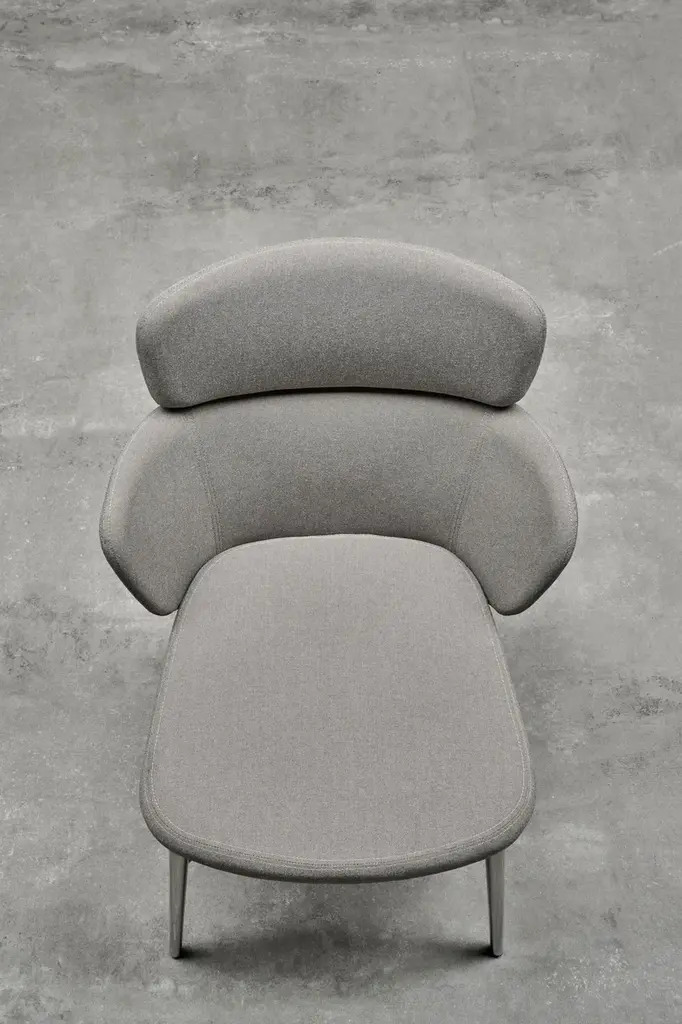 The Kin chair takes inspiration from the Japanese Kintsugi technique, which tends to embrace the value of breakages rather than seeking to conceal them. Reflecting the Japanese tradition, designers Radice and Orlandini have taken the different parts of the frame and put them together in an unprecedented visual solution that conveys a sense of seemingly unstable balance. The bearing structure is hidden from view and the deceptive contrast between the parts can be emphasized with different materials and finishes. One of the practical benefits of the irregular shape is the compact size of the armrests, which provide sufficient support without being too bulky, allowing the chair to fit comfortably under a table.Chairs with mini armrests with structures made of matt black RAL 9005 or metallic silver epoxy powder coated, chrome steel tubes. Flexible polyurethane backrest, cold, processed without CFC.