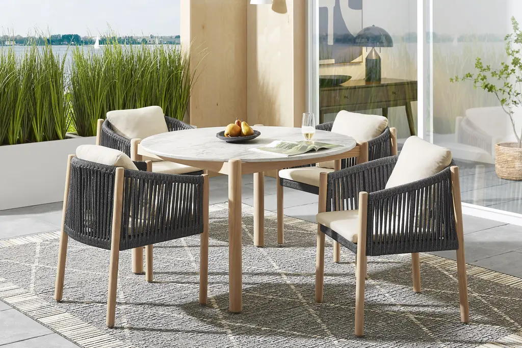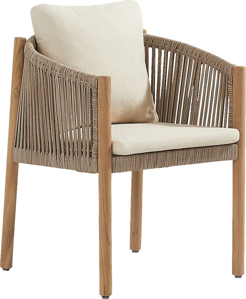 A wave of pure ease carries you into effortless bliss as the Koda collection nestles every moment in the indulgent luxury of a sailboat gliding through seas made of glass. All-weather rope in colorfast charcoal coils around a frame of rust resistant aluminum, running parallel to solid teak legs in a natural finish. Outdoor cushions in beige offer the perfect touch of durable softness to this ideal dining companion.