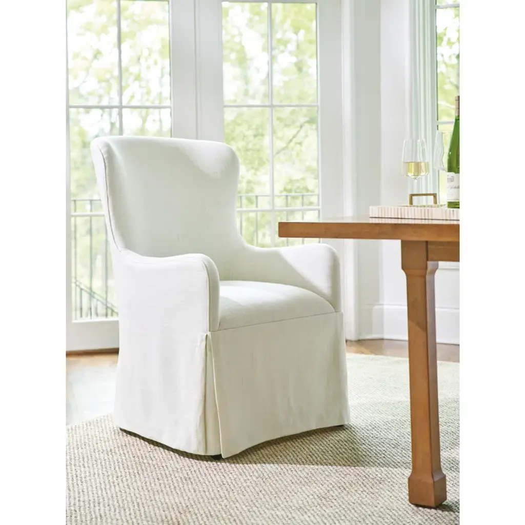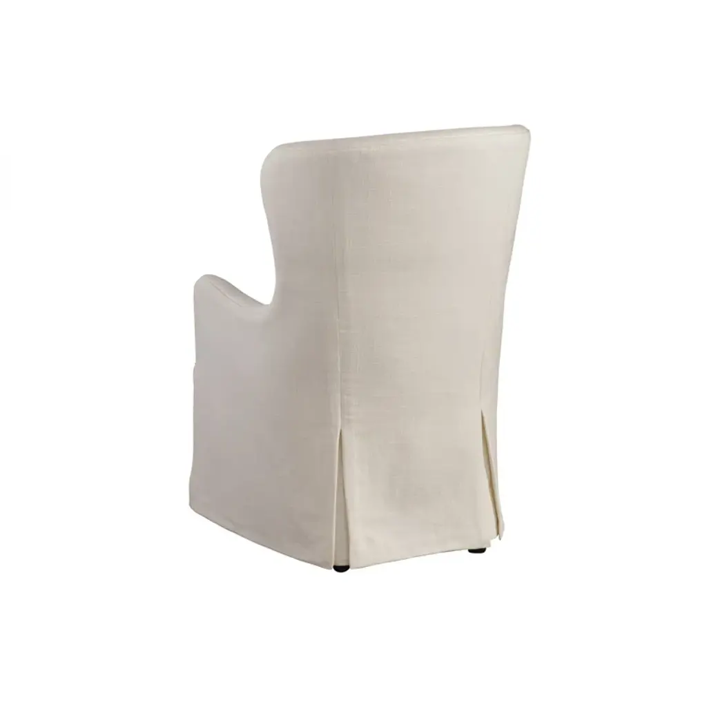 The casual elegance of the Aliso host chair is highlighted by the graceful curve of the barrel back and the tailored look of the dressmaker skirt. The chair is standard with casters. The standard fabric is 2275-12 Coastline, which is a performance fabric with a soft hand in a linen-white coloration.