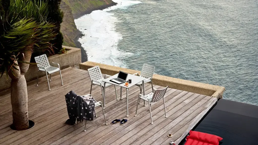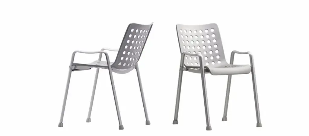 Developed for the 1939 Swiss National Exhibition (Schweizer Landesausstellung), the Landi Chair occupies an important place in the history of twentieth-century design: this classic by Hans Coray established the new typology of a three-dimensionally moulded seat shell on a separate base. The clear structure of the all-aluminium chair consists of two parts. First, a pair of U-shaped profiles connected by welded crossbeams form a self-supporting frame and simultaneously serve as the legs and low armrests. This base supports a seat shell, which makes ideal use of the material’s possibilities: the 91 punched holes not only ensure the modest weight and flexibility of the comfortable shell, but also give the graceful Landi its trademark appearance.The lightweight, stackable Landi Chair is robust and weather-resistant. Technical innovation, optimal use of materials, minimalist forms and understated elegance are the elements that have made the Landi Chair into a classic over the years, which looks as fresh and vital today as ever.Materials:- Seat shell: seat shell in pressed aluminium sheeting with 91 punched holes, matte anodised surface.- Base: armrests and legs from bent aluminium profiles, with welded aluminium cross braces, matte anodised surface.- Glides: glides in light grey injection-moulded TPE.- Applications: suitable for outdoor use.- Note: as in the original design, the Landi Chair can be stacked up to 6 units high. Vitra‘s re-edition of the classic stays true to the original while making the most of the latest technical possibilities. The anodised aluminium surface of the chair is durable and weather-resistant but may develop signs of wear and tear if the chairs are stacked.