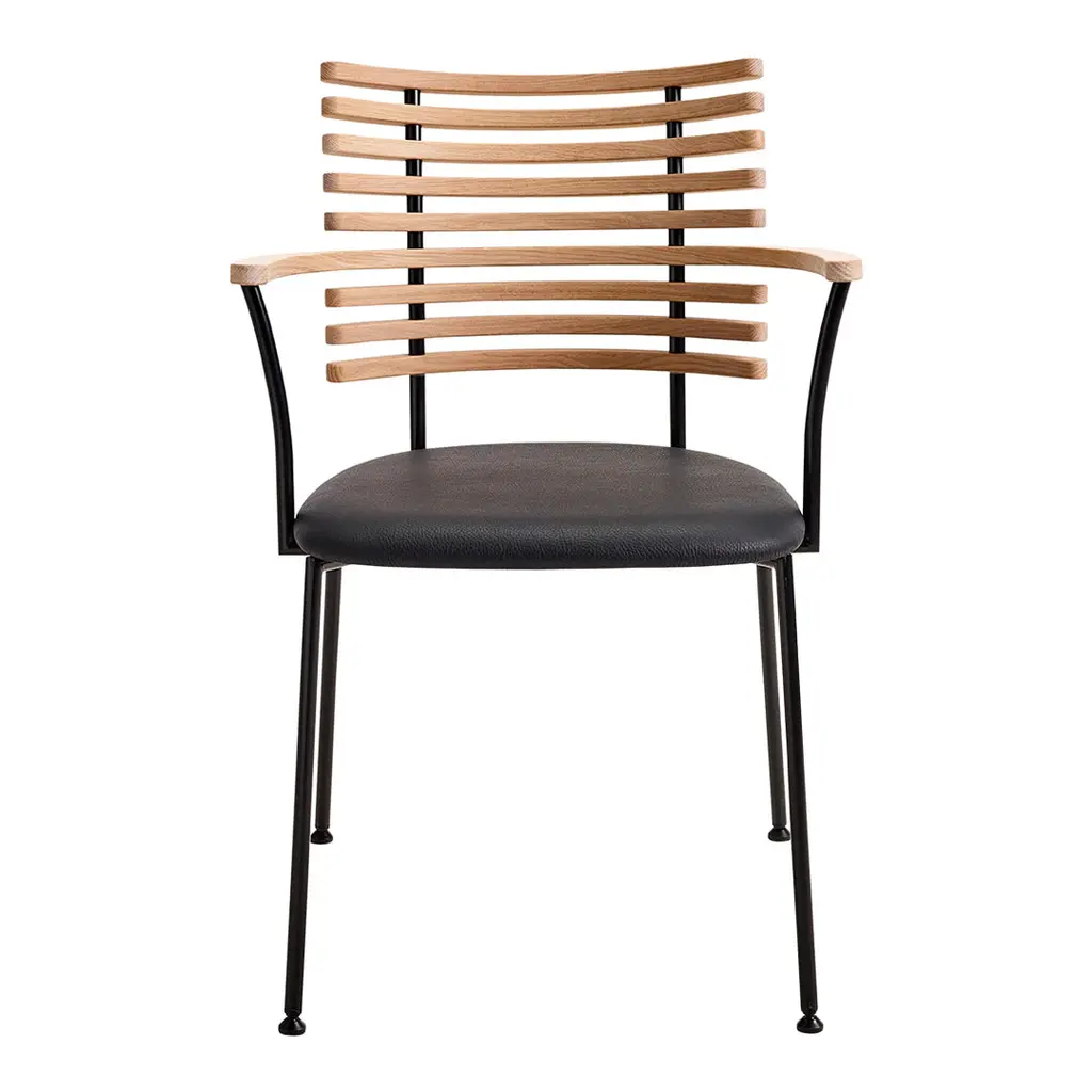 The Langue Chair stands out with its distinctively curved seat, modeled after the shape of a tongue. It emphasizes a flowing, organic silhouette that is designed to follow the bodys shape. This organic shape starts wide at the front, offering ample seating space, and tapers as it moves toward the back, almost hugging the body for support. The back of the chair curves gently to cradle the spine, enhancing comfort during longer periods of use. Available with a steel base in black and armrests in 4 oak finishes. Upholstered in a range of high performance fabric and leather for even more added comfort.