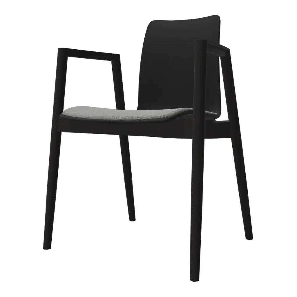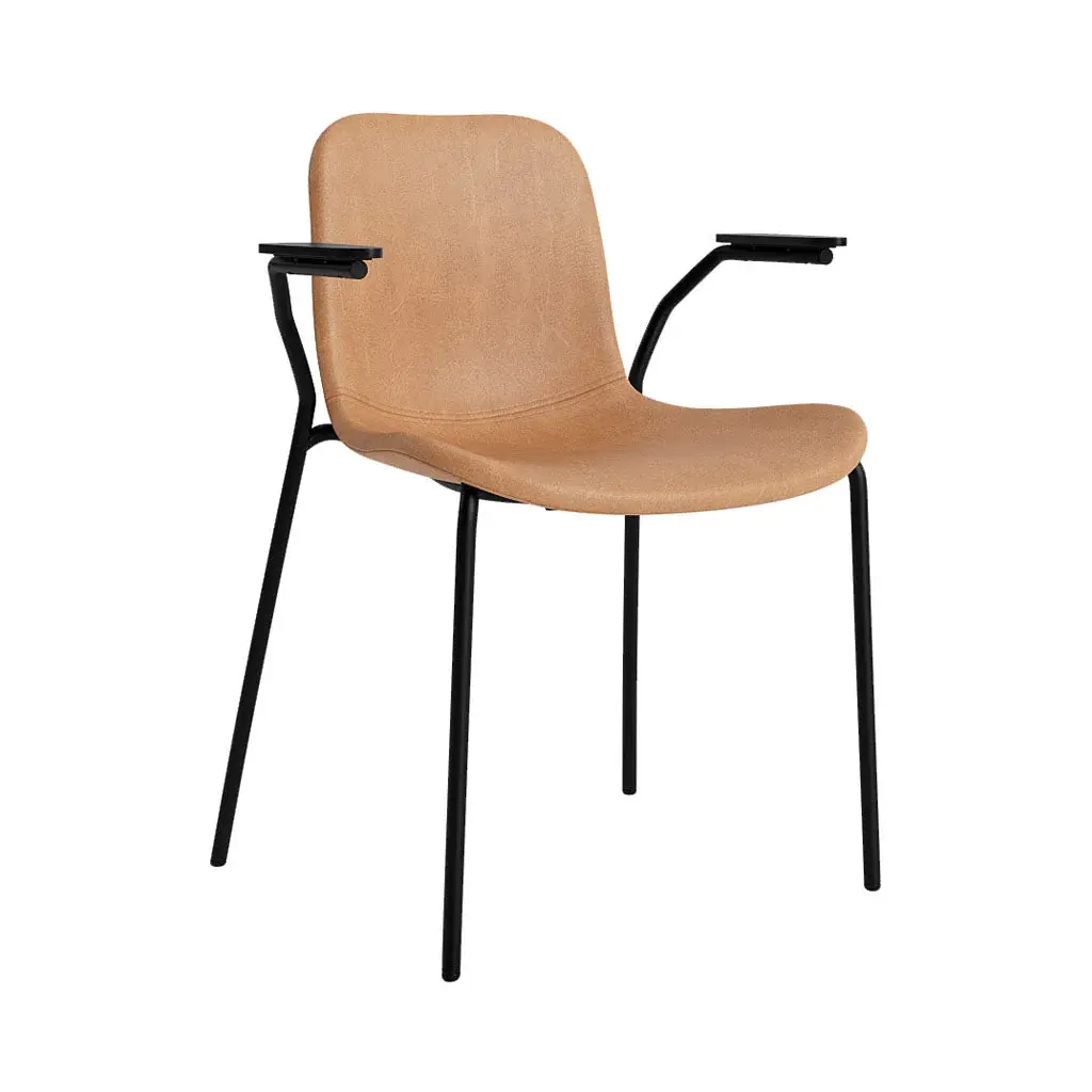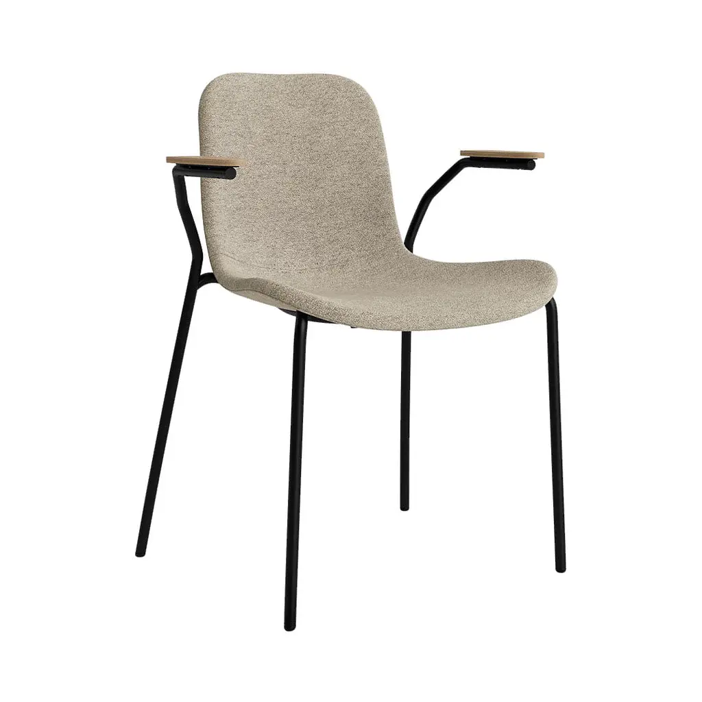 The Langue Chair stands out with its distinctively curved seat, modeled after the shape of a tongue. It emphasizes a flowing, organic silhouette that is designed to follow the bodys shape. This organic shape starts wide at the front, offering ample seating space, and tapers as it moves toward the back, almost hugging the body for support. The back of the chair curves gently to cradle the spine, enhancing comfort during longer periods of use. Available with a steel base in black and armrests in 4 oak finishes. Upholstered in a range of high performance fabric and leather for even more added comfort.