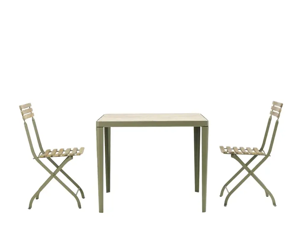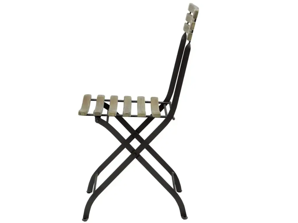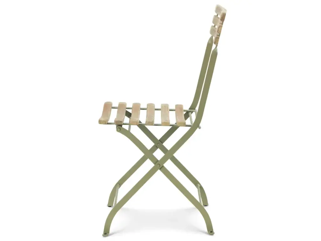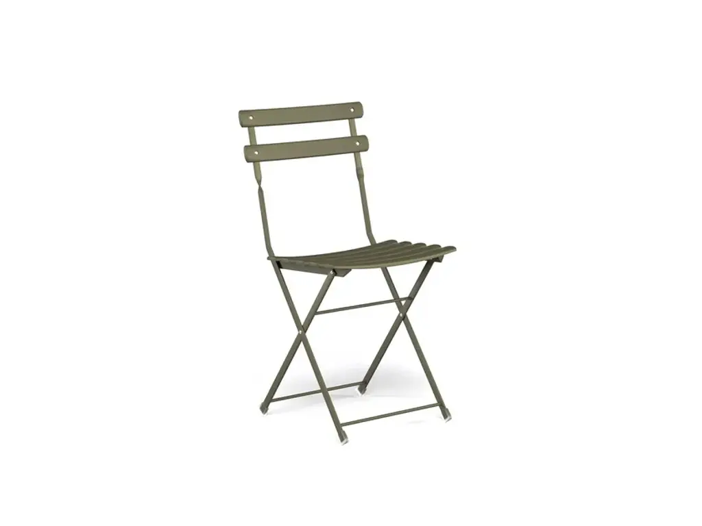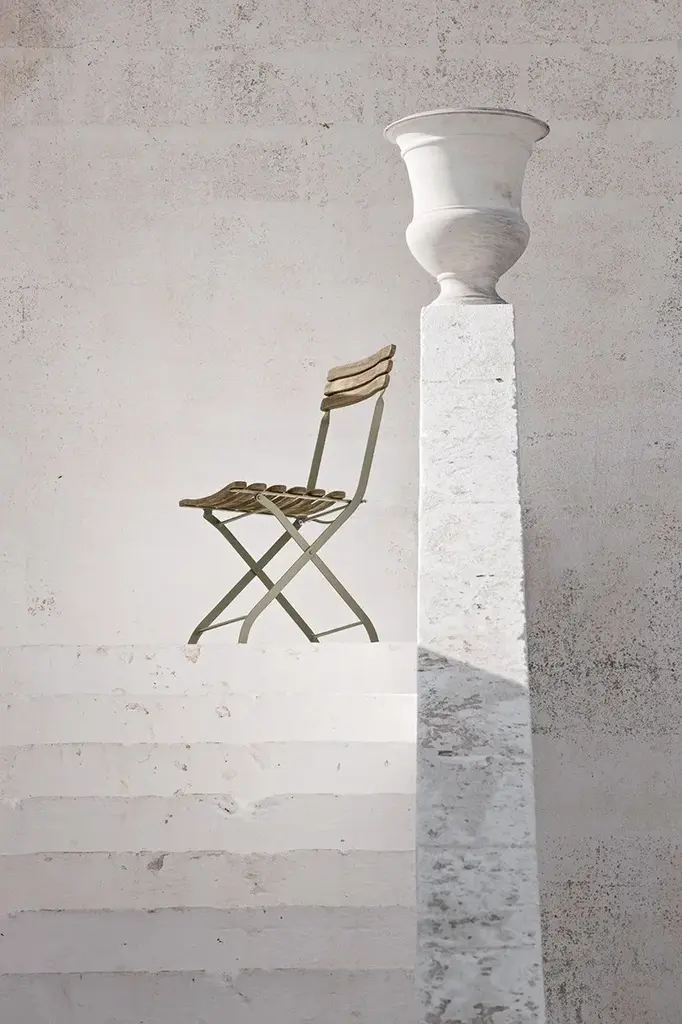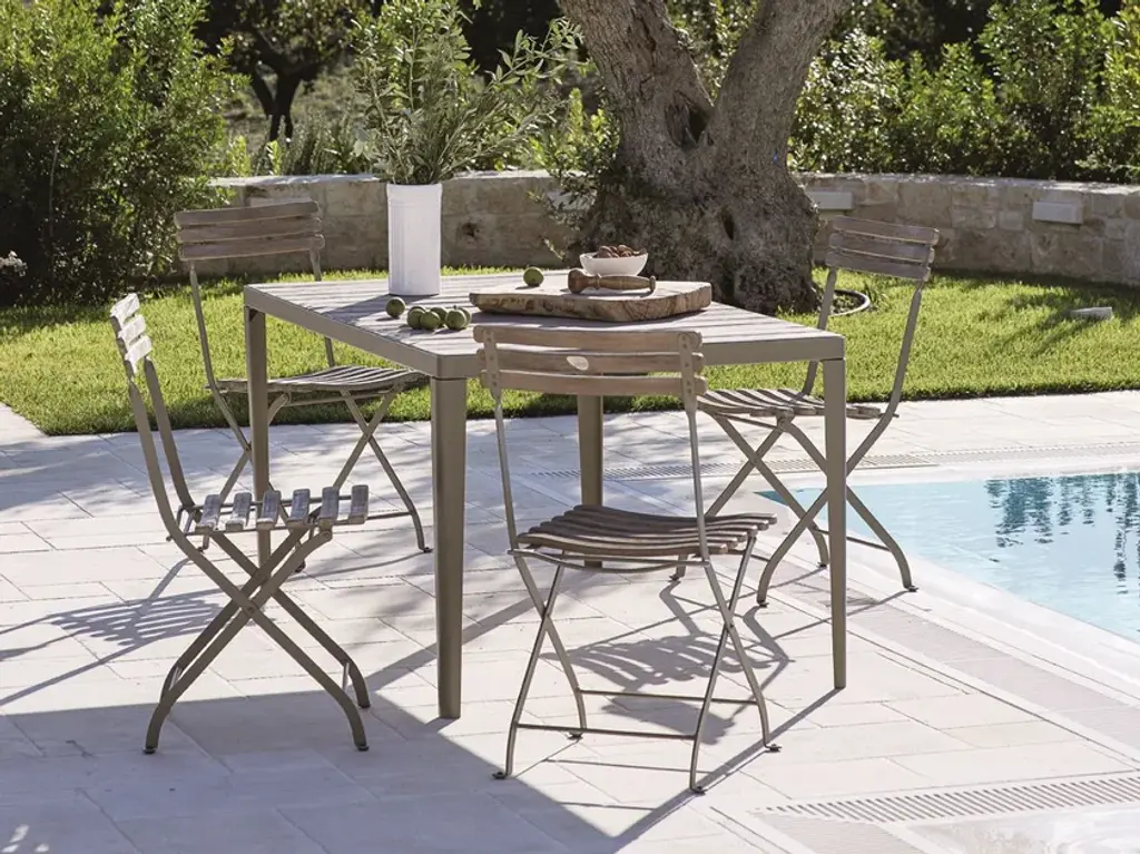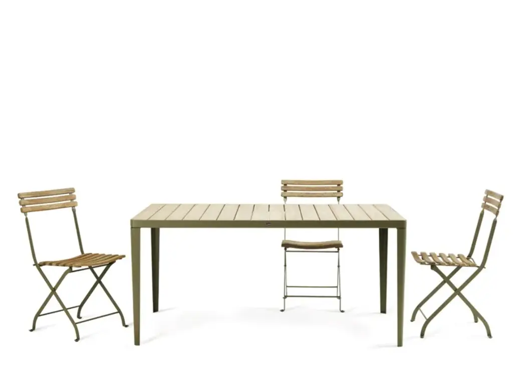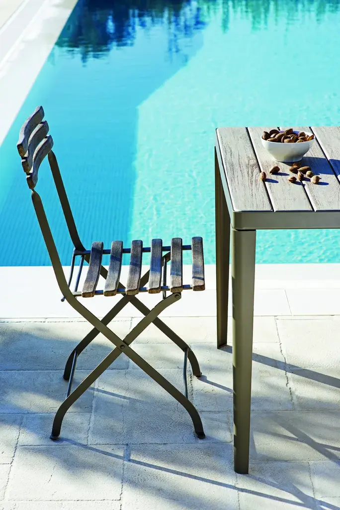 LAREN is a chair in metal and pickled teak. Available in three versions: stackable, folding, with armrests, high stool.As well-loved in the home as it is in public spaces, the LAREN collection has been expanded with new elements, in pickled and natural teak together with painted metal: high tables of different sizes, a high stool and further variants of the chair.