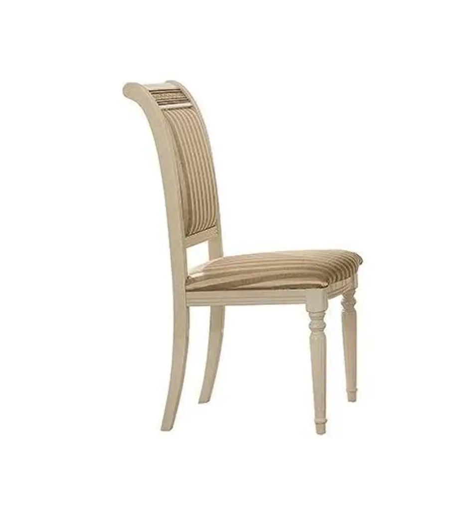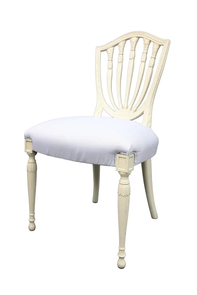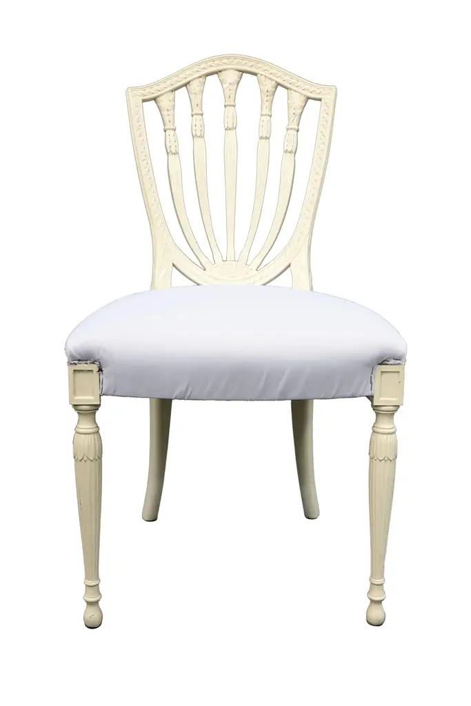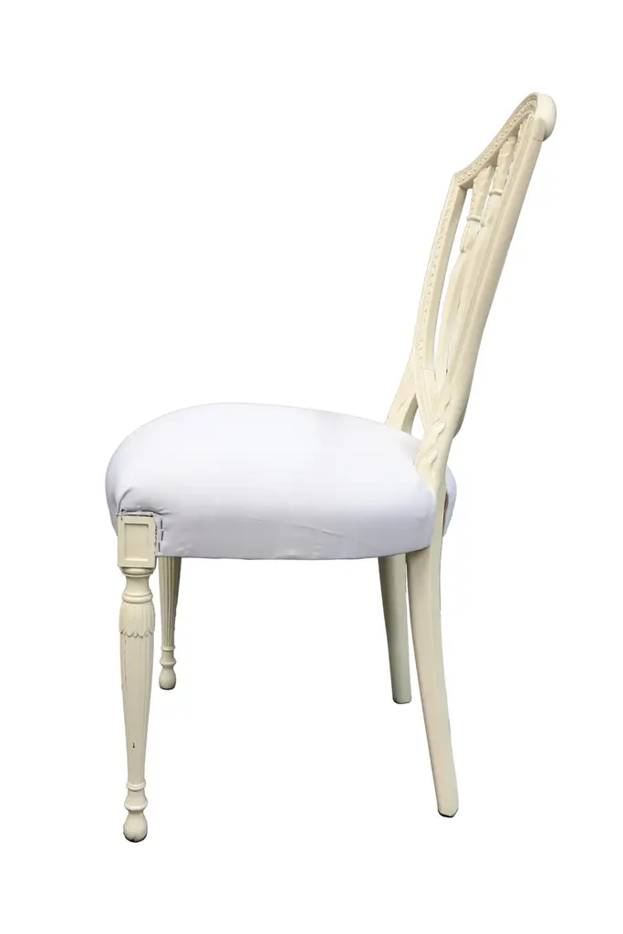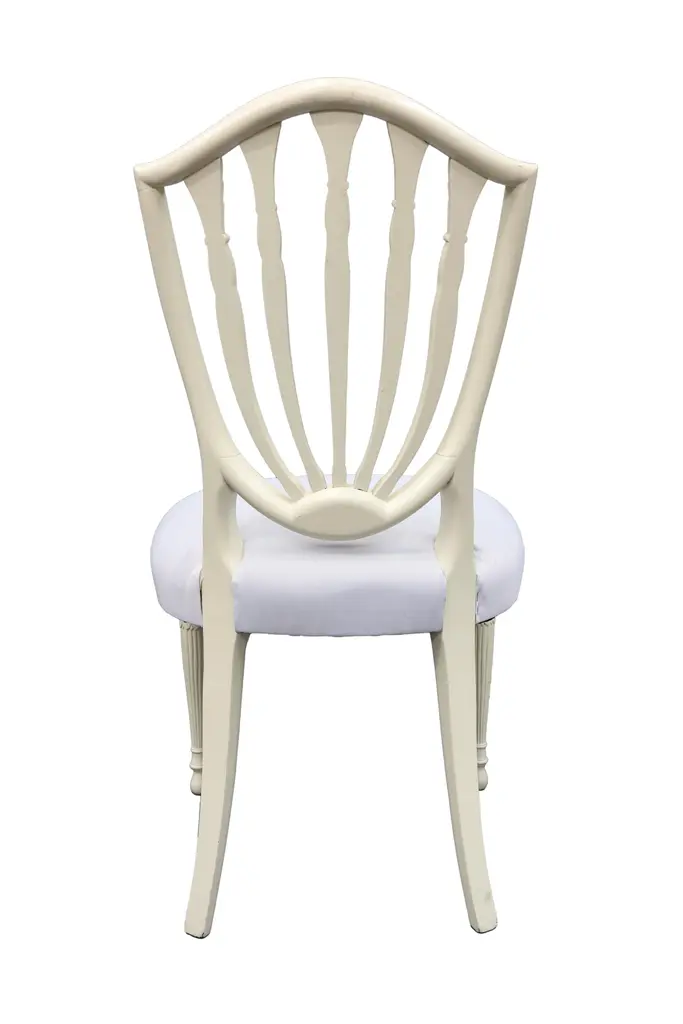 White upholstered chair with tapered legs and palm trees carved into the bars of the back of the chair.