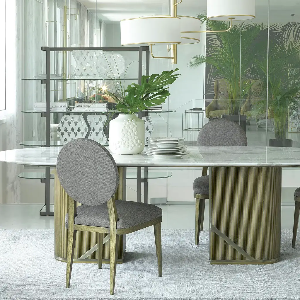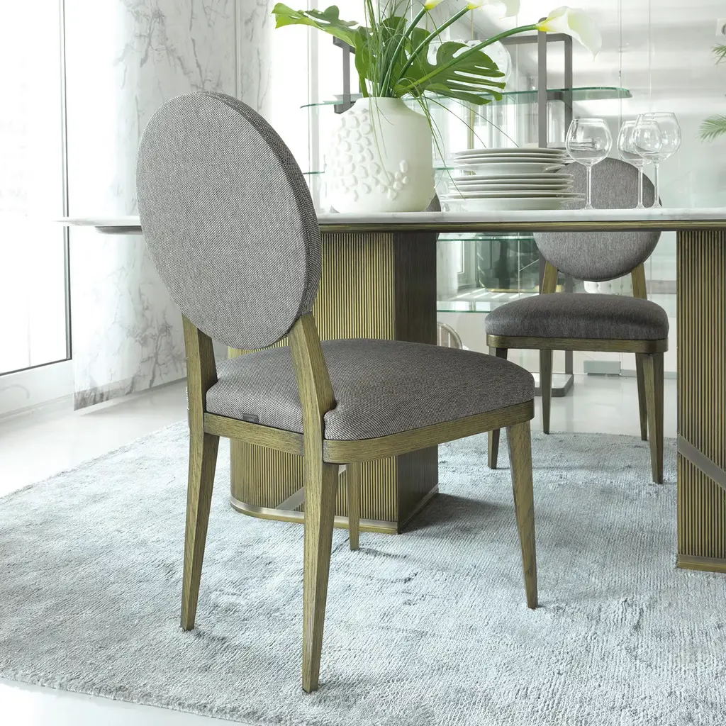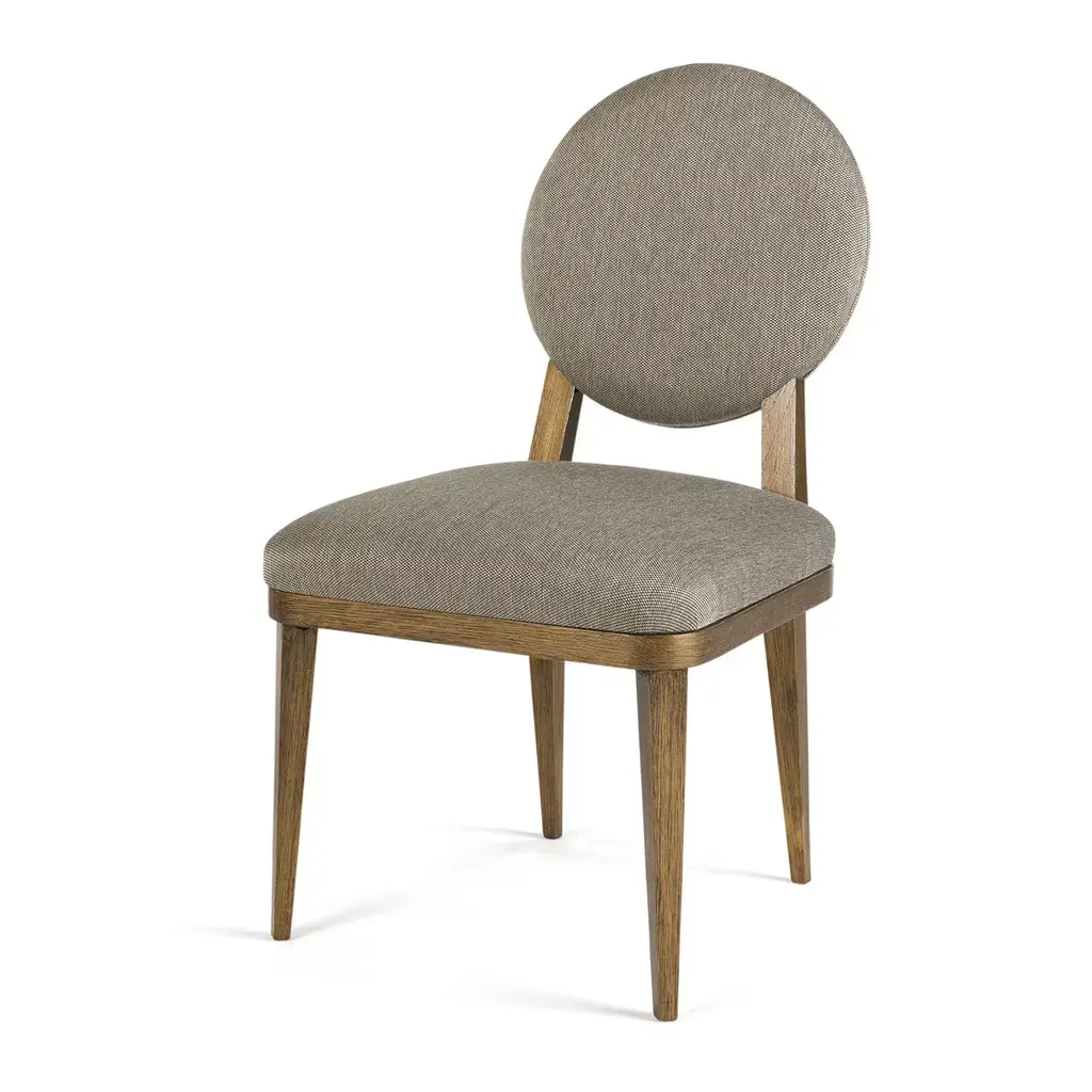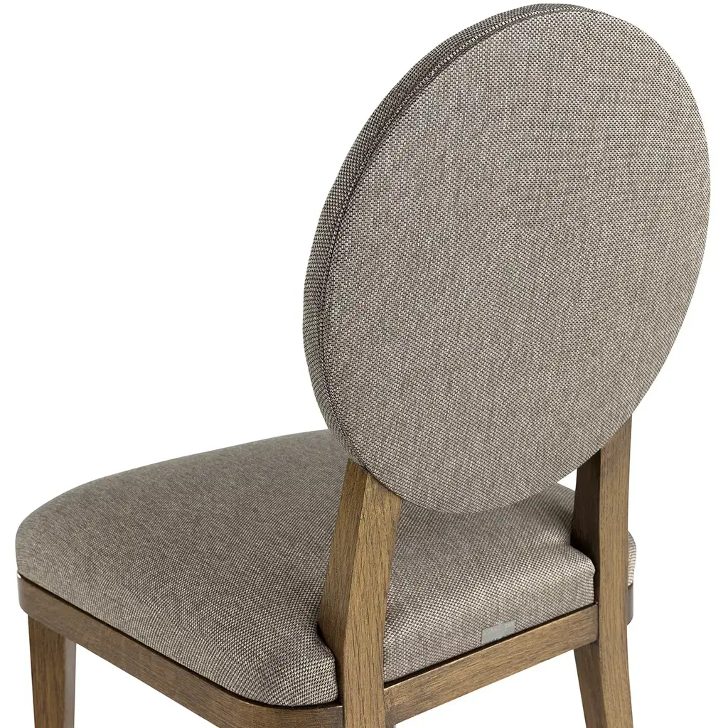 This elegant chair was crafted of solid durmast oak with a stunning finish that gives a unique bronzed brass effect to the natural grain of the wood of the four feet and the back structure connecting the seat with the oval backrest. The comfort of the piece is guaranteed by cushions that are upholstered in a light grey fabric. It is possible to add the Borbonese logo embroidered on the external back upon request - please ask the concierge for the change in price with this option.